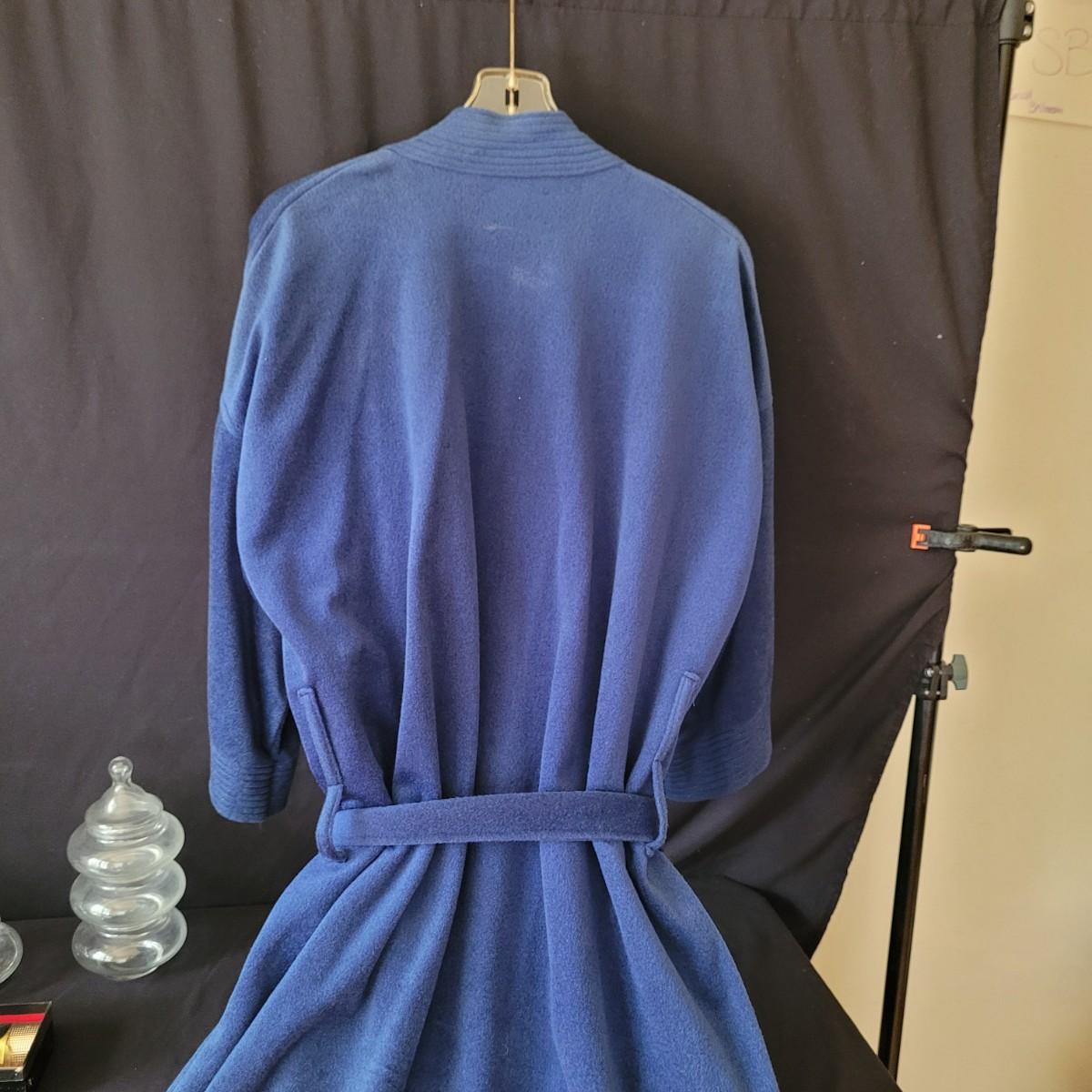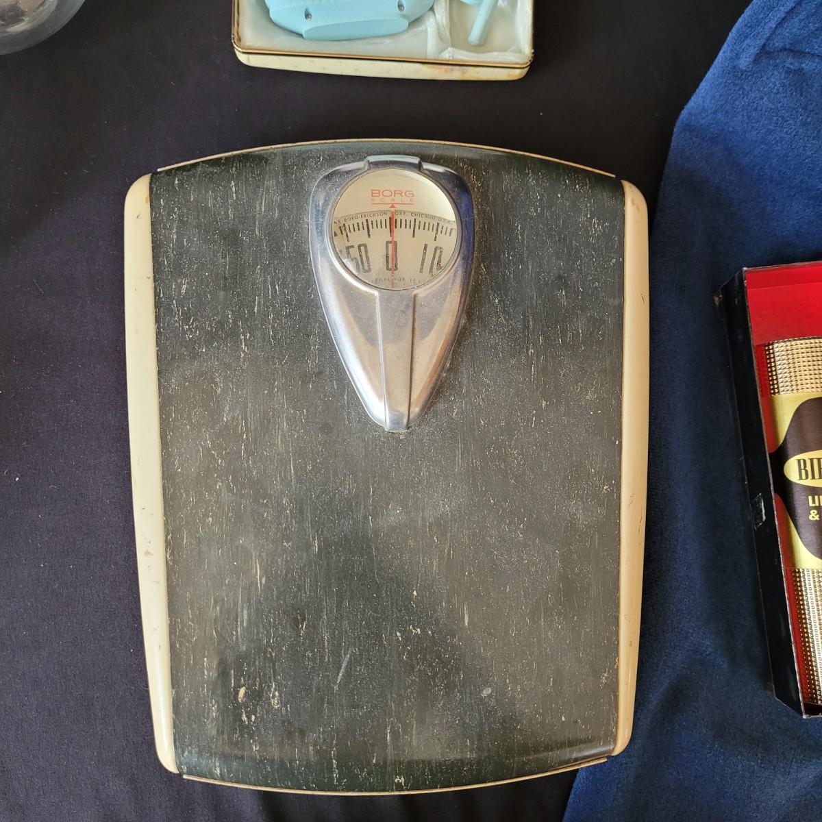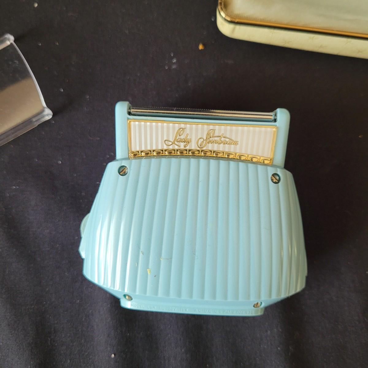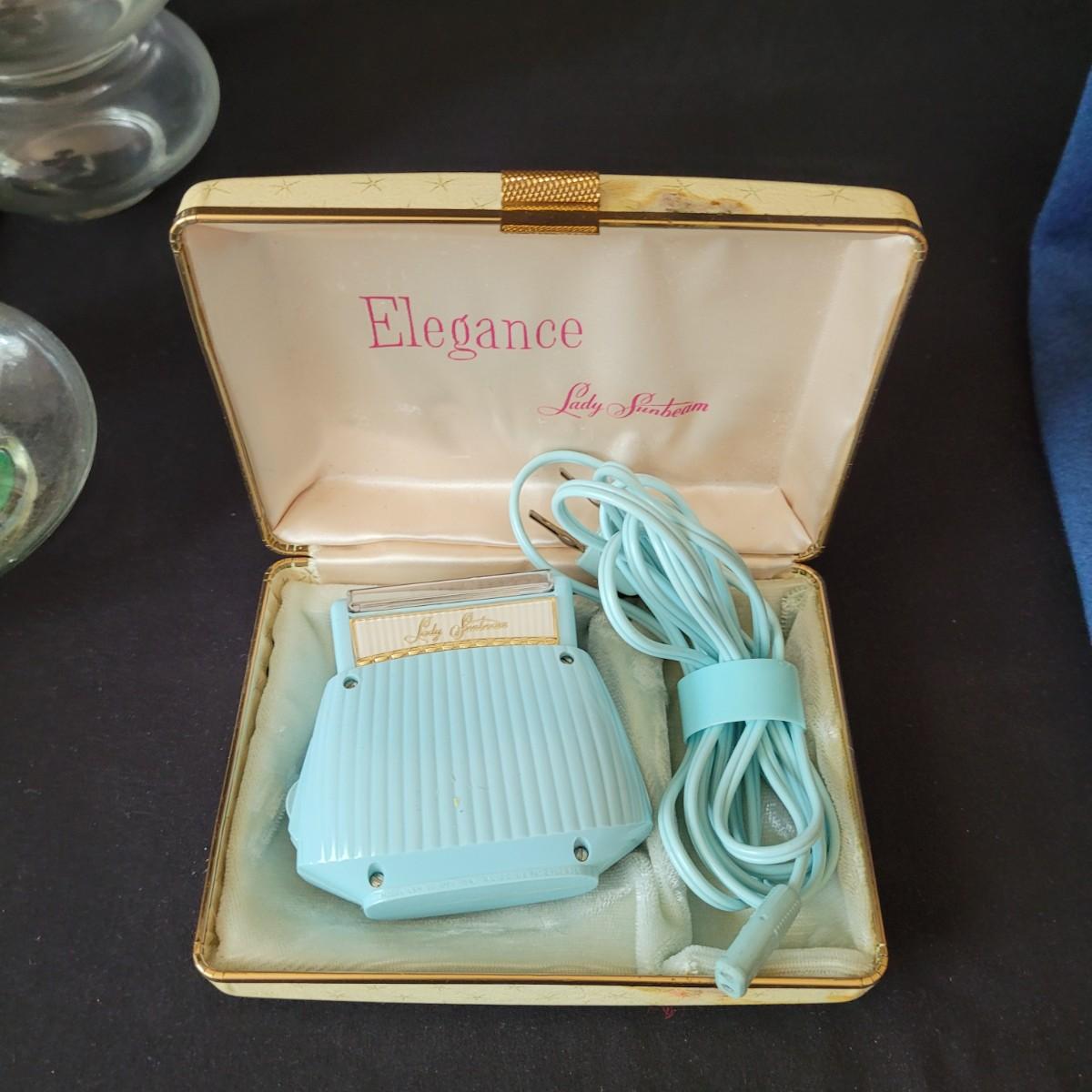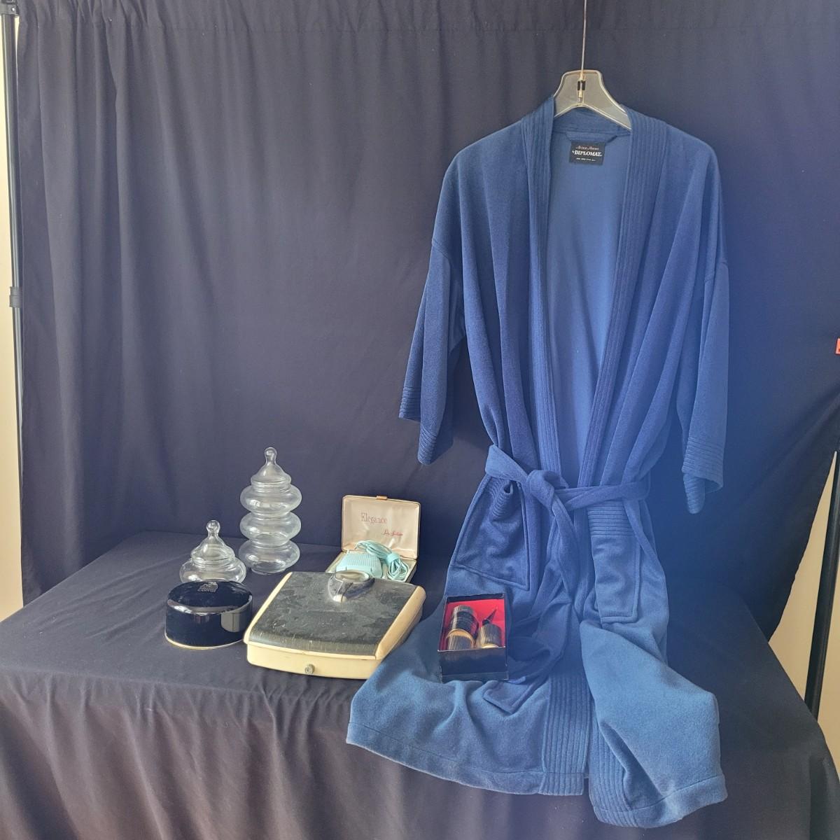 A fun assortment of vintage bath and beauty items, including a Lanvin powder puff, Celebrity lint remover, Lady Sunbeam electric razor (works when tested), Borg scale, tiered glass jars, and a navy blue bath robe made of an acetate polyester blend. Robe is in good condition and measures approximately 17" in shoulders, 21" sleeve length, 48" collar to hem. Shipping available.