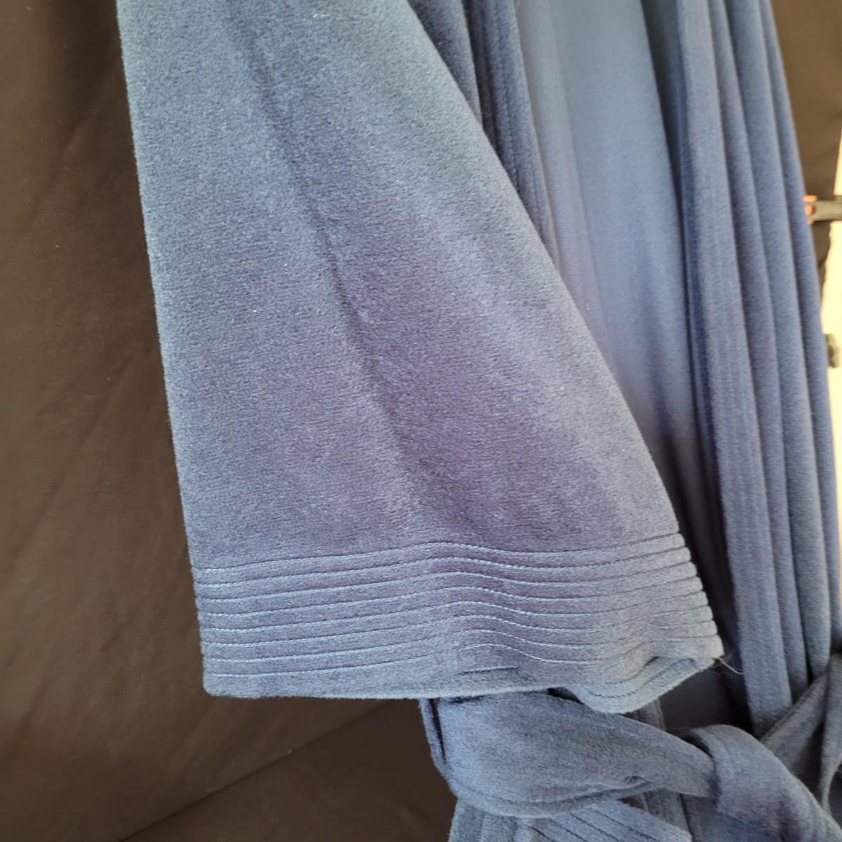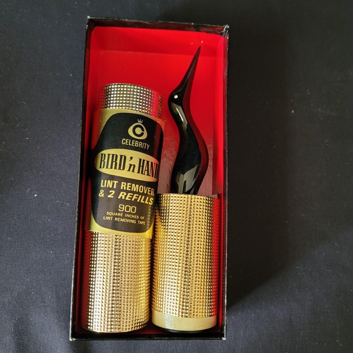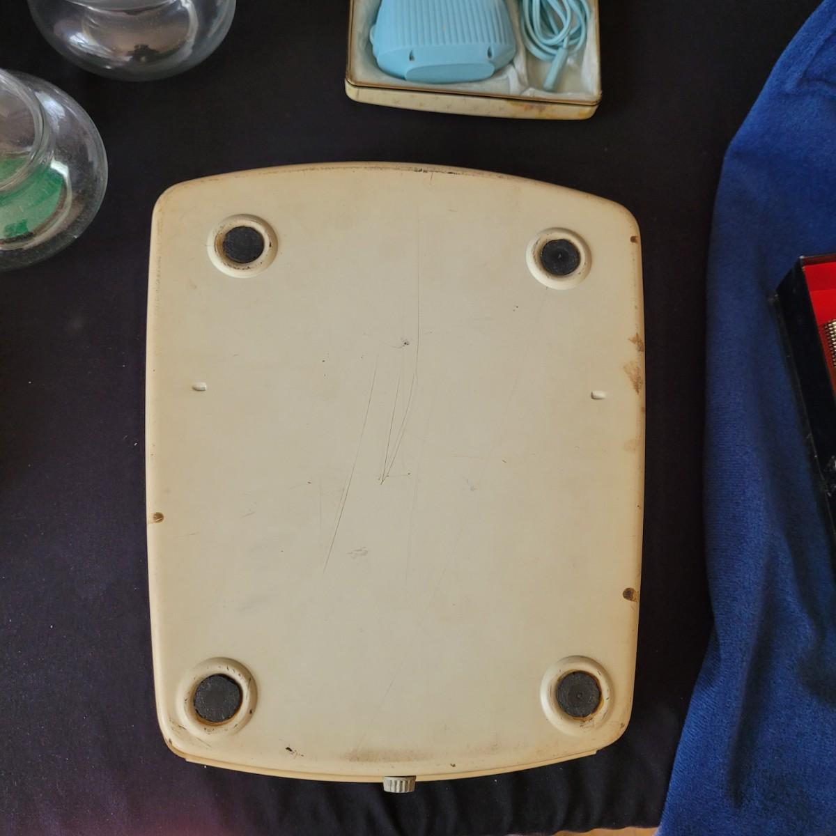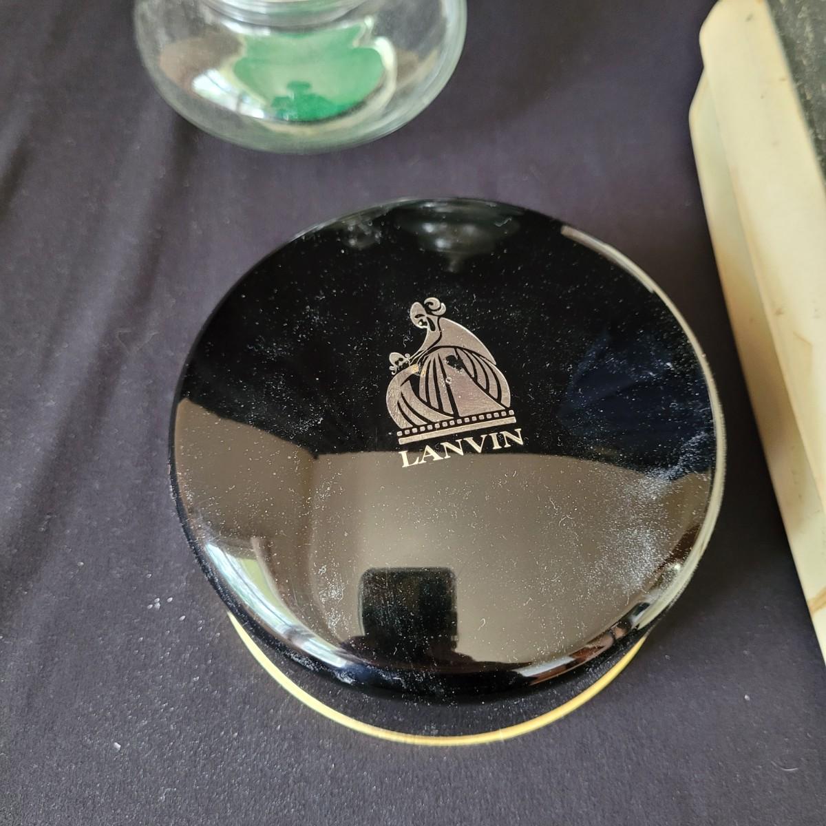 A fun assortment of vintage bath and beauty items, including a Lanvin powder puff, Celebrity lint remover, Lady Sunbeam electric razor (works when tested), Borg scale, tiered glass jars, and a navy blue bath robe made of an acetate polyester blend. Robe is in good condition and measures approximately 17" in shoulders, 21" sleeve length, 48" collar to hem. Shipping available.