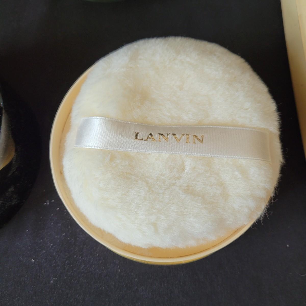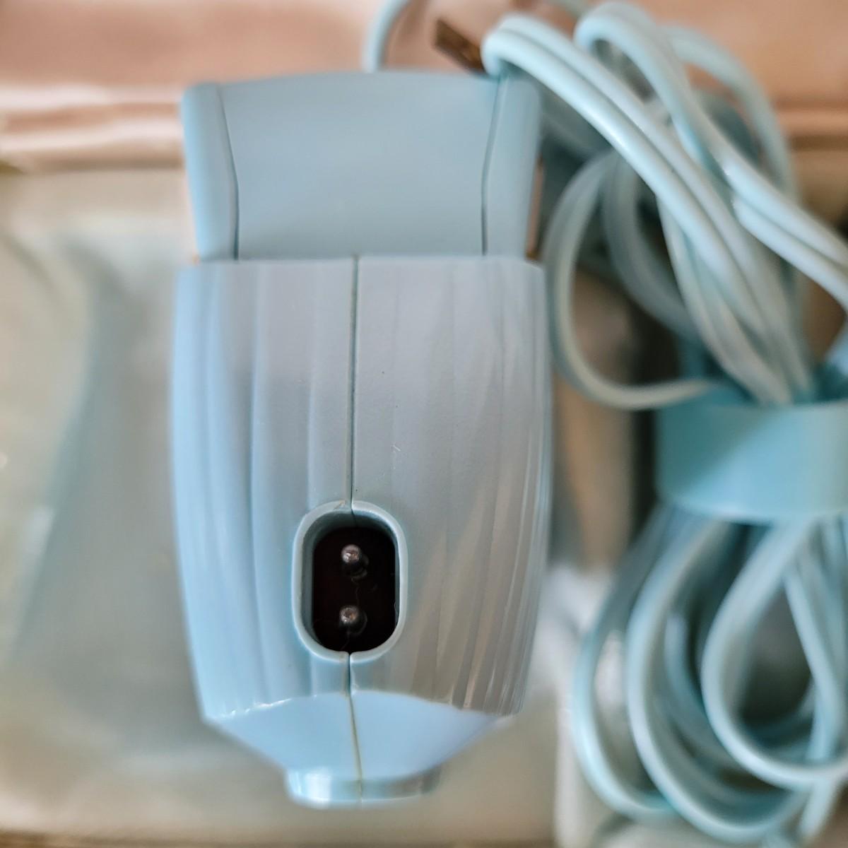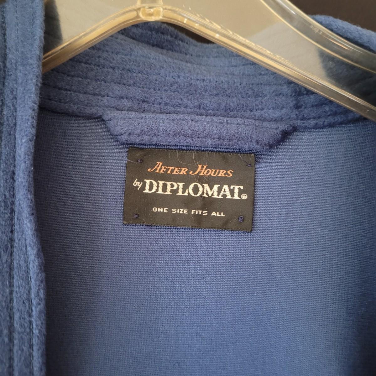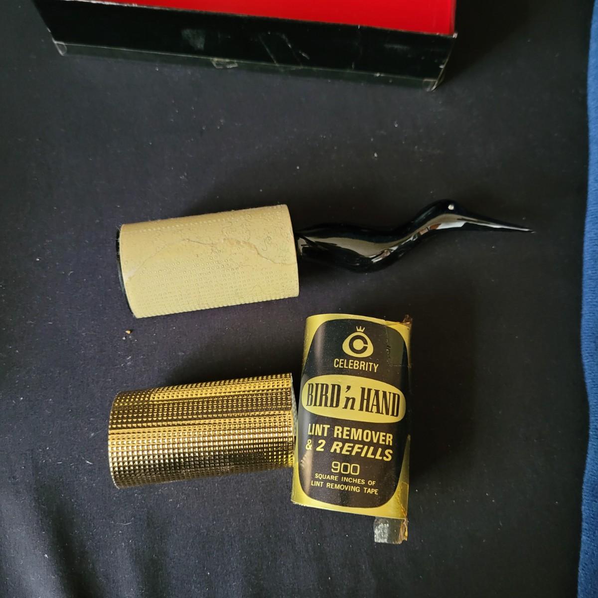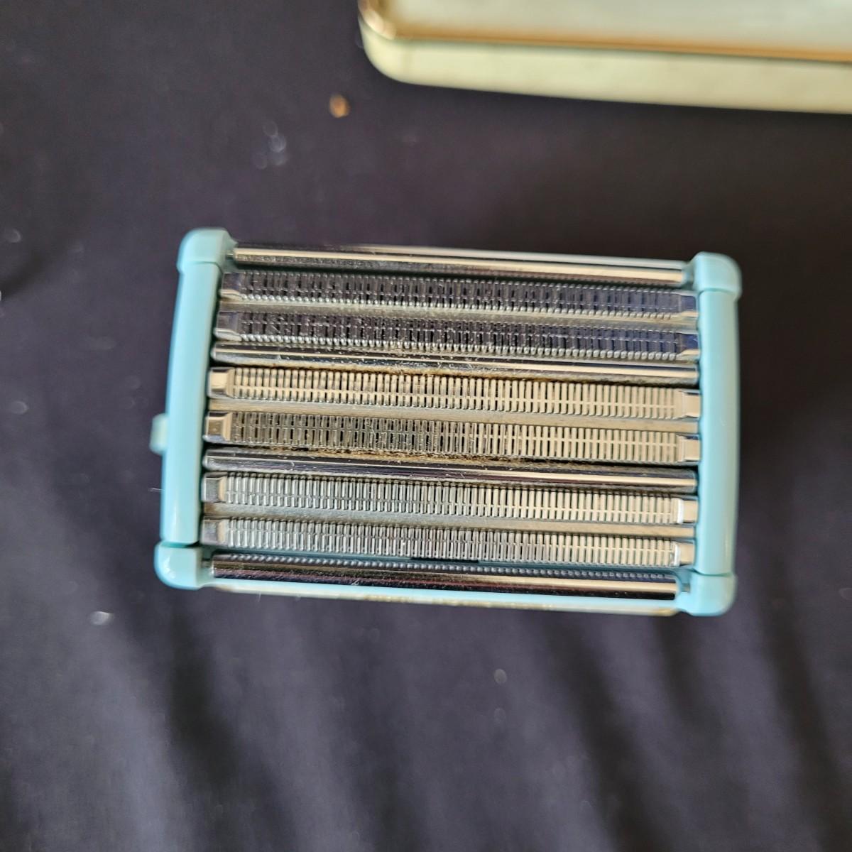 A fun assortment of vintage bath and beauty items, including a Lanvin powder puff, Celebrity lint remover, Lady Sunbeam electric razor (works when tested), Borg scale, tiered glass jars, and a navy blue bath robe made of an acetate polyester blend. Robe is in good condition and measures approximately 17" in shoulders, 21" sleeve length, 48" collar to hem. Shipping available.
