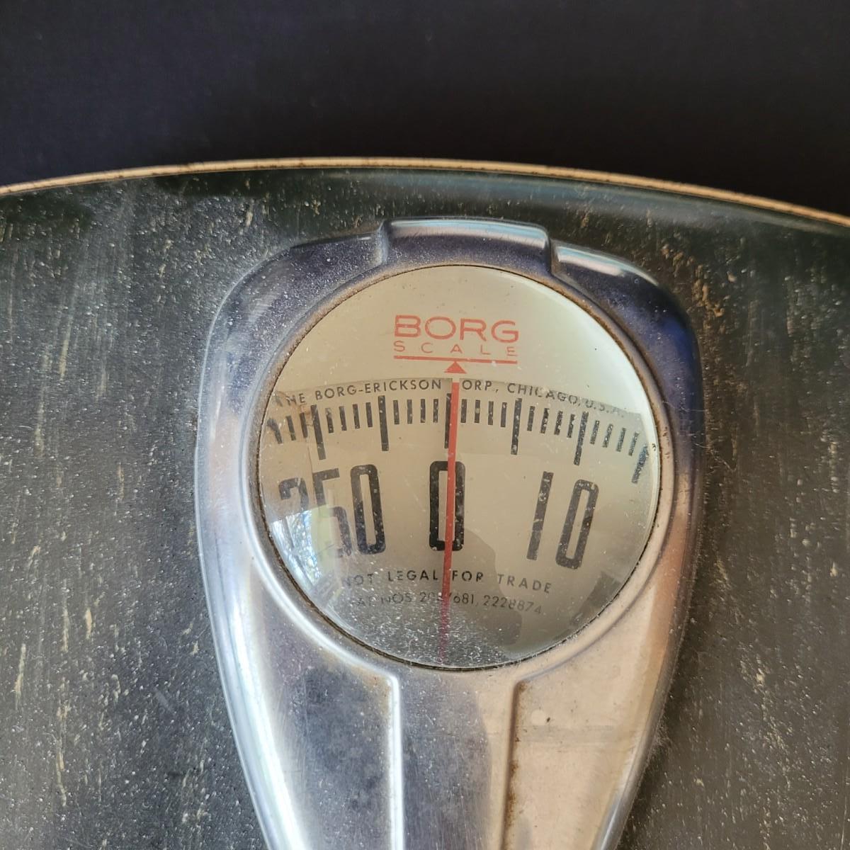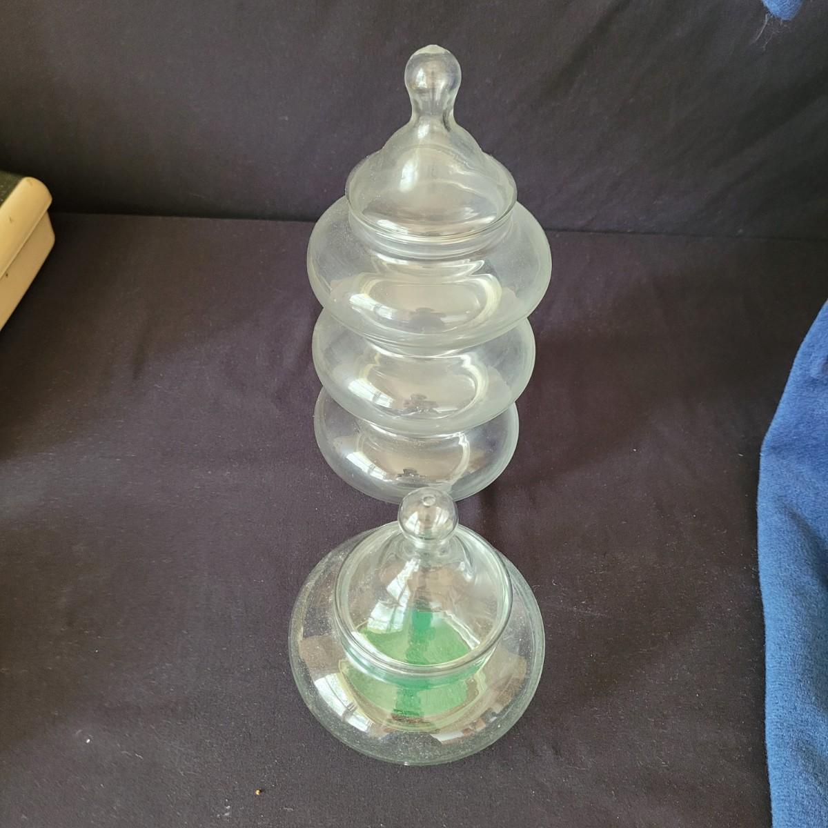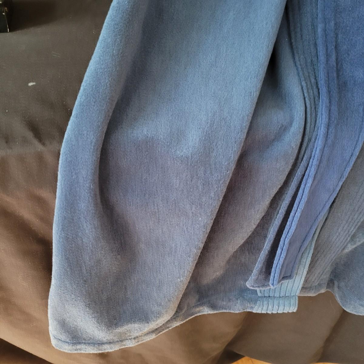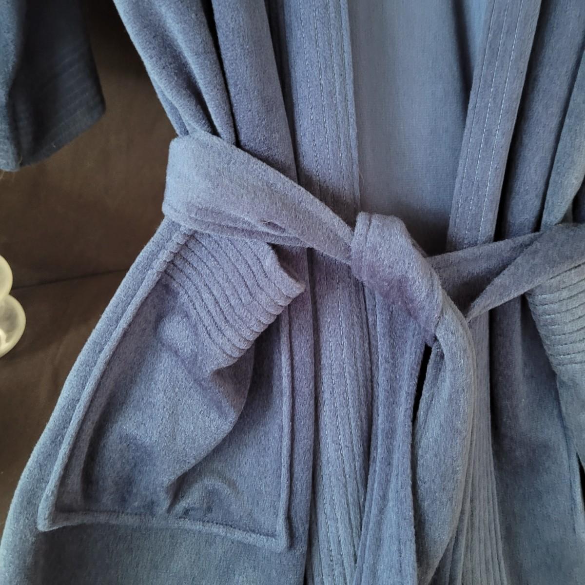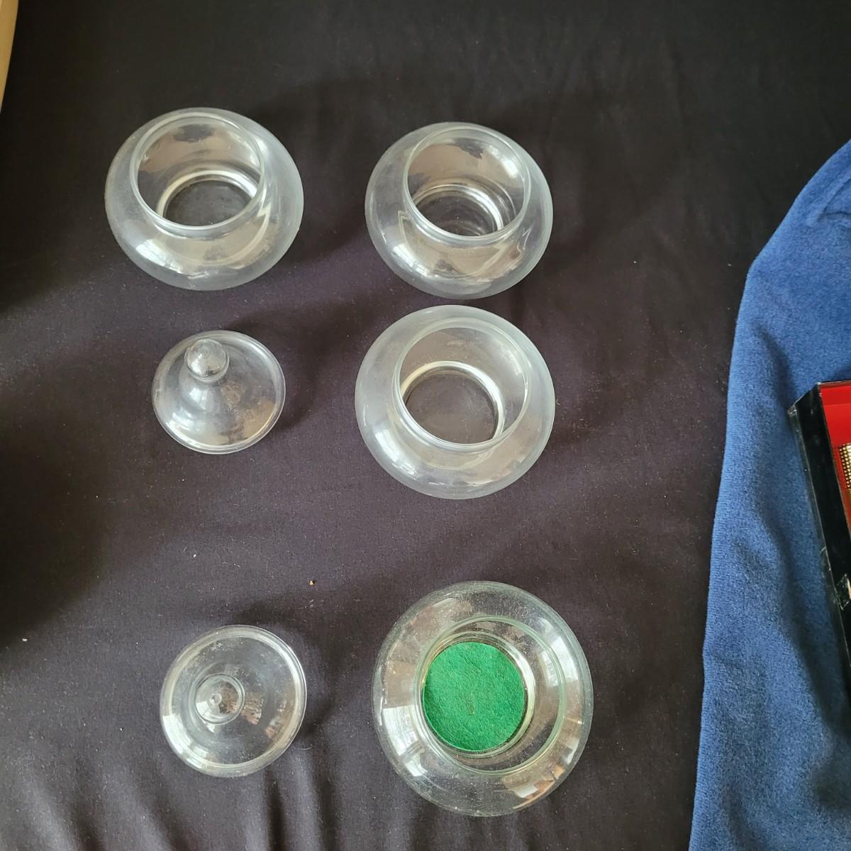 A fun assortment of vintage bath and beauty items, including a Lanvin powder puff, Celebrity lint remover, Lady Sunbeam electric razor (works when tested), Borg scale, tiered glass jars, and a navy blue bath robe made of an acetate polyester blend. Robe is in good condition and measures approximately 17" in shoulders, 21" sleeve length, 48" collar to hem. Shipping available.