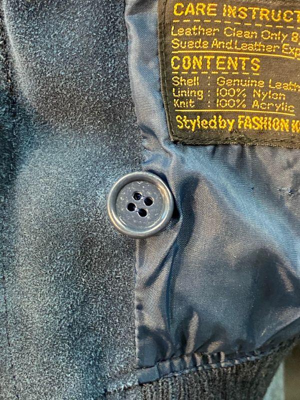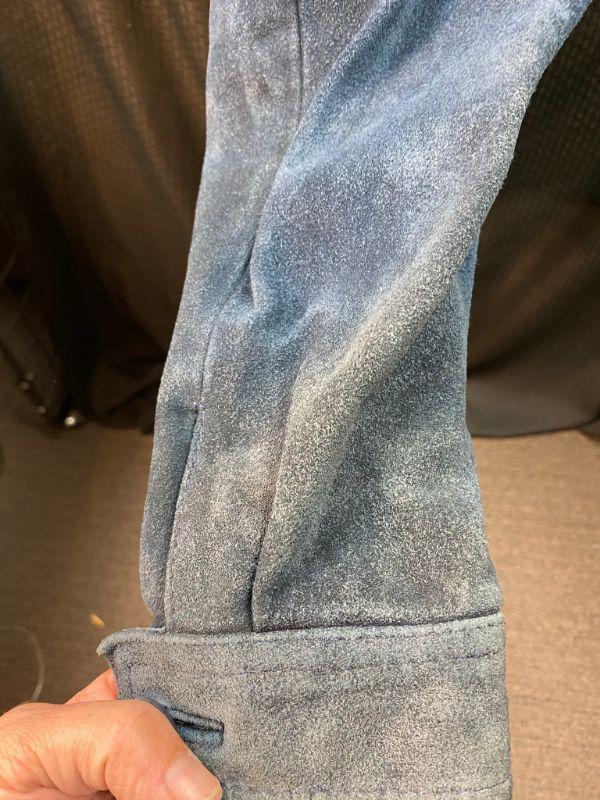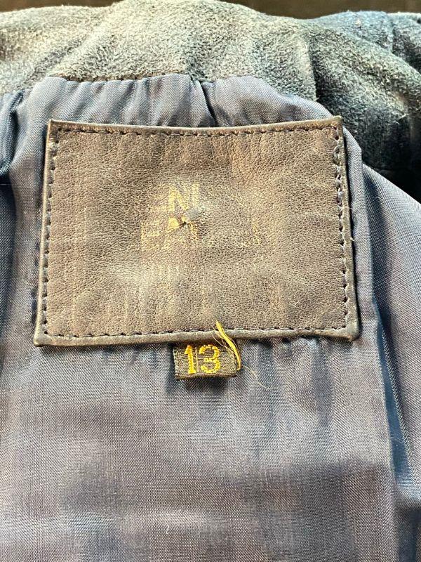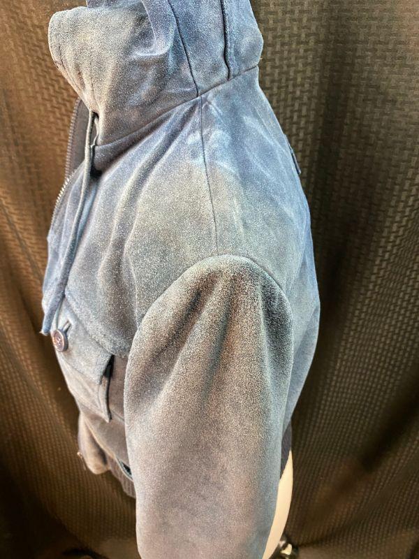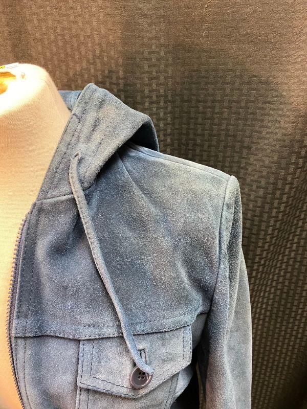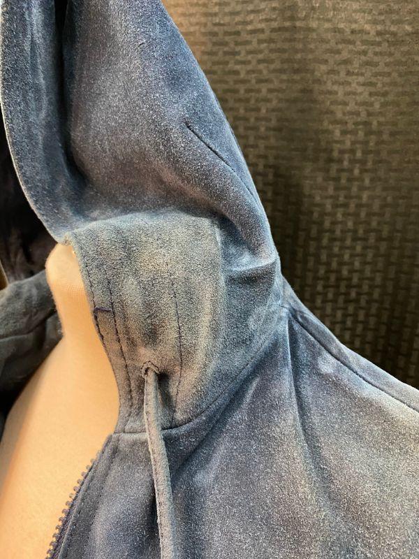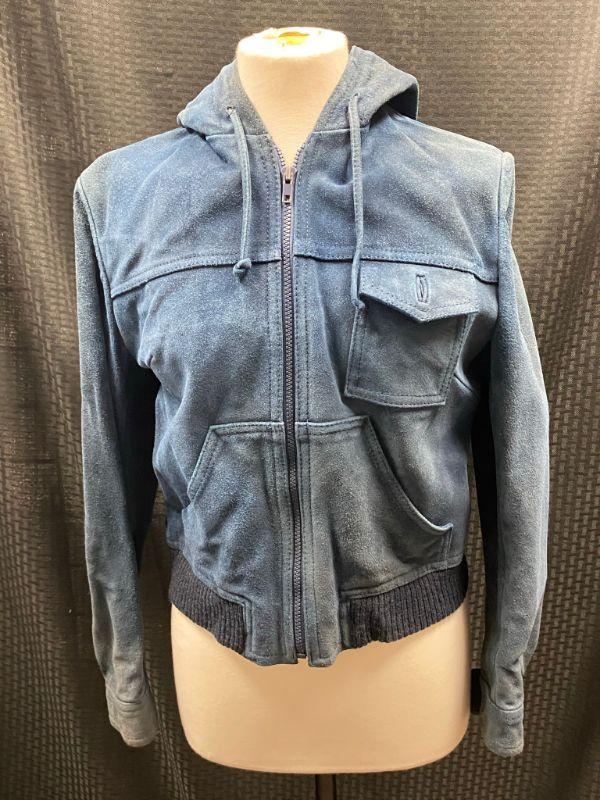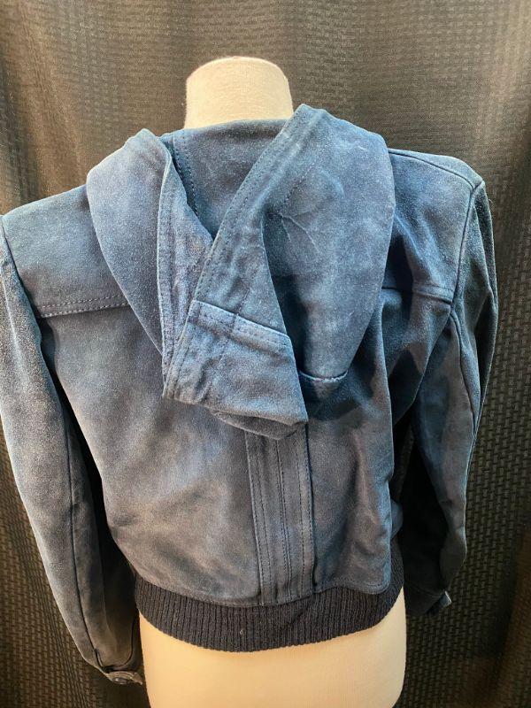 Vintage women's/ junior's blue suede jacket. Size 13. Jacket was in plastic prior to photos and has a dry cleaning note inside sleeve from 02/90. The suede is stiff in spots. Unsure if it is from age or water damage. There is discoloring in spots like the shoulders, collar and cuffs. Two front pockets and a breast pocket. Zip up front with a drawstring hood. Needs to be taken to a leather cleaner in regards to softening. Unsure of the brand. On the small side for a 13. Has potential with the proper care.