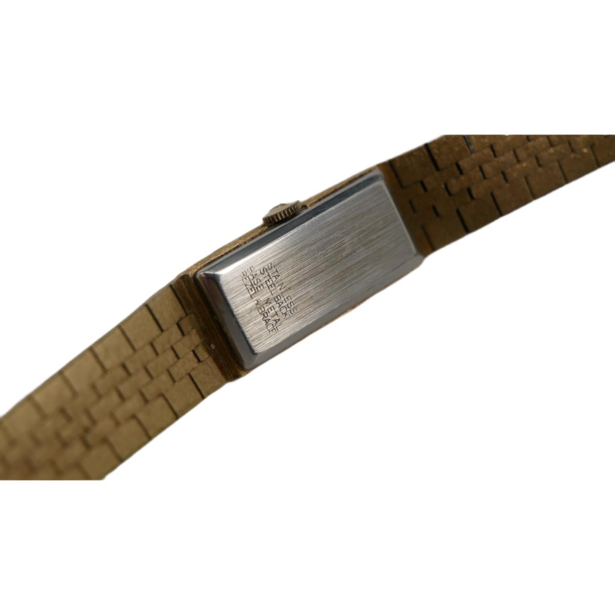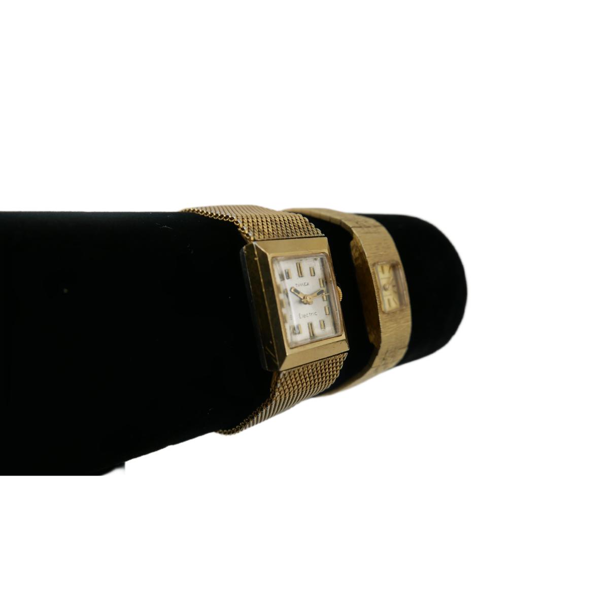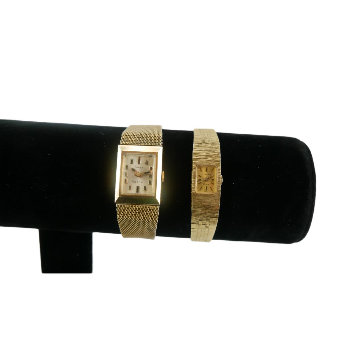 Vintage women's watches. Gold Timex electric watch is in non-operational condition. Measures approximately 7.75" at longest length and can be adjusted down with a 20mm face. Gold Wittnauer watch is operational and. Measures approximately 5.5" with a 12mm face. Lot weighs 2 oz. (J8)