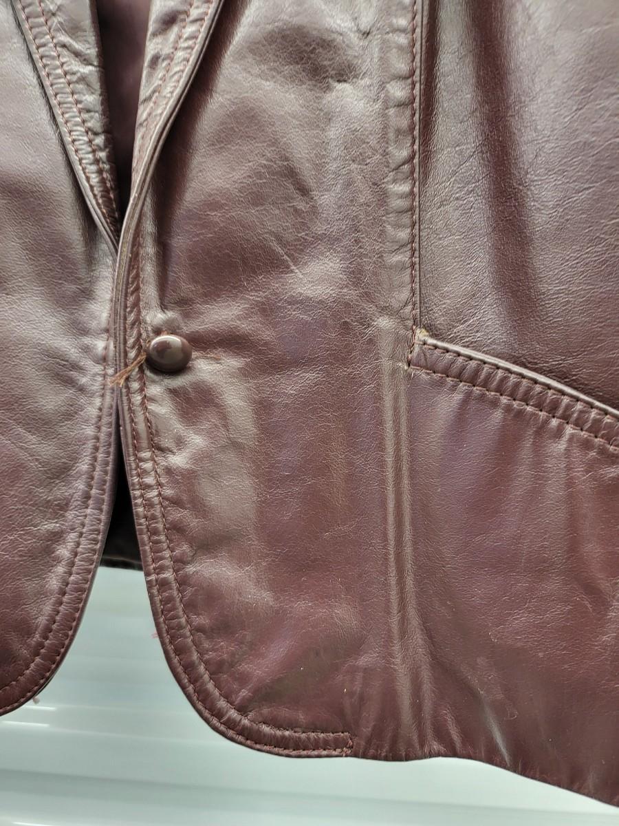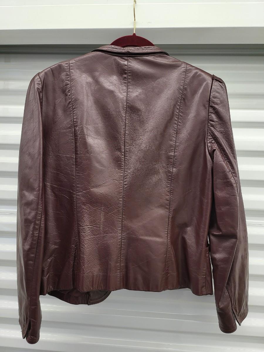 Deep burgundy wine color, genuine leather jacket with tafetta lining. Single button front, and two small front pockets. Shoulder to shoulder measures 16" and 22" long. Size says 13-14 on tag.