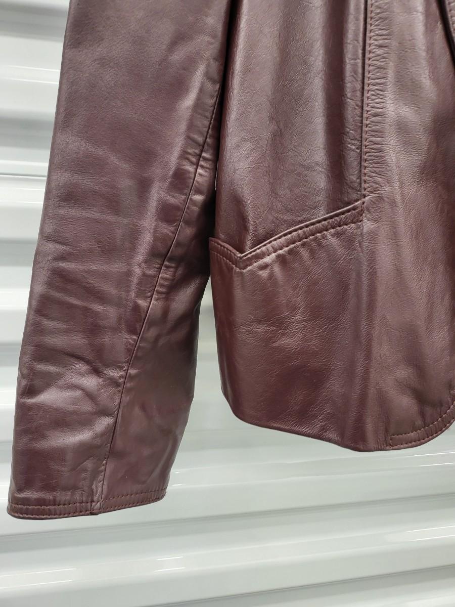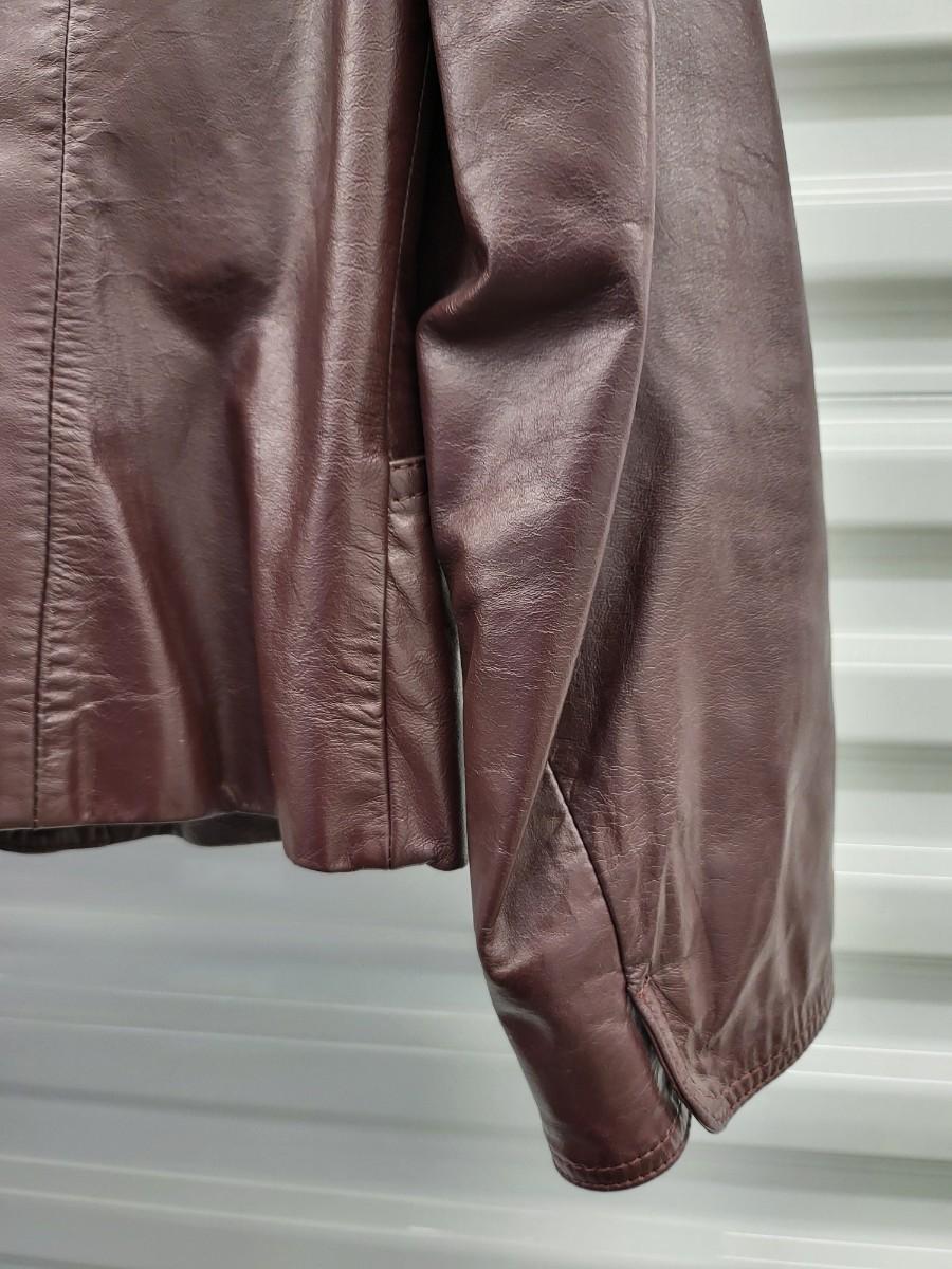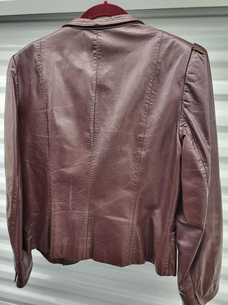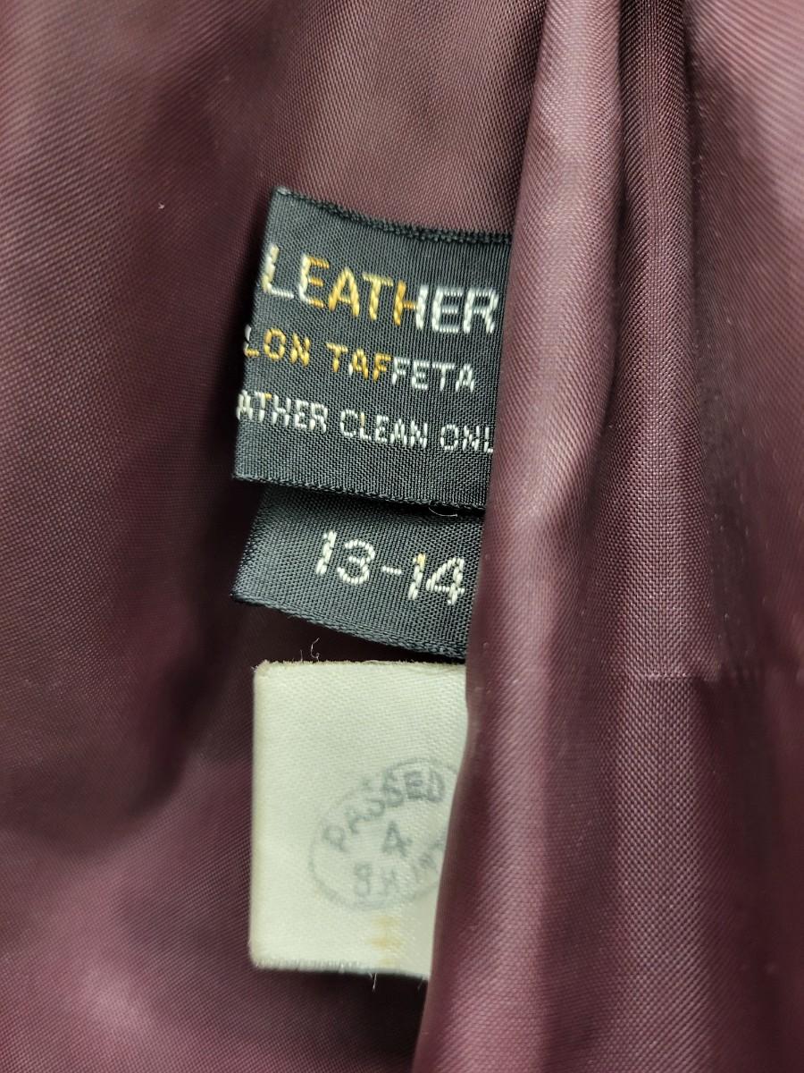 Deep burgundy wine color, genuine leather jacket with tafetta lining. Single button front, and two small front pockets. Shoulder to shoulder measures 16" and 22" long. Size says 13-14 on tag.