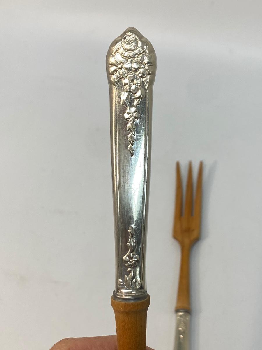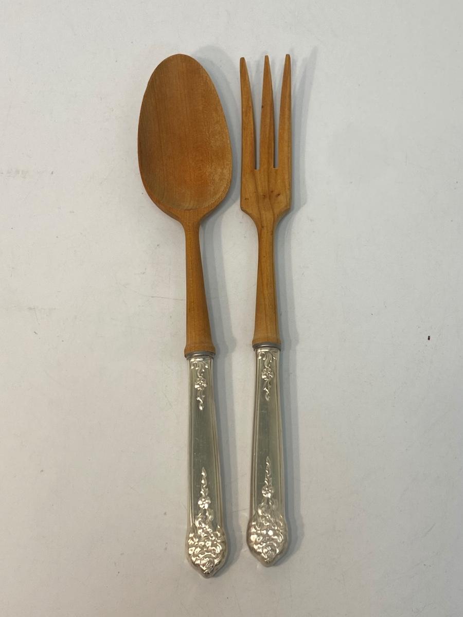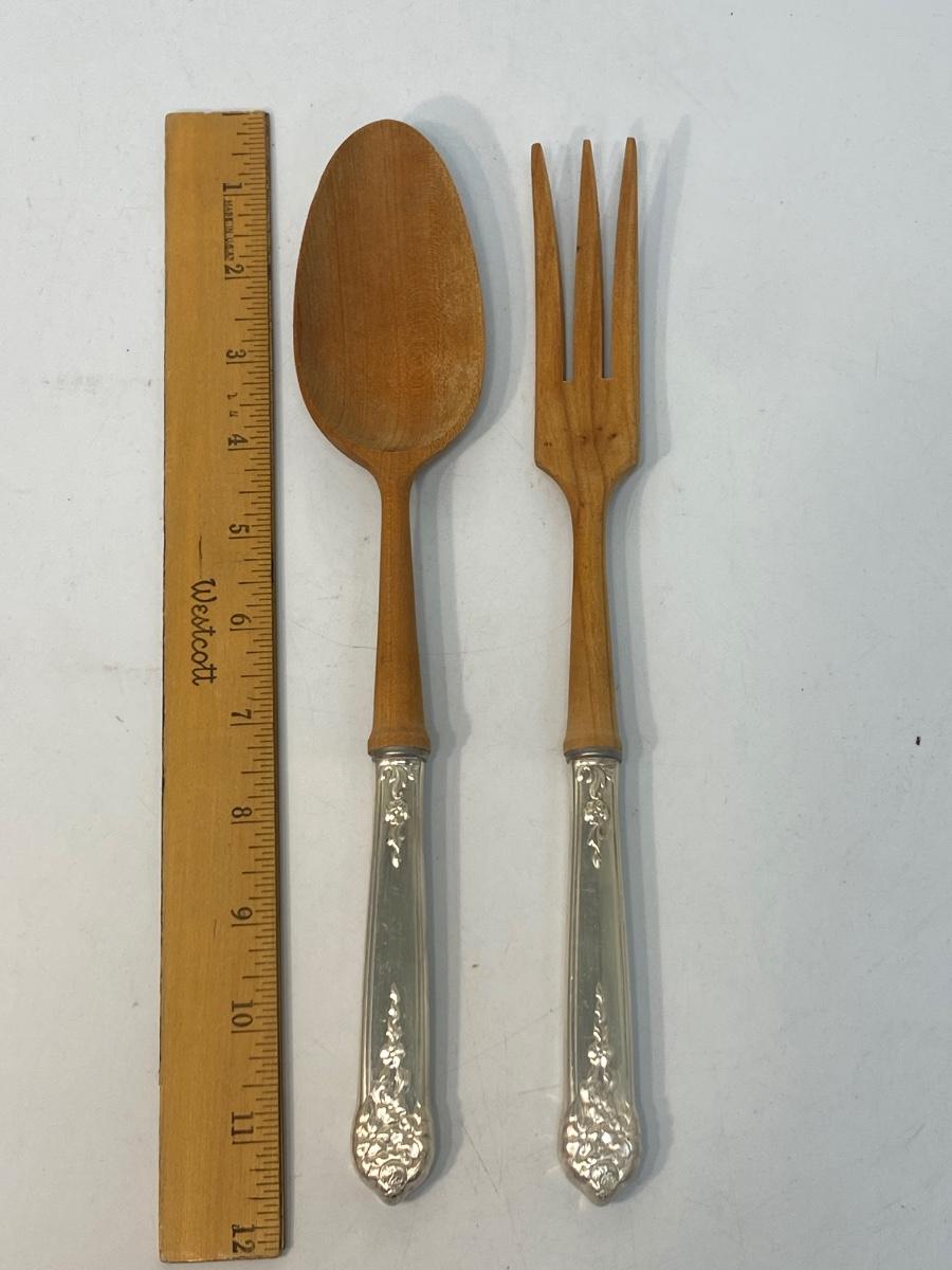 Vintage Wood and Silver Plate Serving Utensils Salad Tongs