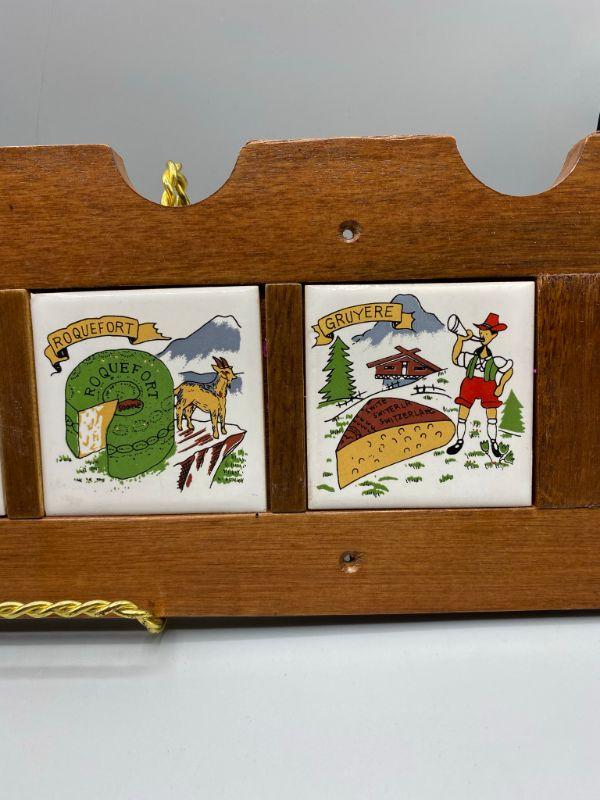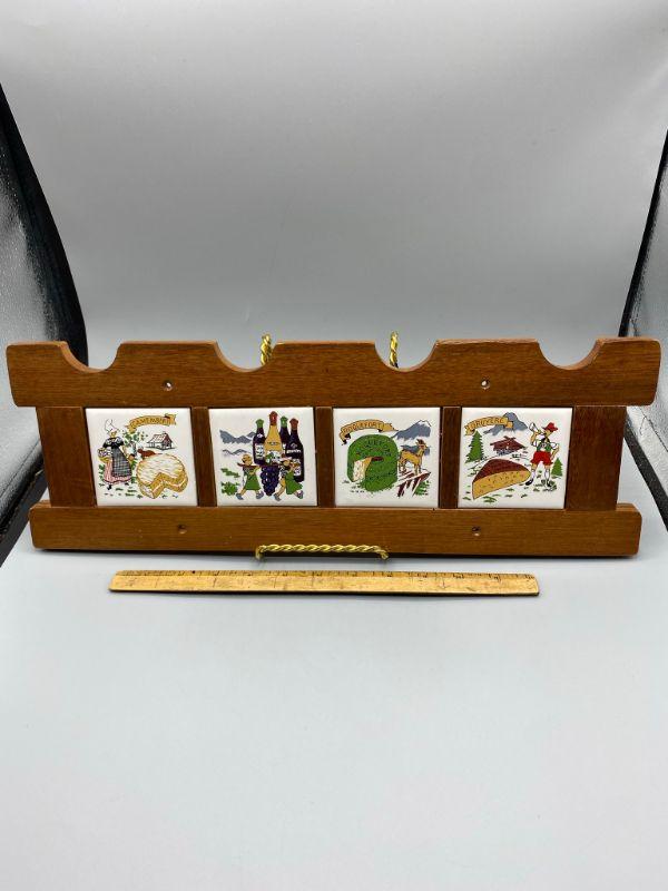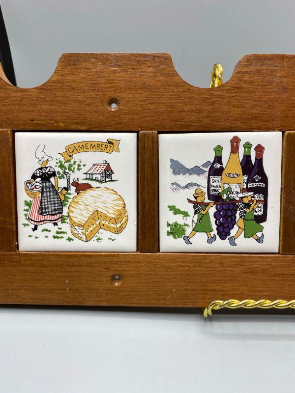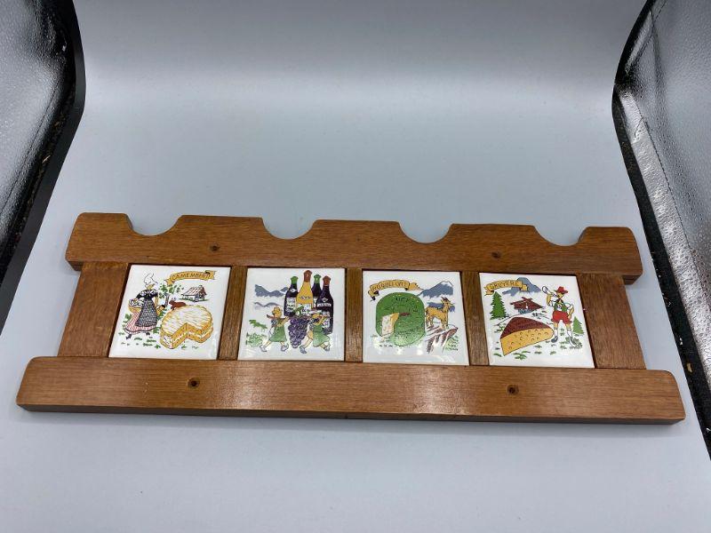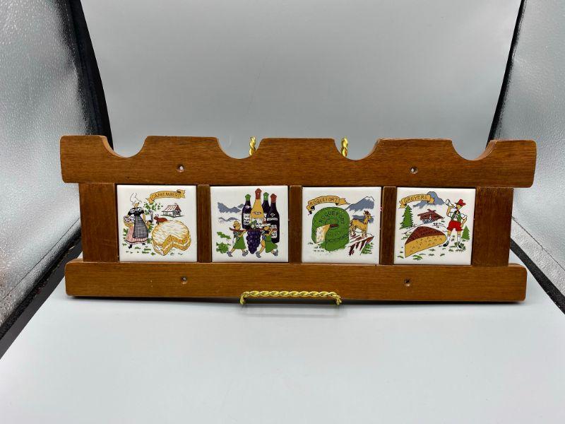 Vintage wood and tile kitchen decor. Painted tiles have different images. Could be hung on wall as decor or used as a cheese board. Probably measures about 18" or so.