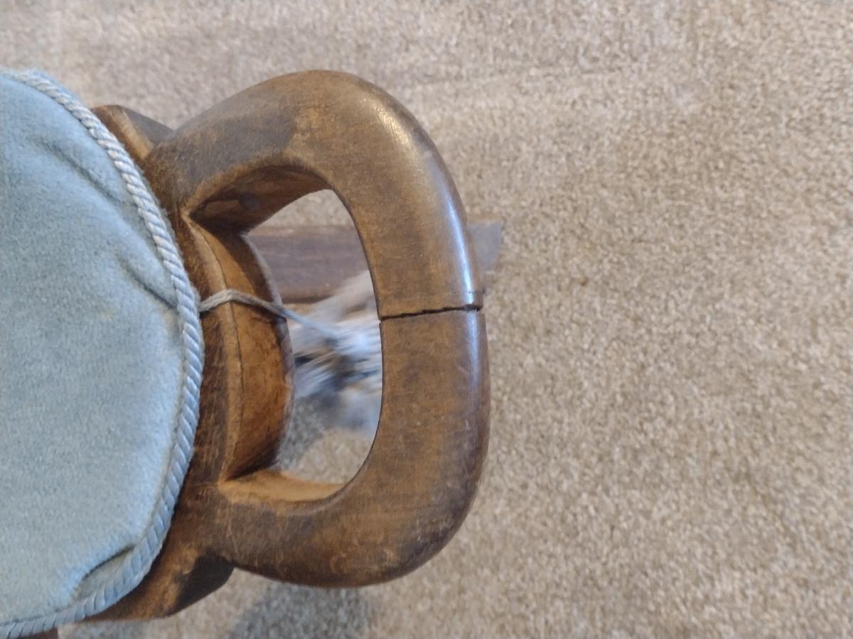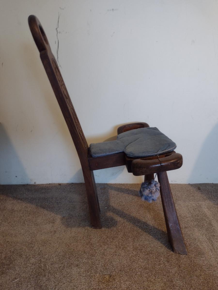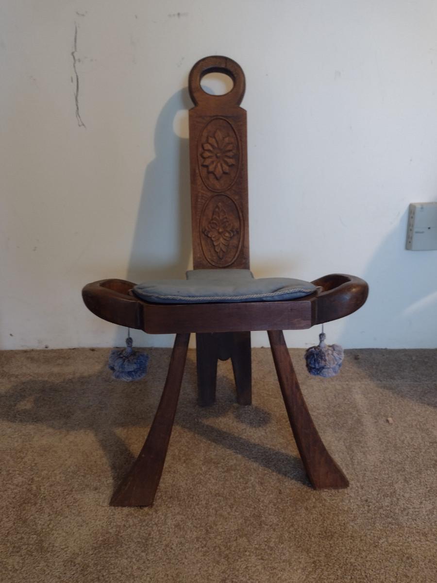 Vintage Wooden Three Legged Birthing Chair with Removable Cushion (Choice A). Please see all pictures for condition- one side handle is cracked. Cushion may have some staining.