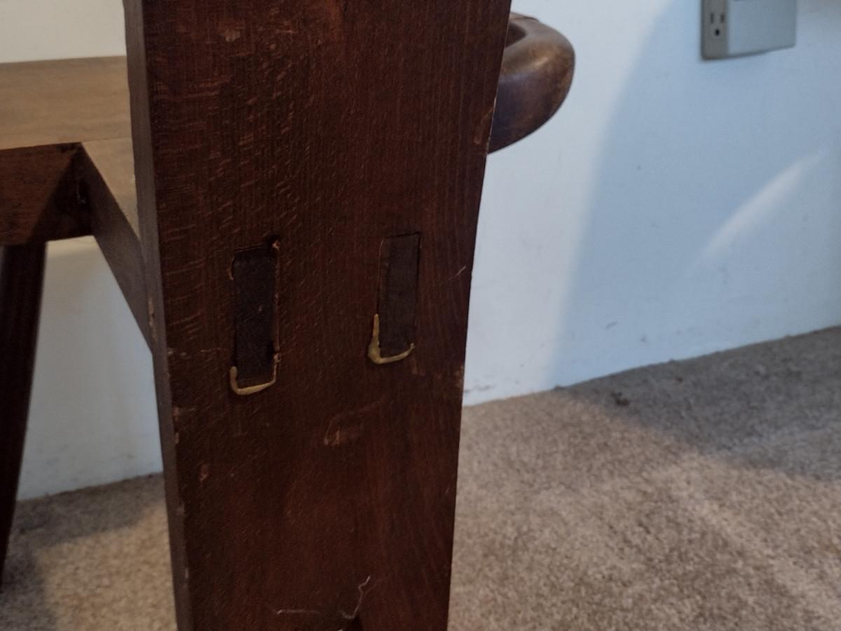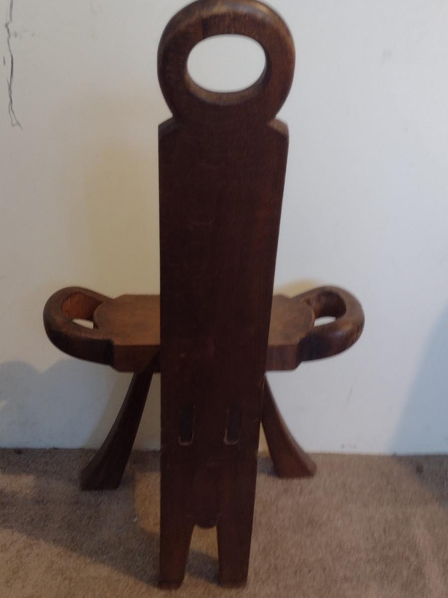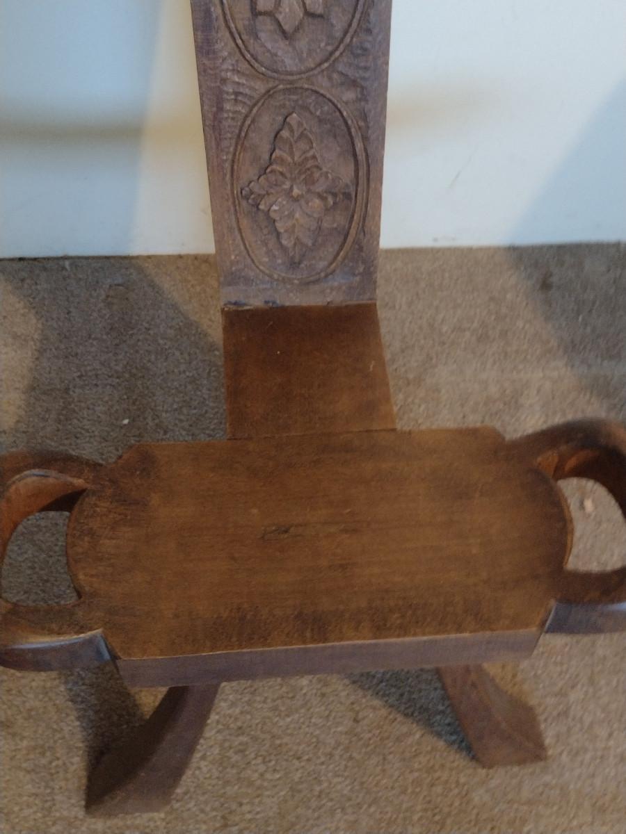 Vintage Wooden Three Legged Birthing Chair with Removable Cushion (Choice A). Please see all pictures for condition- one side handle is cracked. Cushion may have some staining.