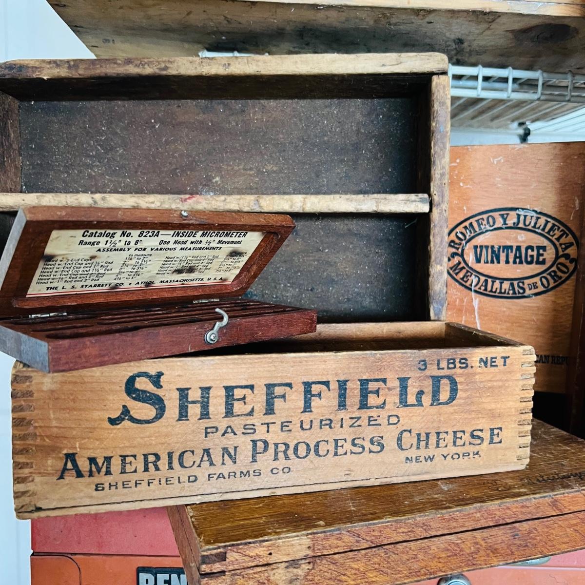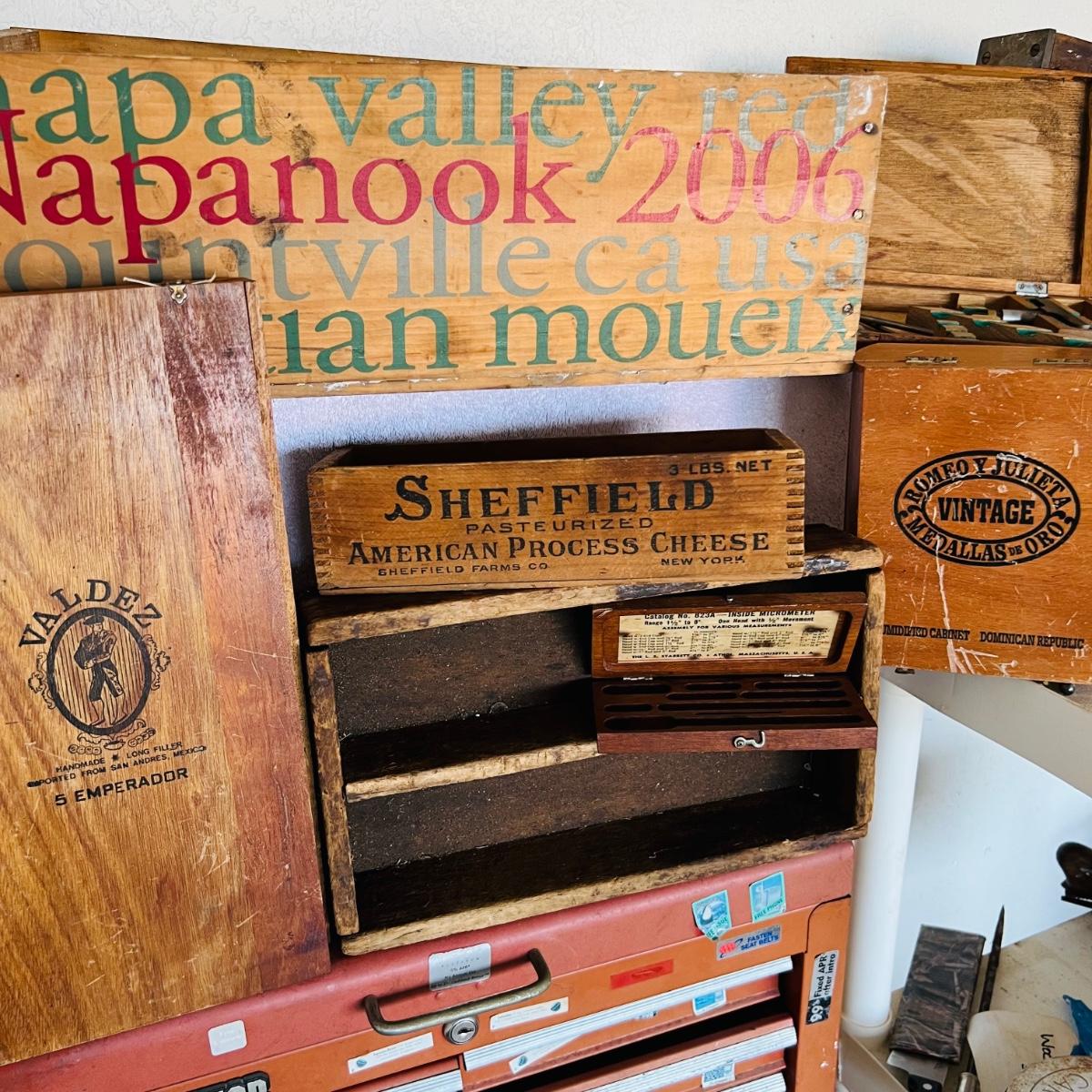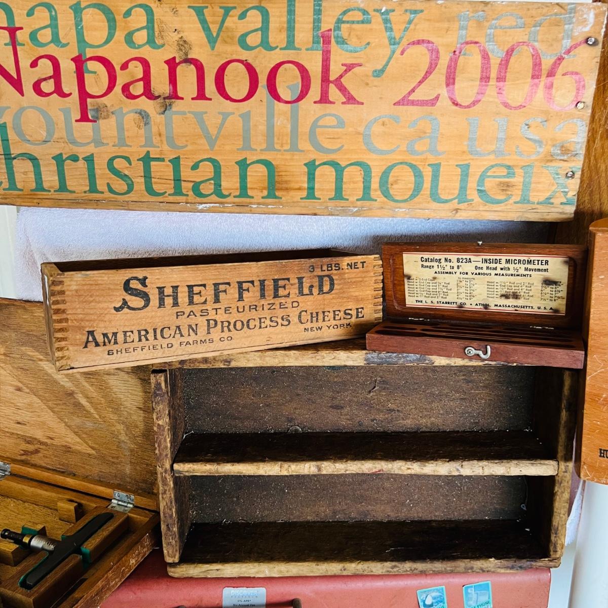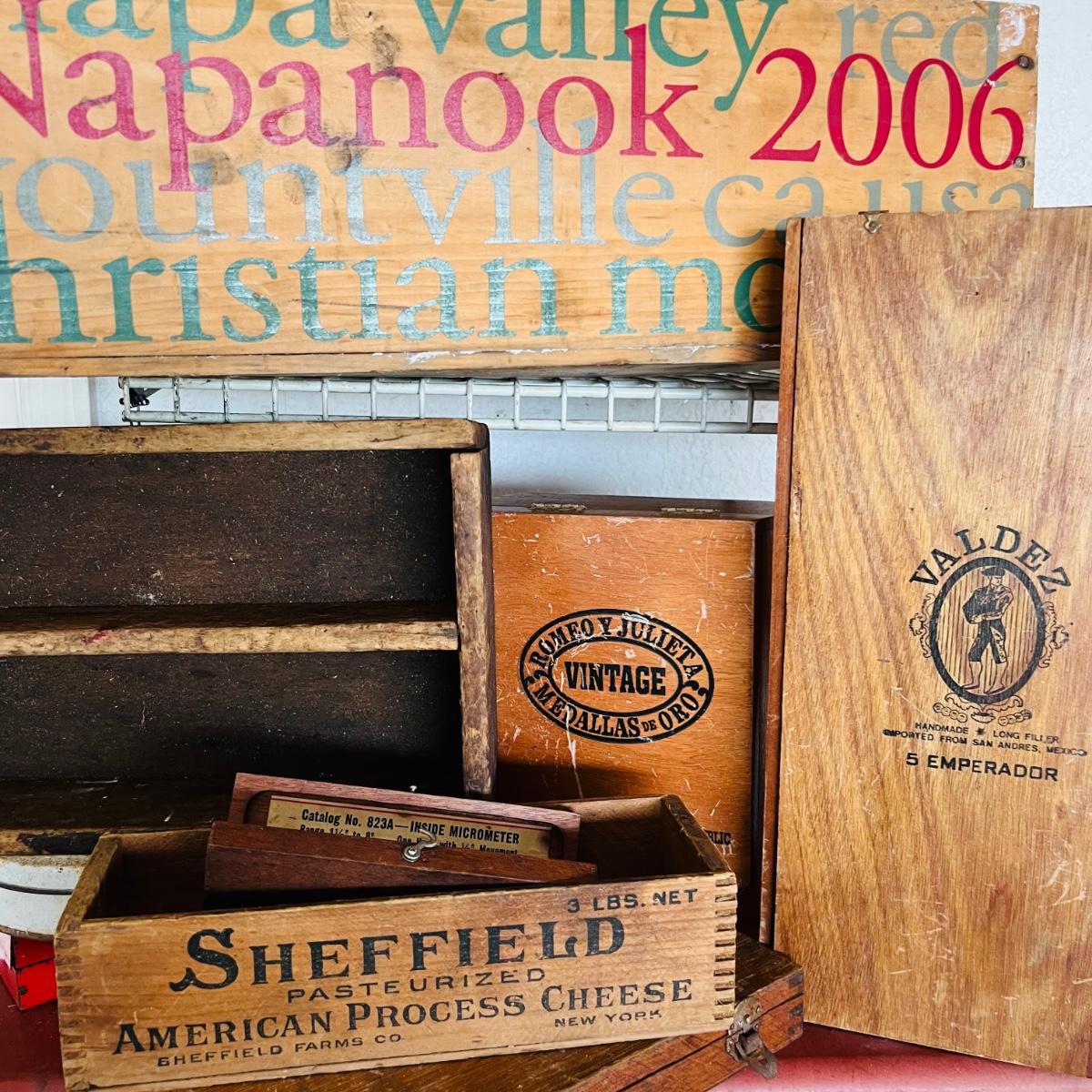 Collection of seven vintage wood boxes. Napa Valley box measures 20”L x13”W x 7”H, Romeo y Juliet’s and Valdez cigar boxes, a small micrometer wood case, a Mitutoyo tool case, Sheffield cheese box and a handmade rectangular shelf/box that measures 14”L x 8”W x 3”D.