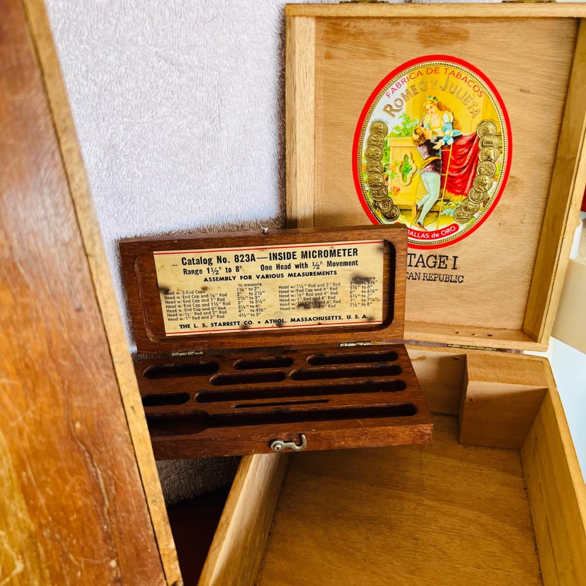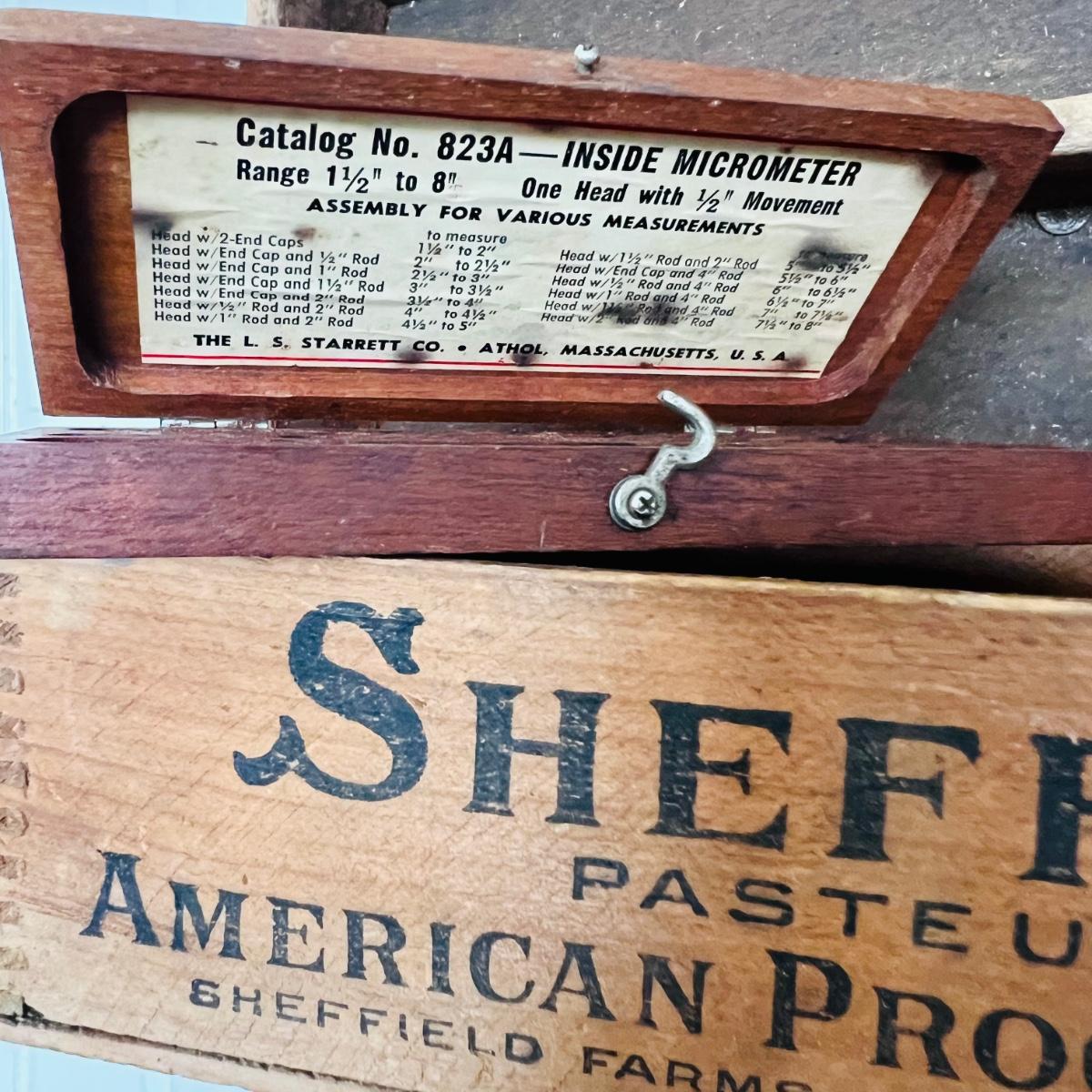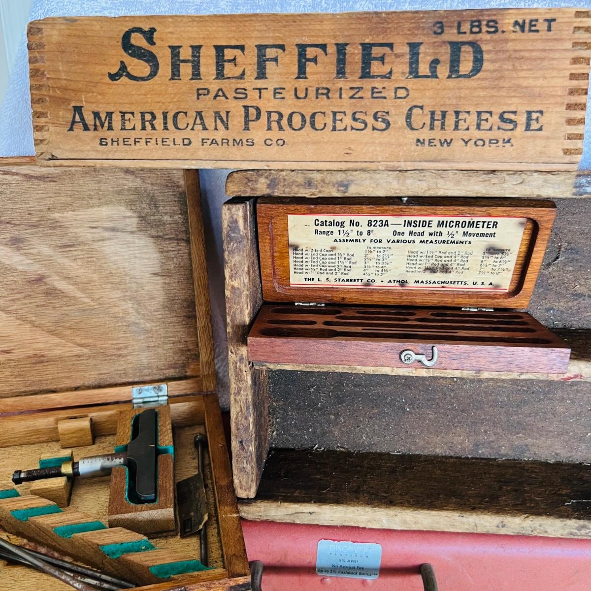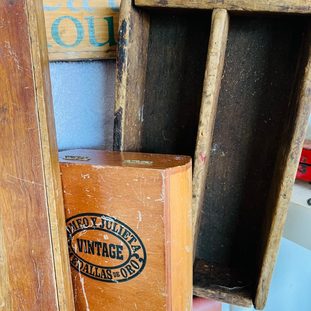 Collection of seven vintage wood boxes. Napa Valley box measures 20”L x13”W x 7”H, Romeo y Juliet’s and Valdez cigar boxes, a small micrometer wood case, a Mitutoyo tool case, Sheffield cheese box and a handmade rectangular shelf/box that measures 14”L x 8”W x 3”D.