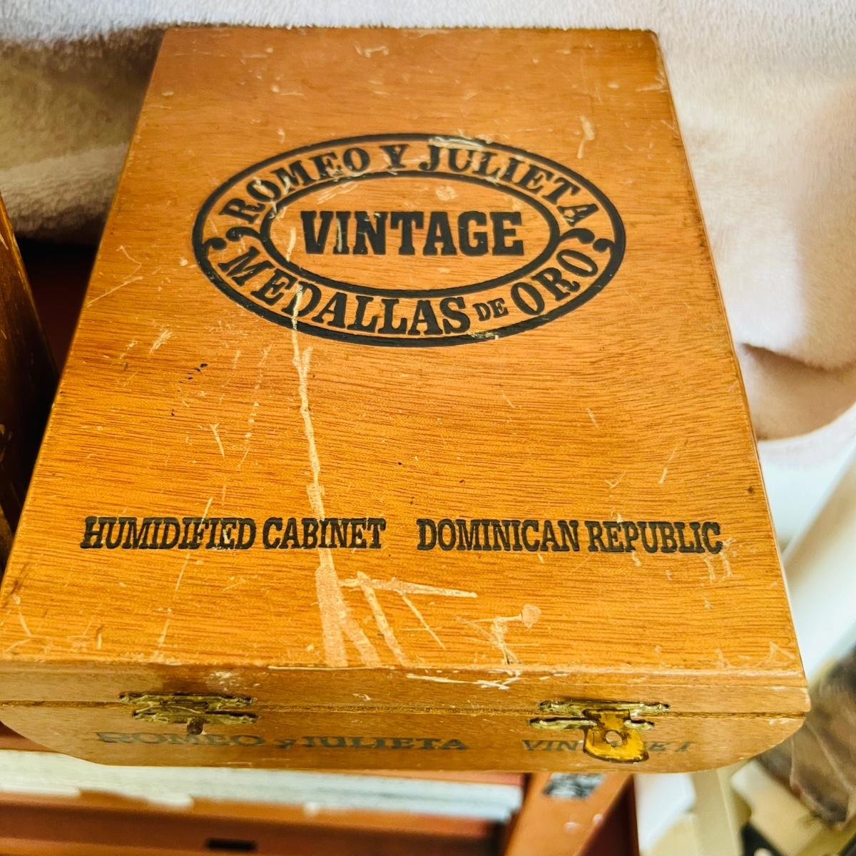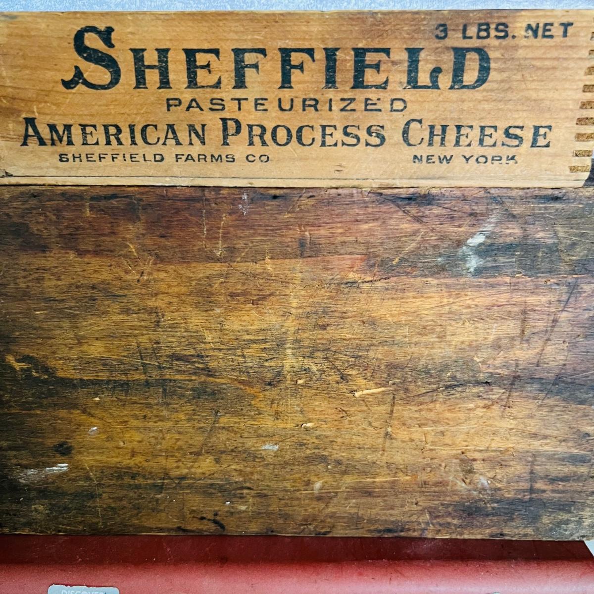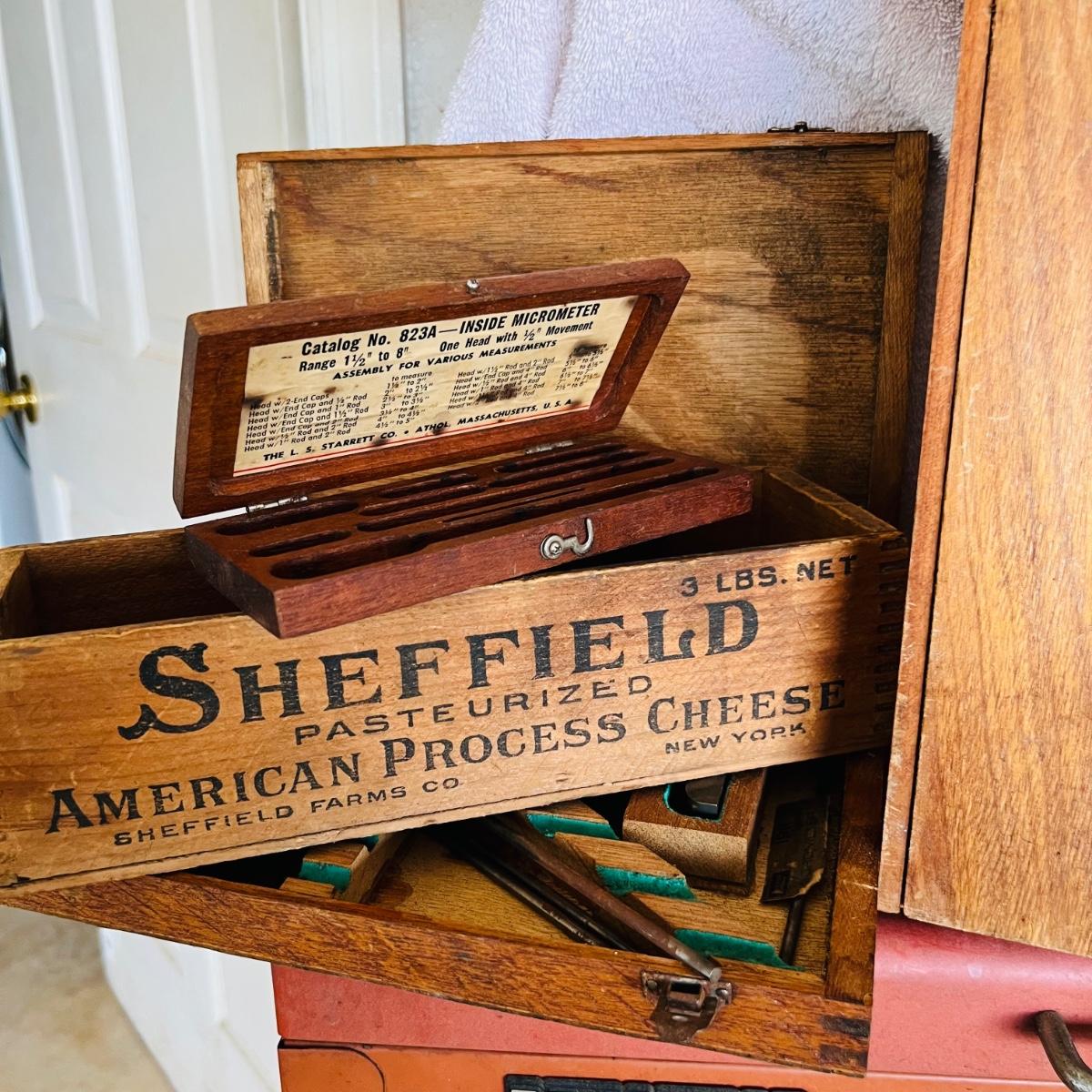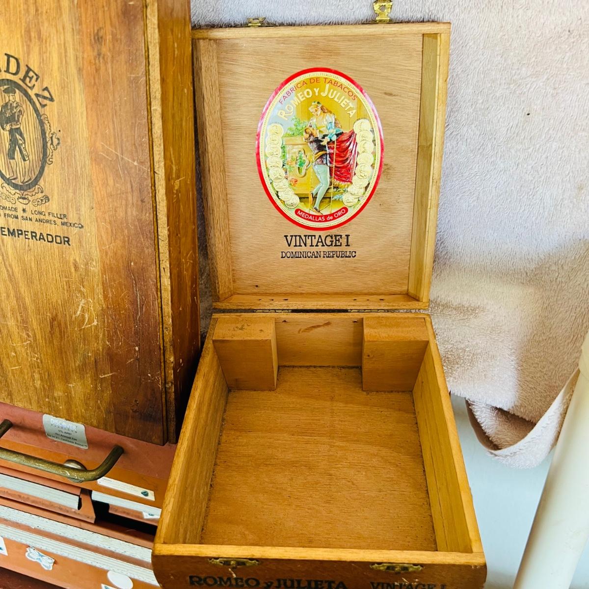 Collection of seven vintage wood boxes. Napa Valley box measures 20”L x13”W x 7”H, Romeo y Juliet’s and Valdez cigar boxes, a small micrometer wood case, a Mitutoyo tool case, Sheffield cheese box and a handmade rectangular shelf/box that measures 14”L x 8”W x 3”D.