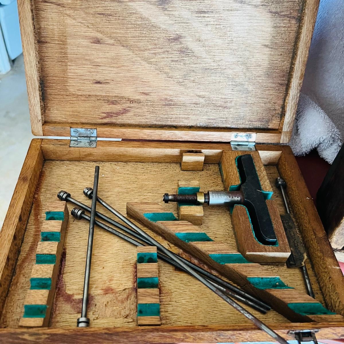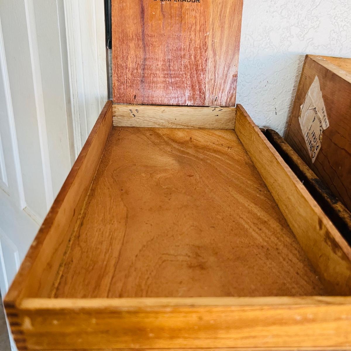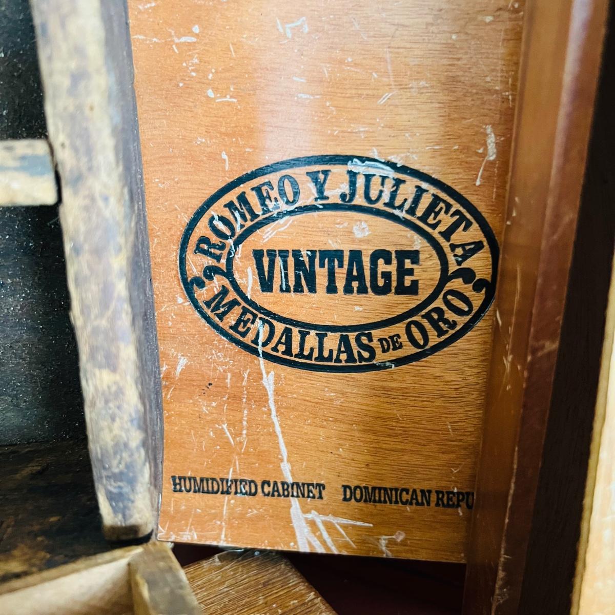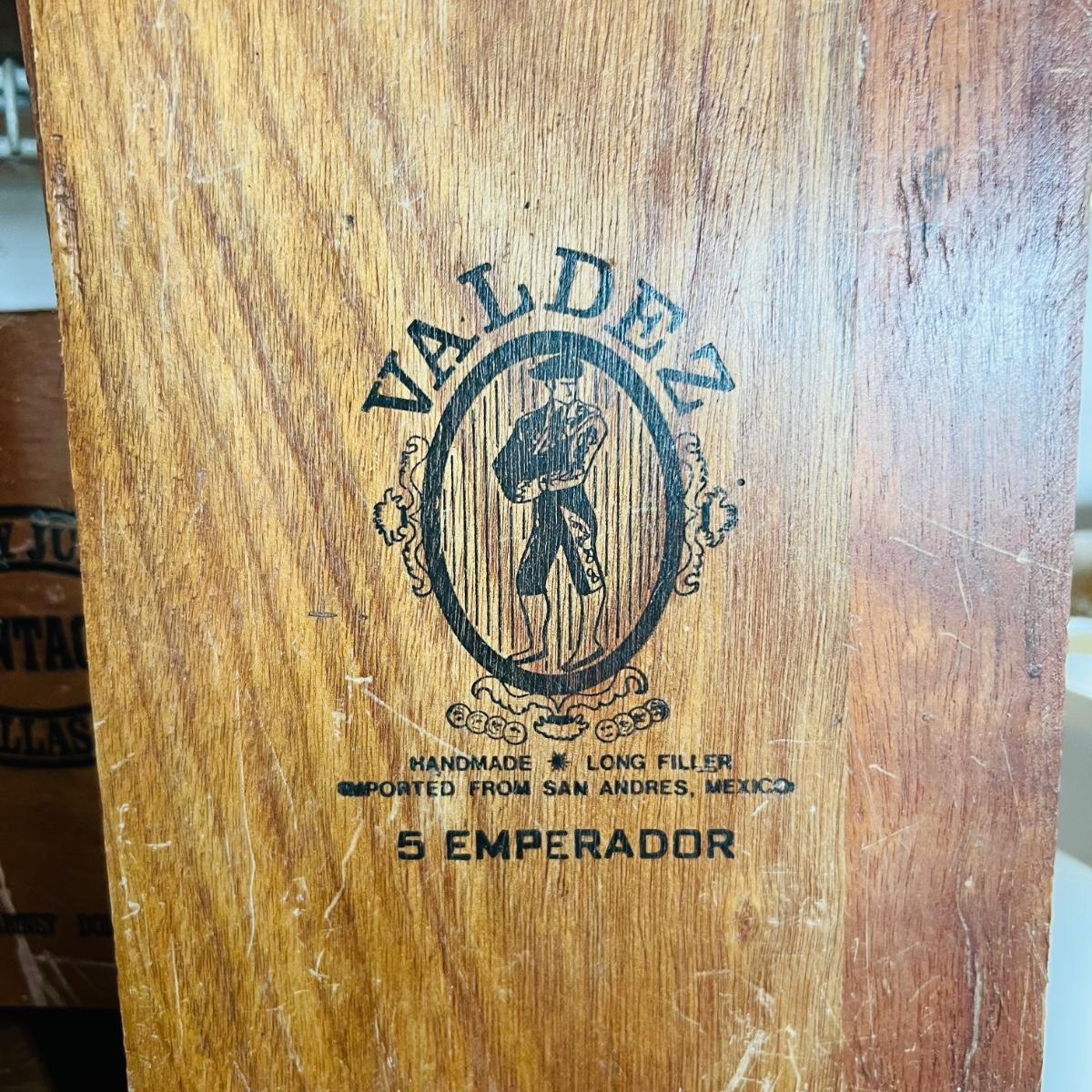 Collection of seven vintage wood boxes. Napa Valley box measures 20”L x13”W x 7”H, Romeo y Juliet’s and Valdez cigar boxes, a small micrometer wood case, a Mitutoyo tool case, Sheffield cheese box and a handmade rectangular shelf/box that measures 14”L x 8”W x 3”D.