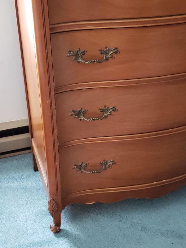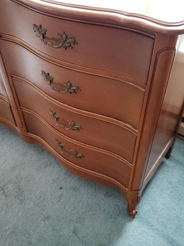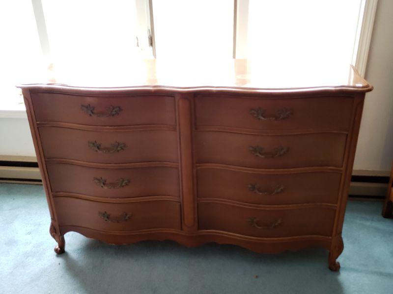 Vintage Wood Bureau. Eight drawers. Some cosmetic issues consistent with age & use. Some evidence of watermarks. Dimensions: 55"w x 19.5"d x 34"h. Lot# 0048