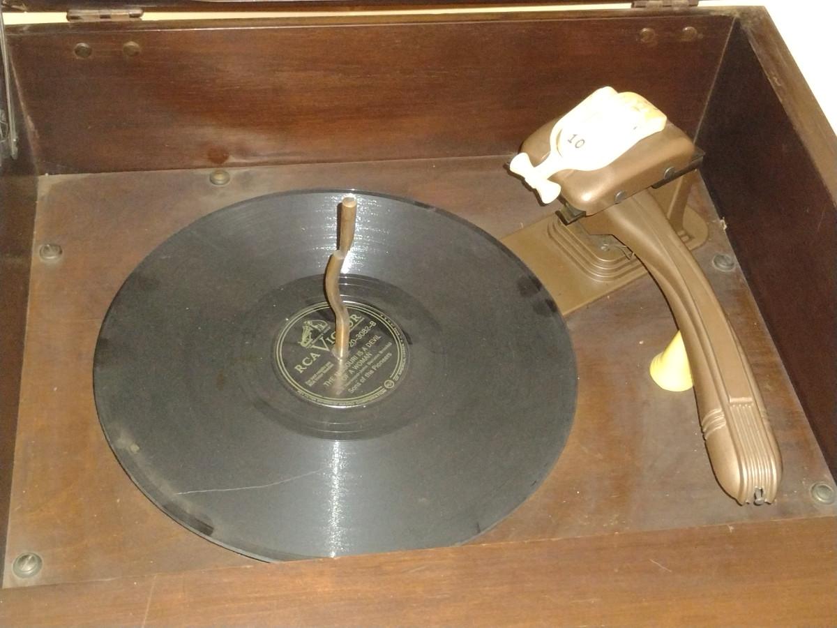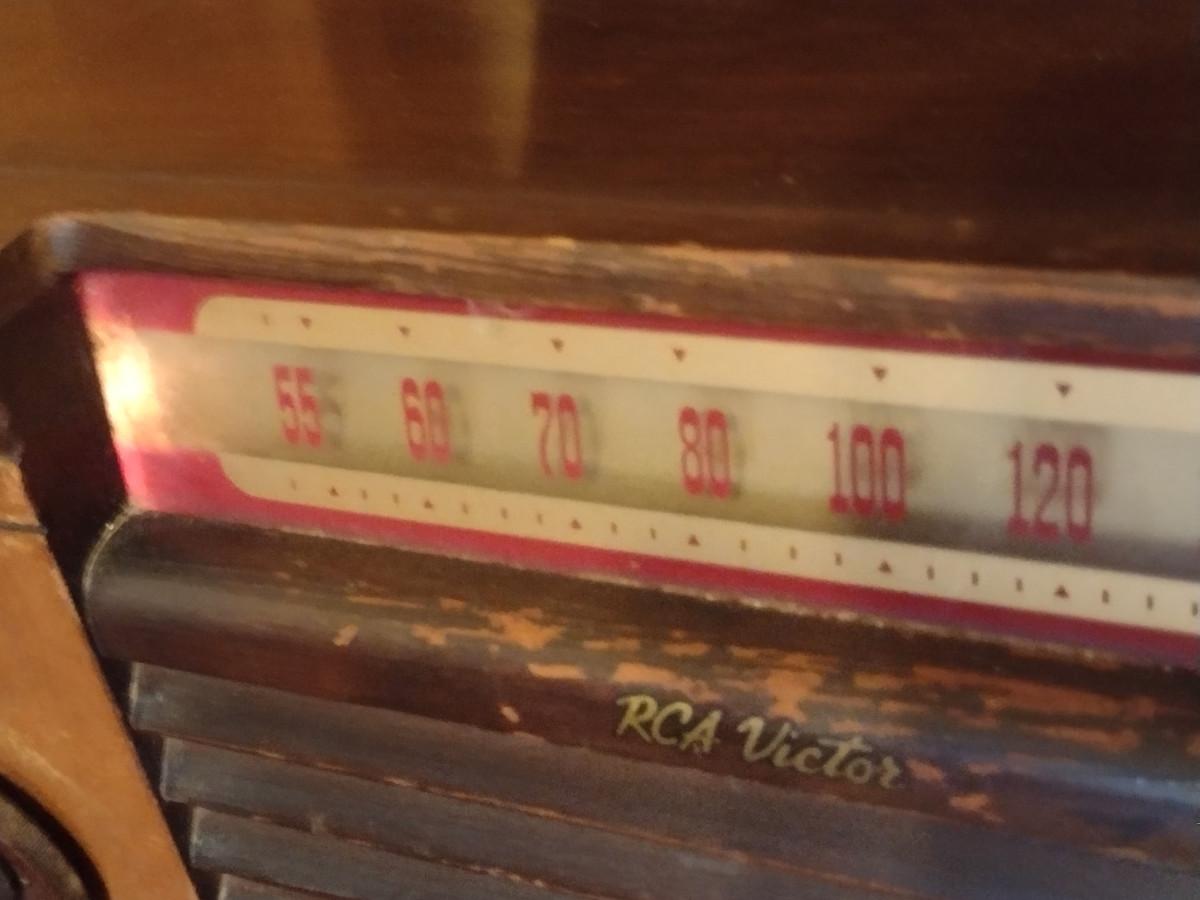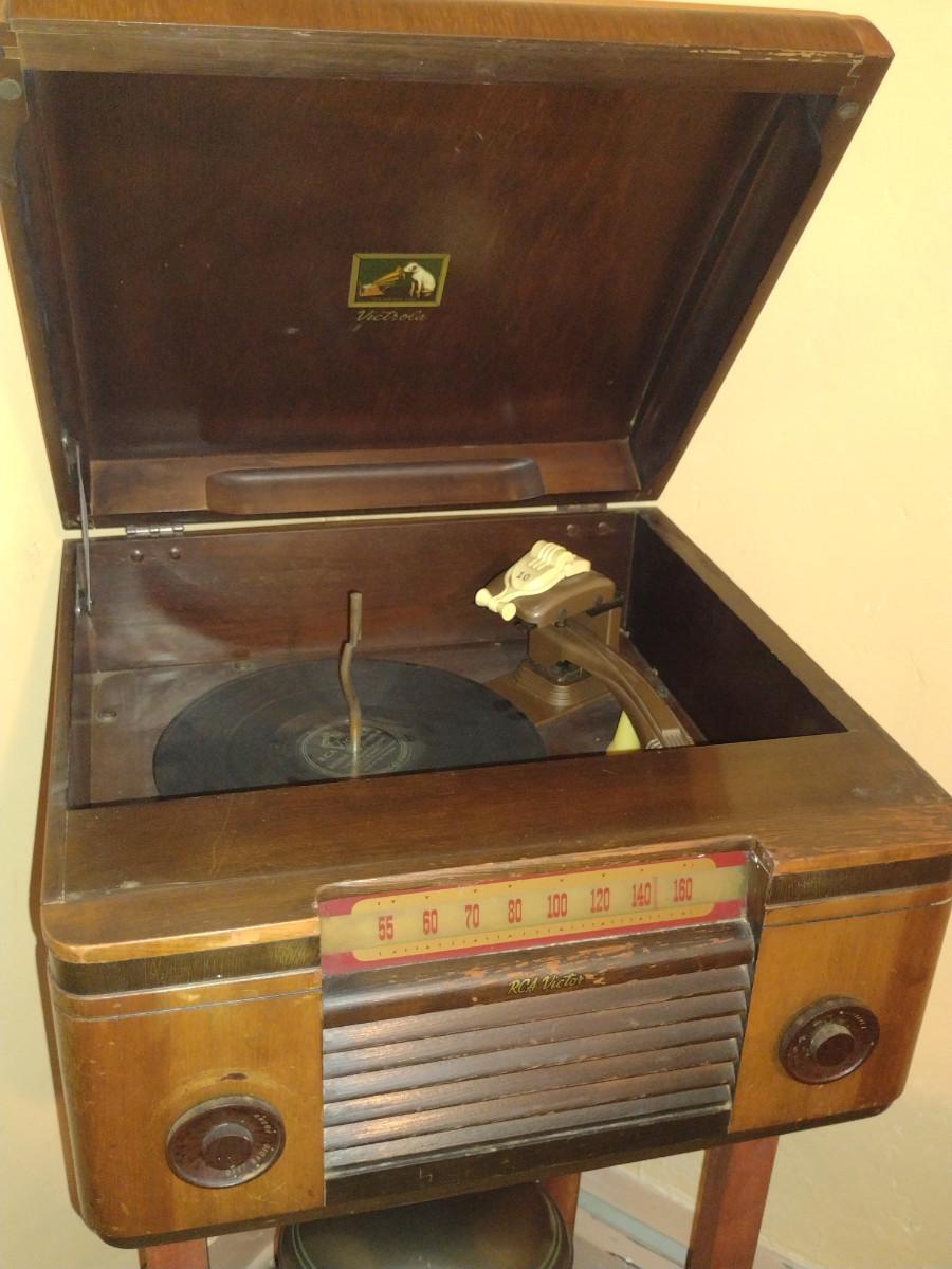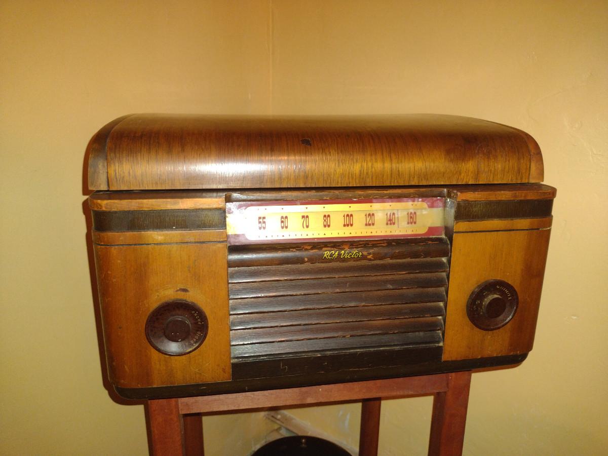 Vintage Wood Cased RCA Victor Radio/Record Player. Item powers on, record player turns, and radio works.