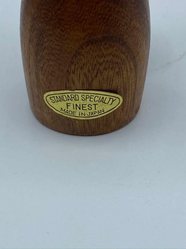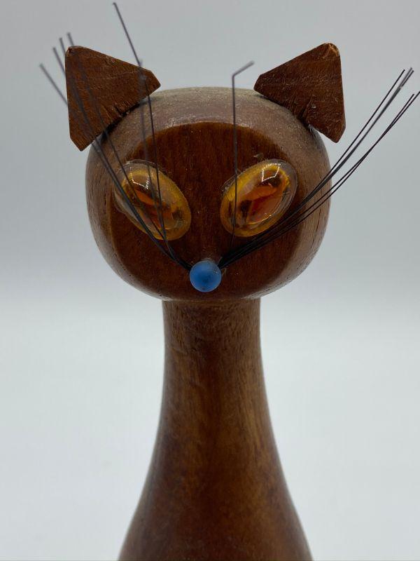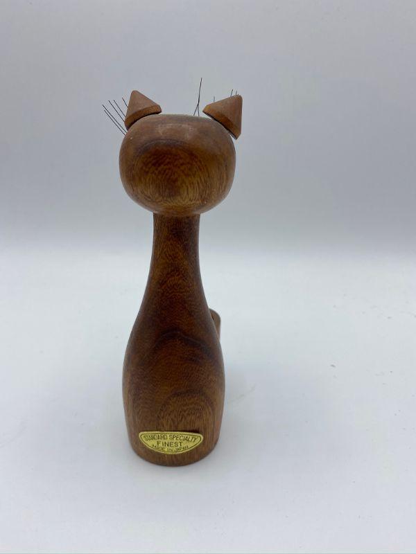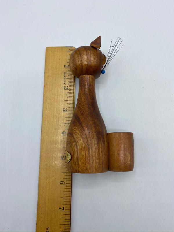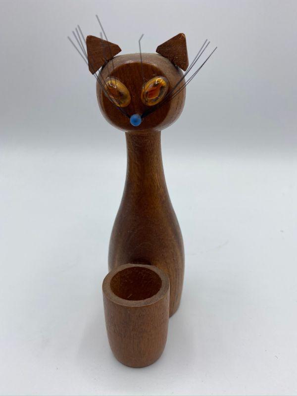 Vintage Mid Century Wood Cat Toothpick Holder. Made in Japan. Whiskers are a little bent upwards but in good condition. Under 6" tall.