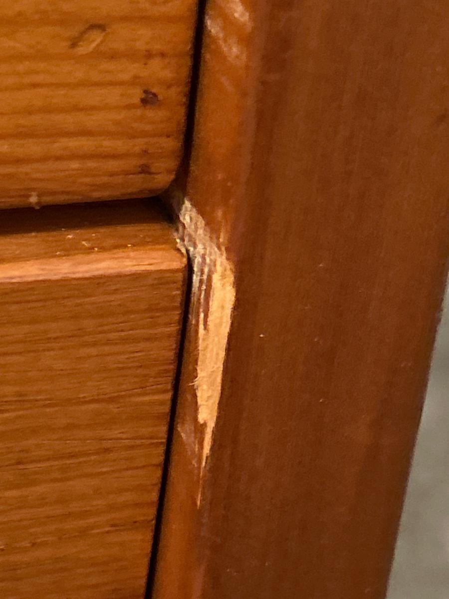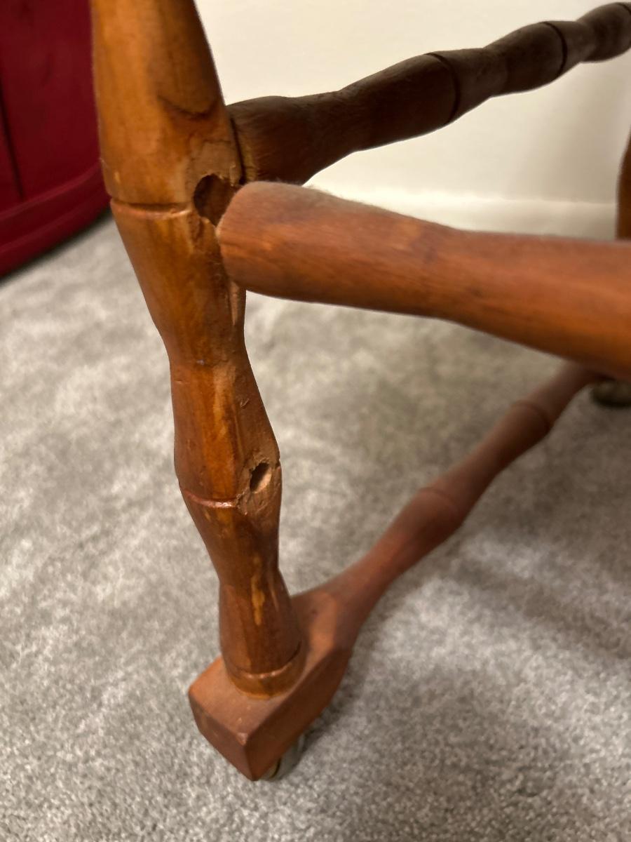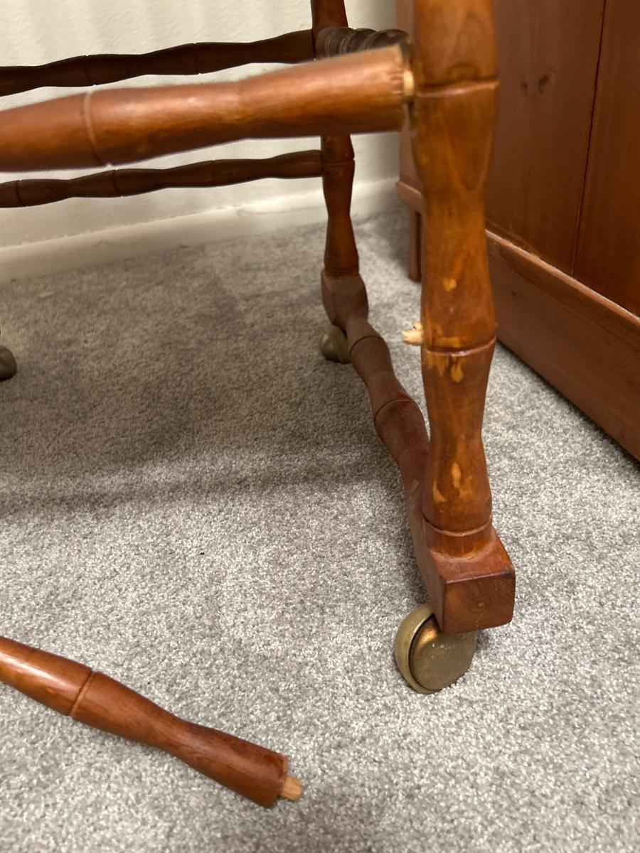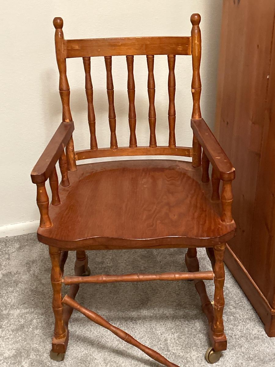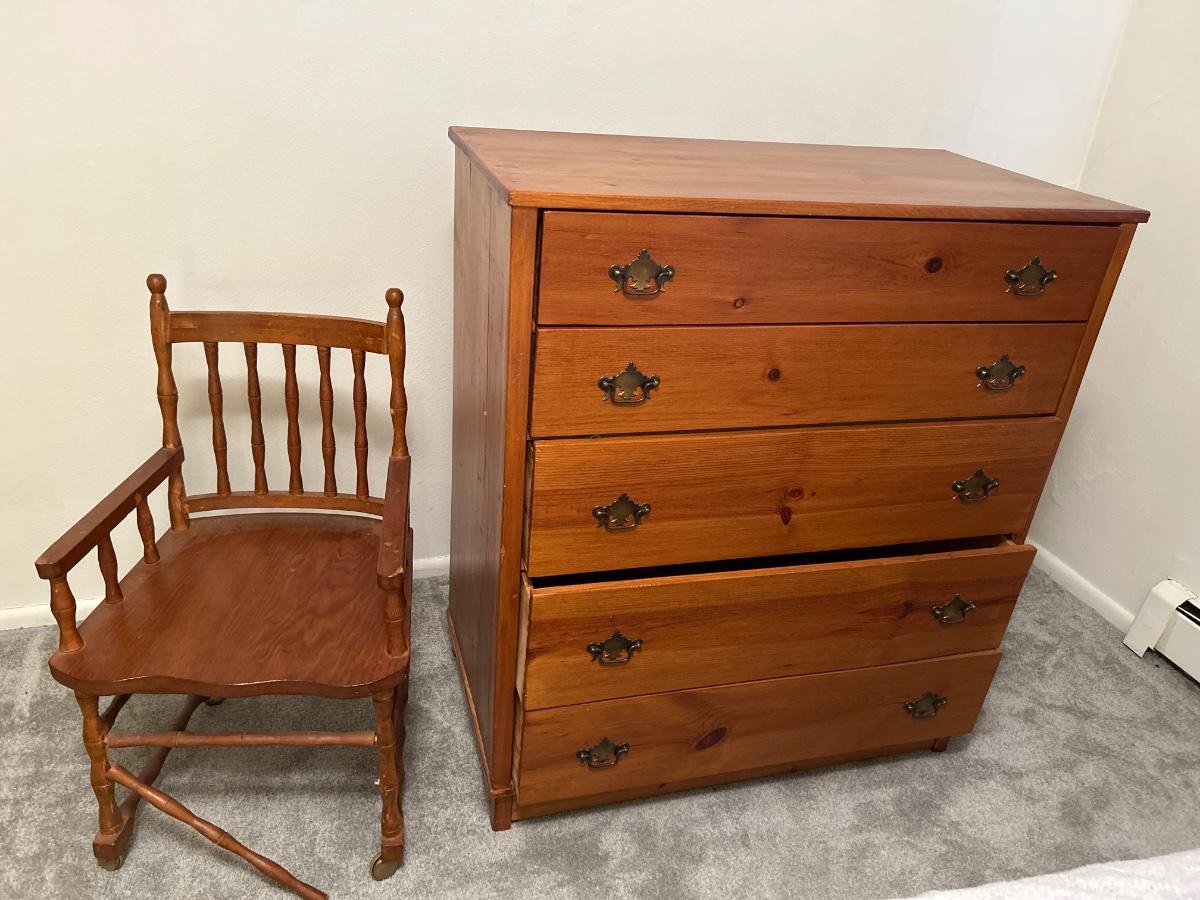 This is a cute & unique chair, as it has wheels, it needs the one dowel reattached, and the one above it has one side out that needs to be reattached, but other than that, it is adorable, and the dresser is thick wood & heavy! See pics of sides Dresser is: 39” L x 20.5” D x 44.5” T chair is 35.5” tall & 20” Wide