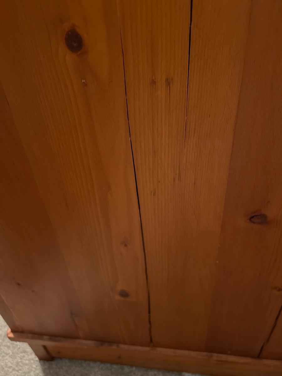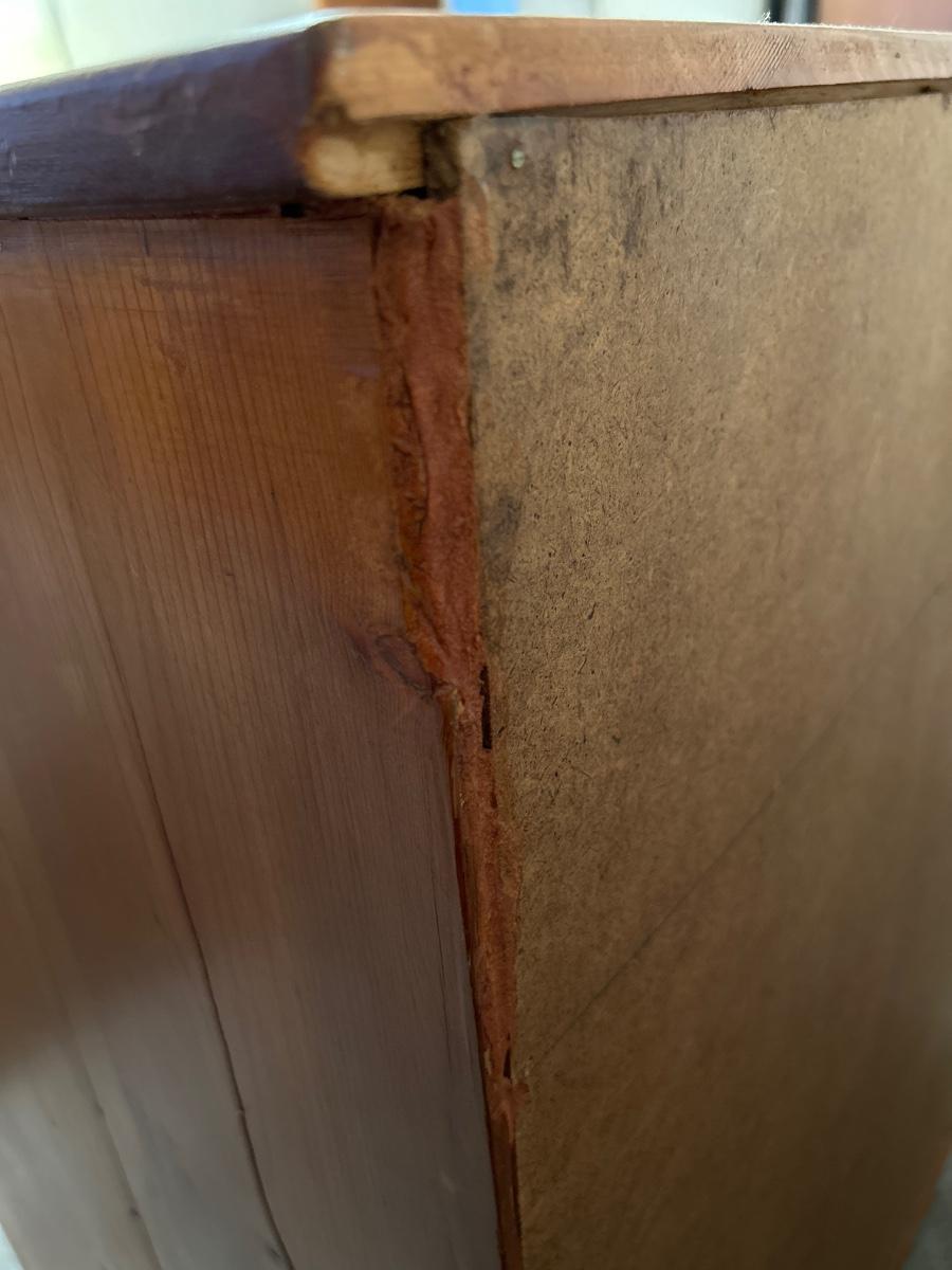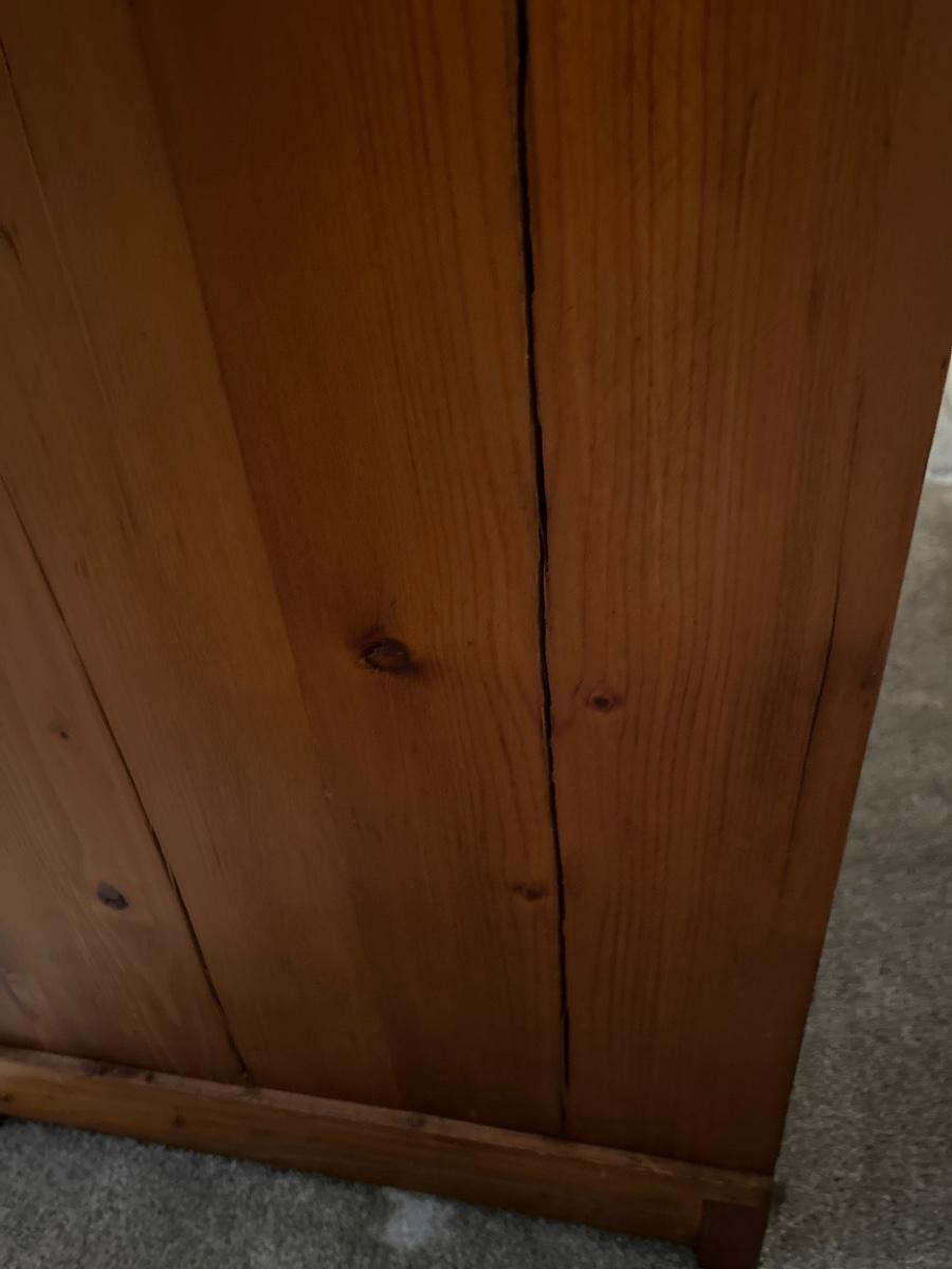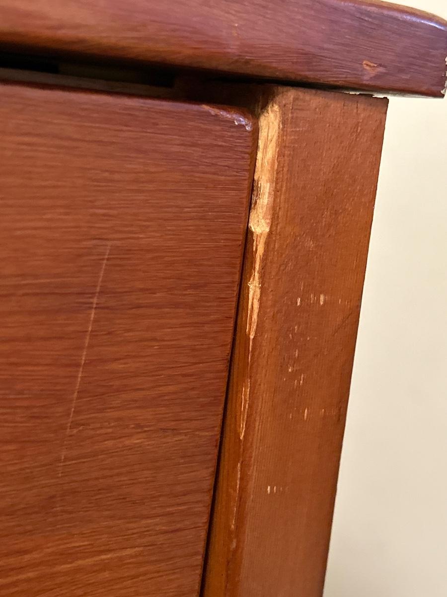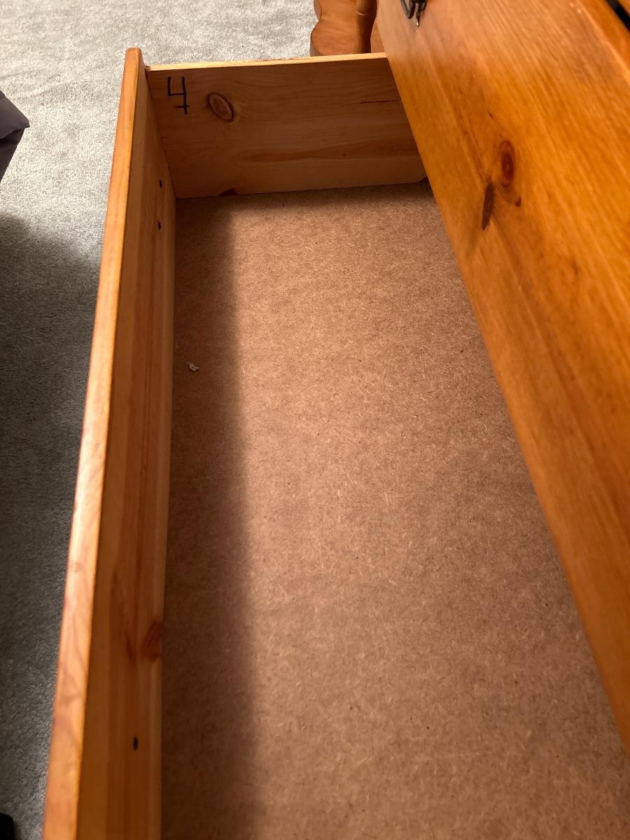 This is a cute & unique chair, as it has wheels, it needs the one dowel reattached, and the one above it has one side out that needs to be reattached, but other than that, it is adorable, and the dresser is thick wood & heavy! See pics of sides Dresser is: 39” L x 20.5” D x 44.5” T chair is 35.5” tall & 20” Wide