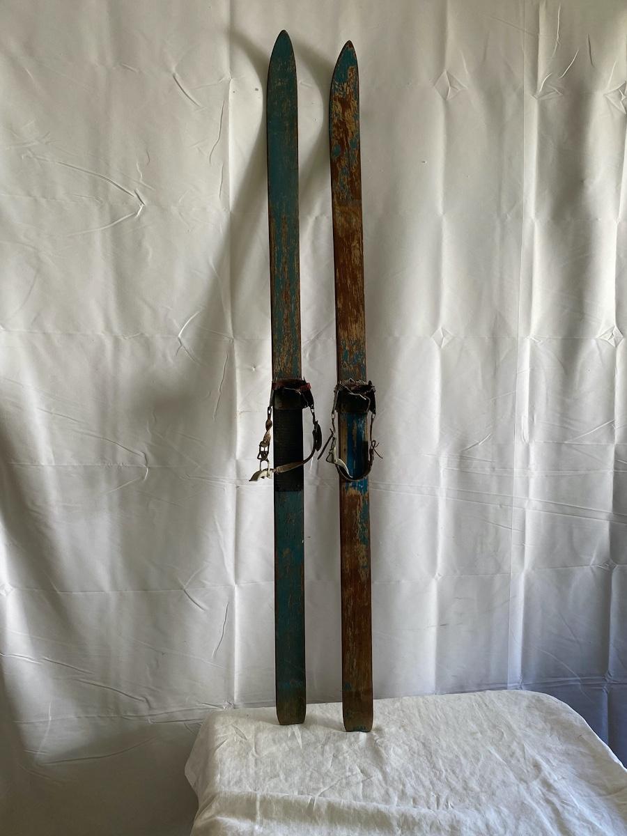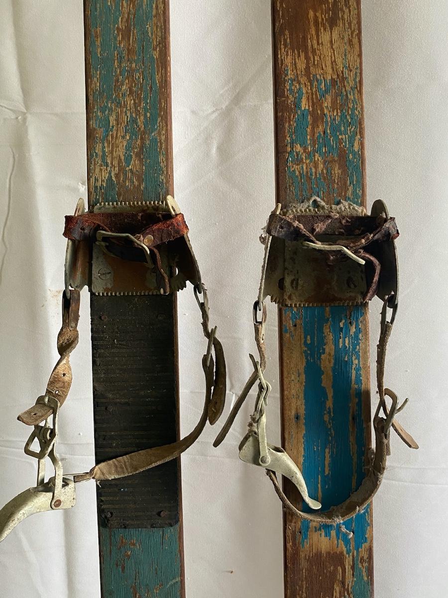 Pair of wood cross country skis with original metal and leather strap bindings. Lovely rustic paint.
