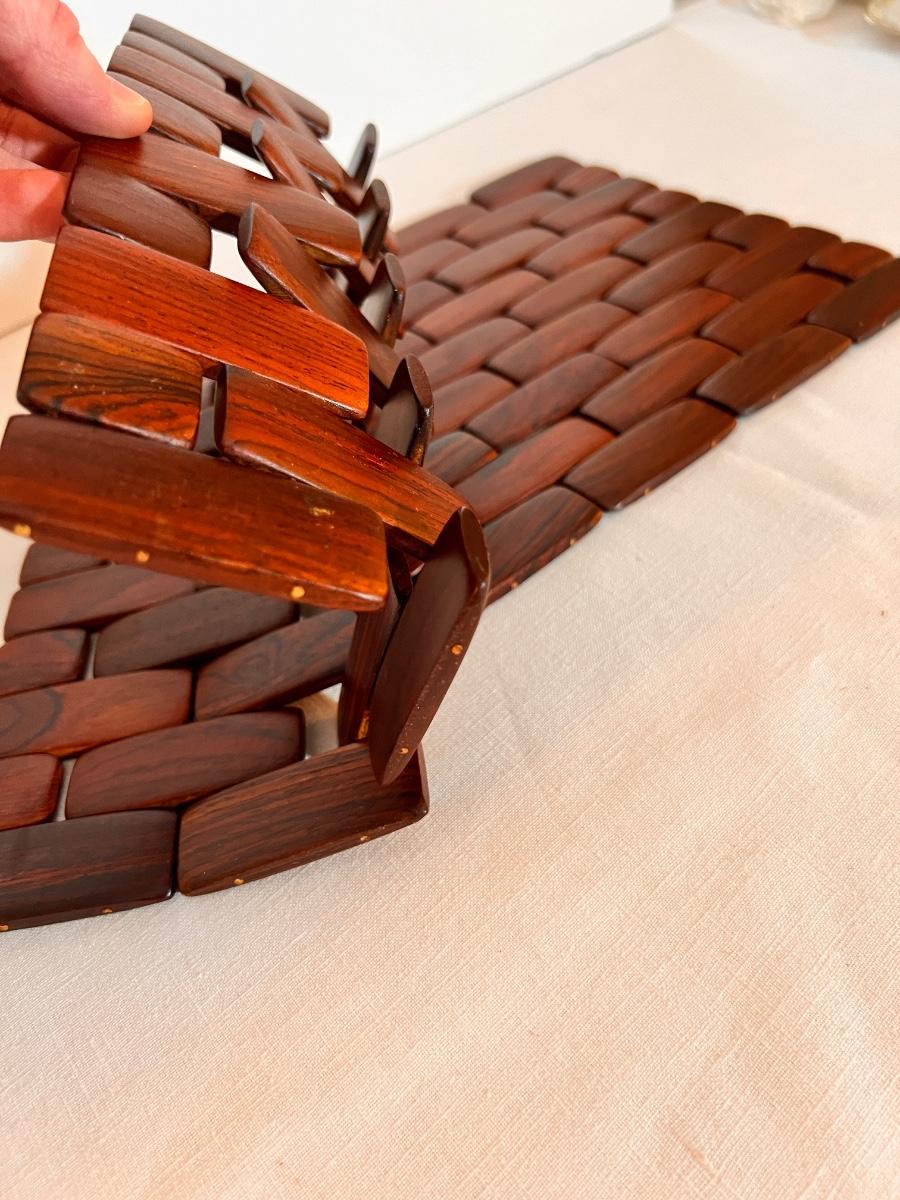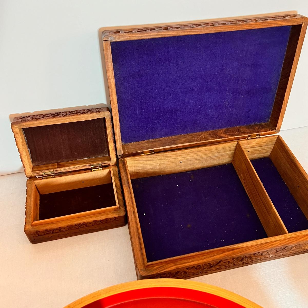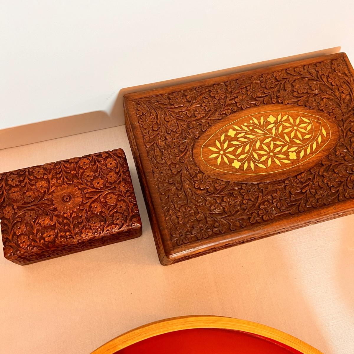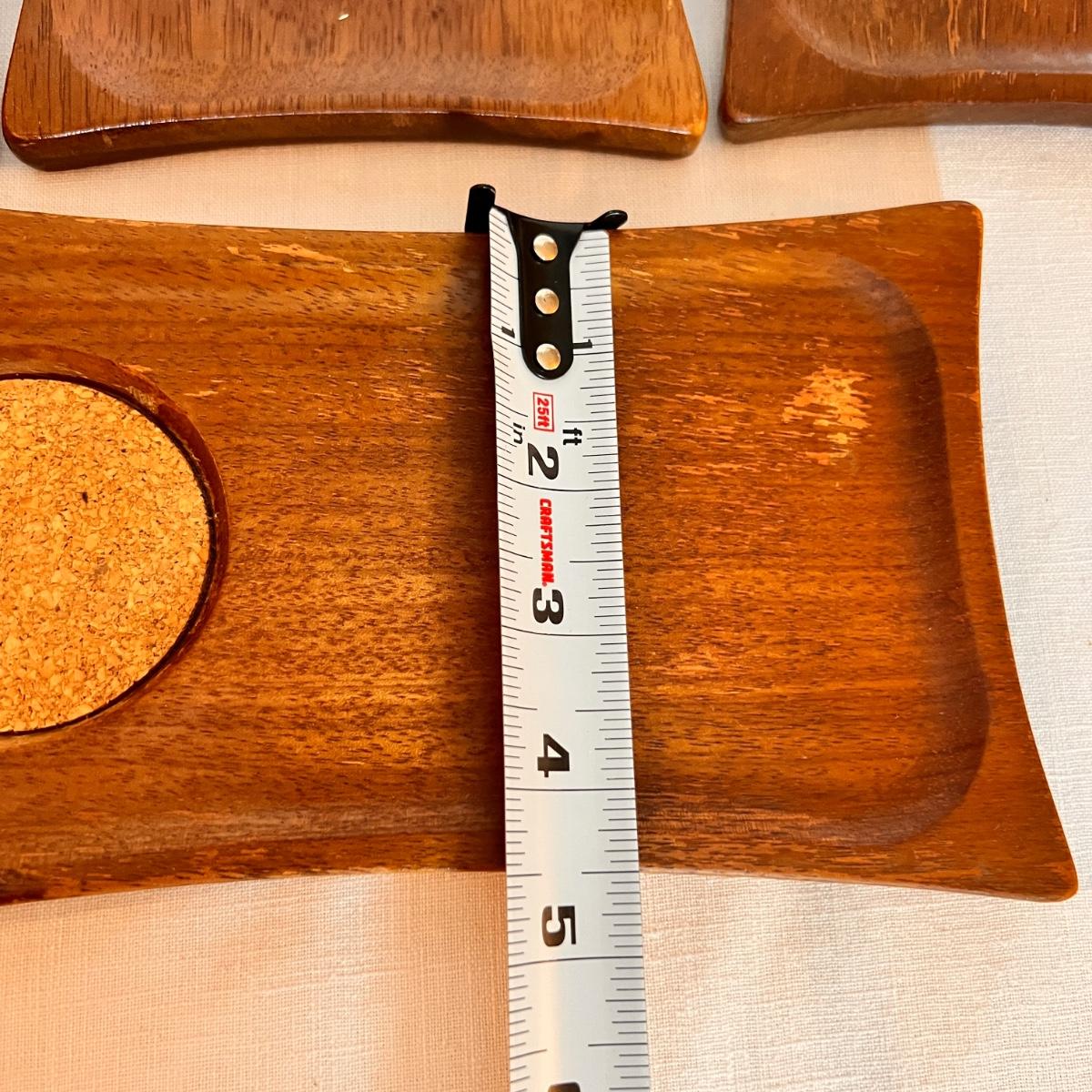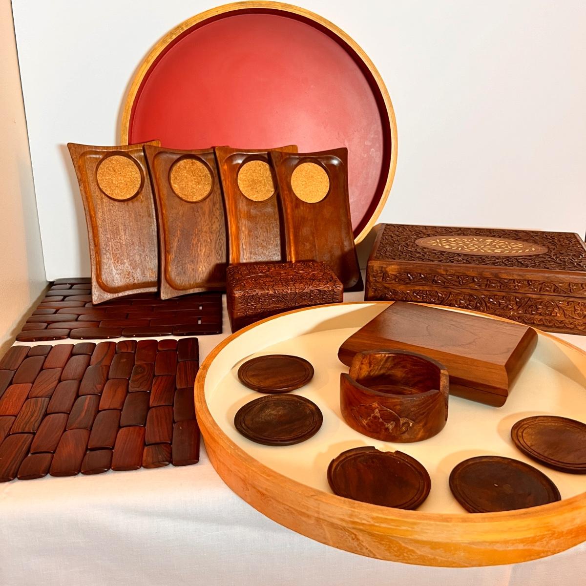 Alcraft walnut wood box, 4 MCM snack and drink trays, 2 16” wood trays, 2 carved wood boxes, 2 foldable wood mats, wooden coasters with carved holder (1 coaster has chip).
