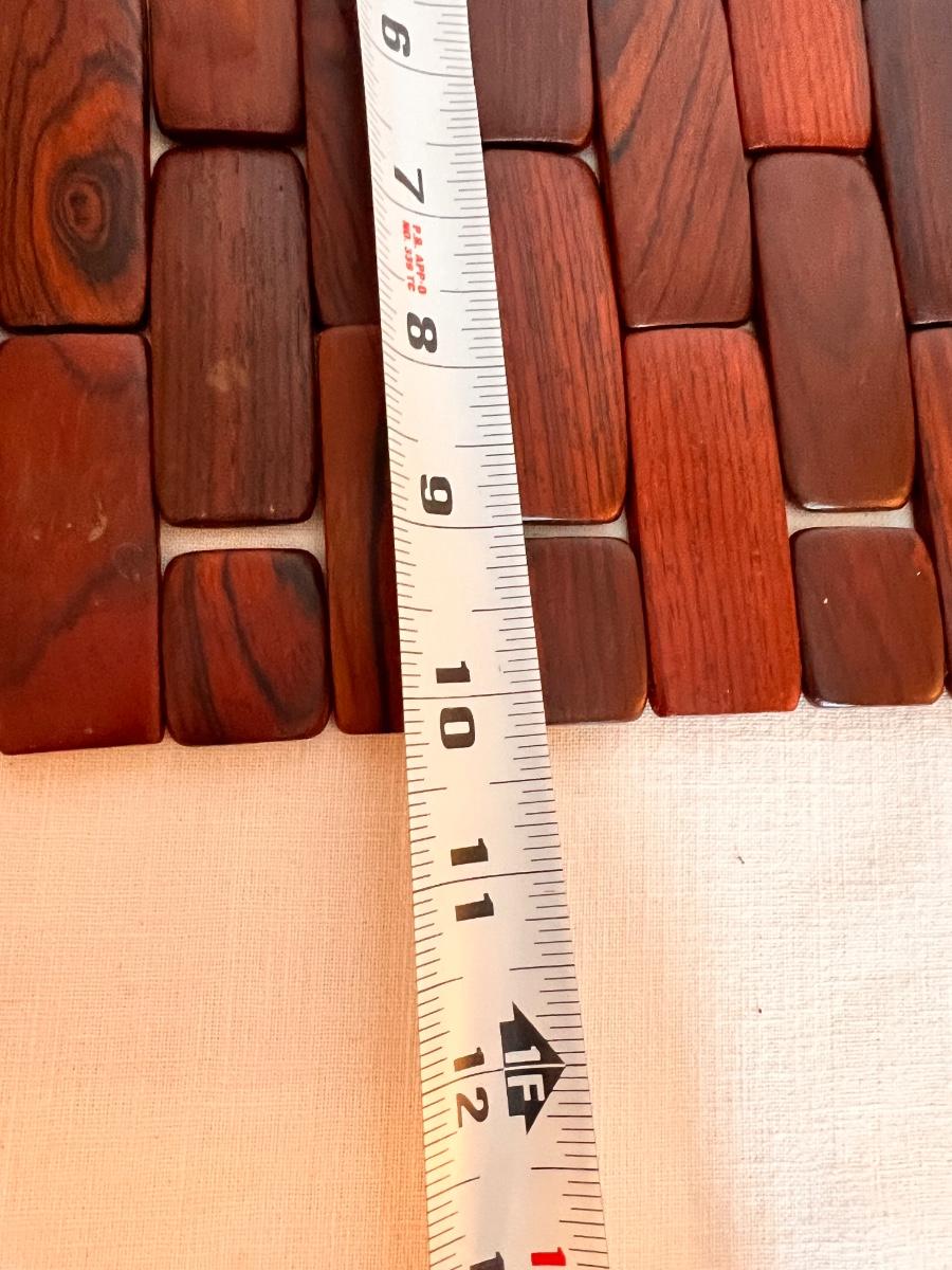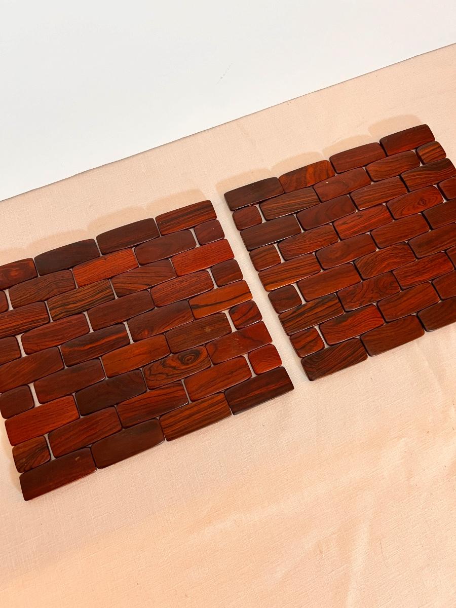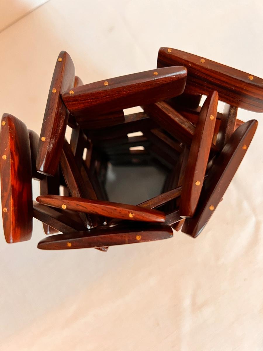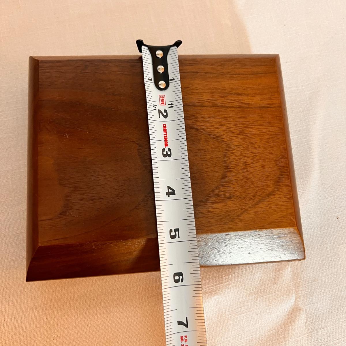 Alcraft walnut wood box, 4 MCM snack and drink trays, 2 16” wood trays, 2 carved wood boxes, 2 foldable wood mats, wooden coasters with carved holder (1 coaster has chip).