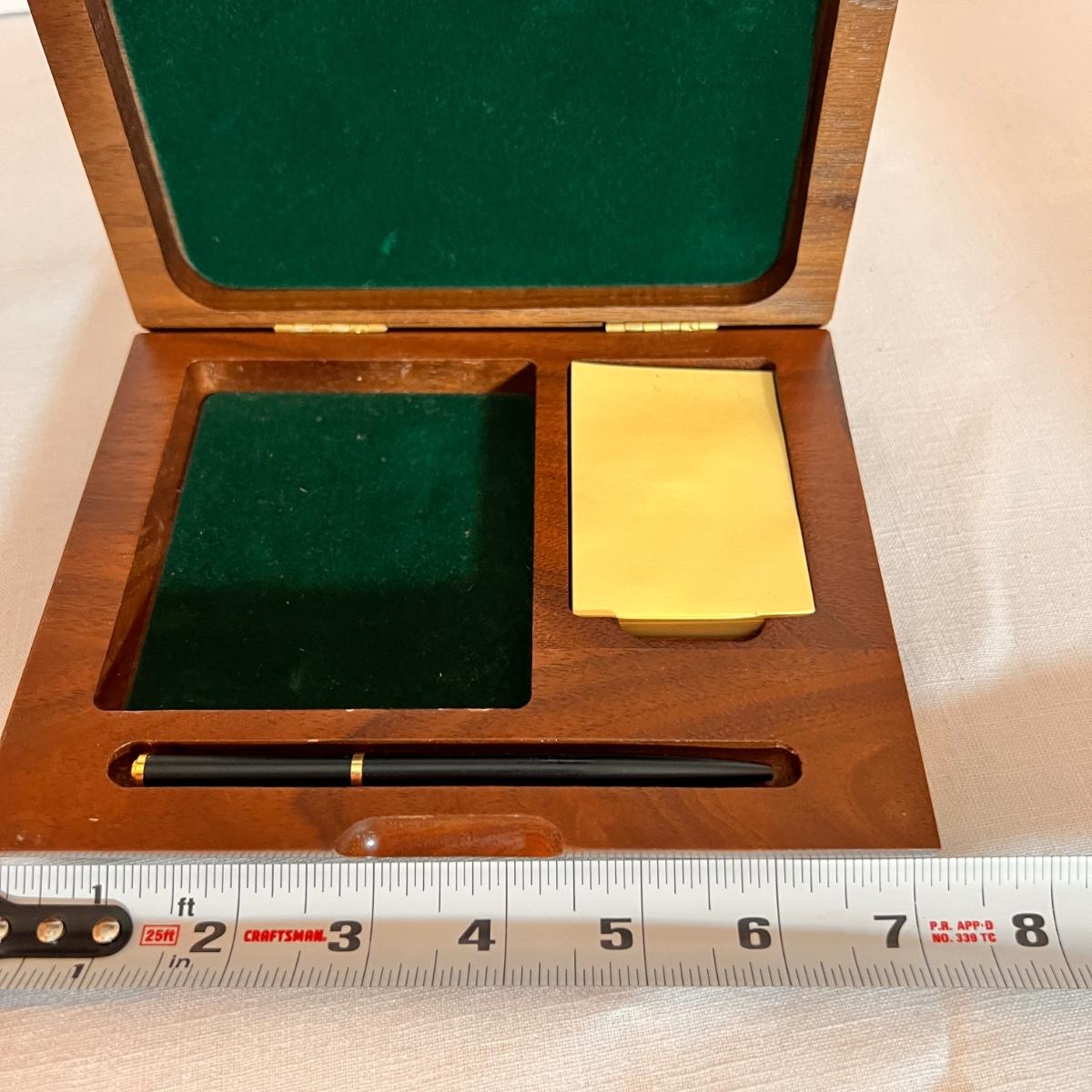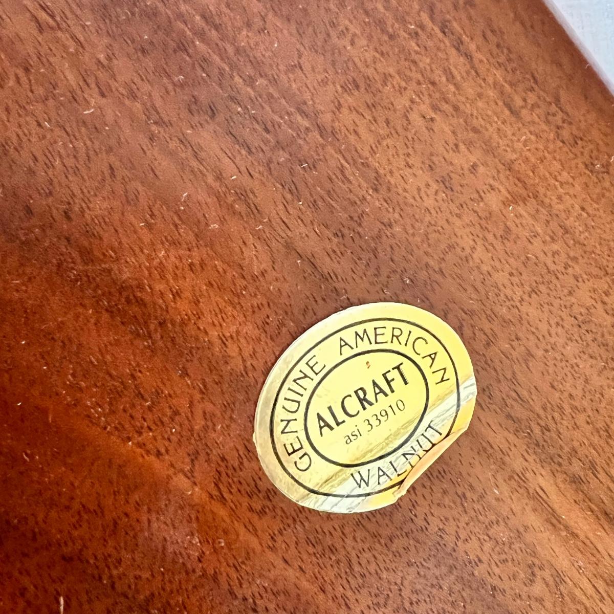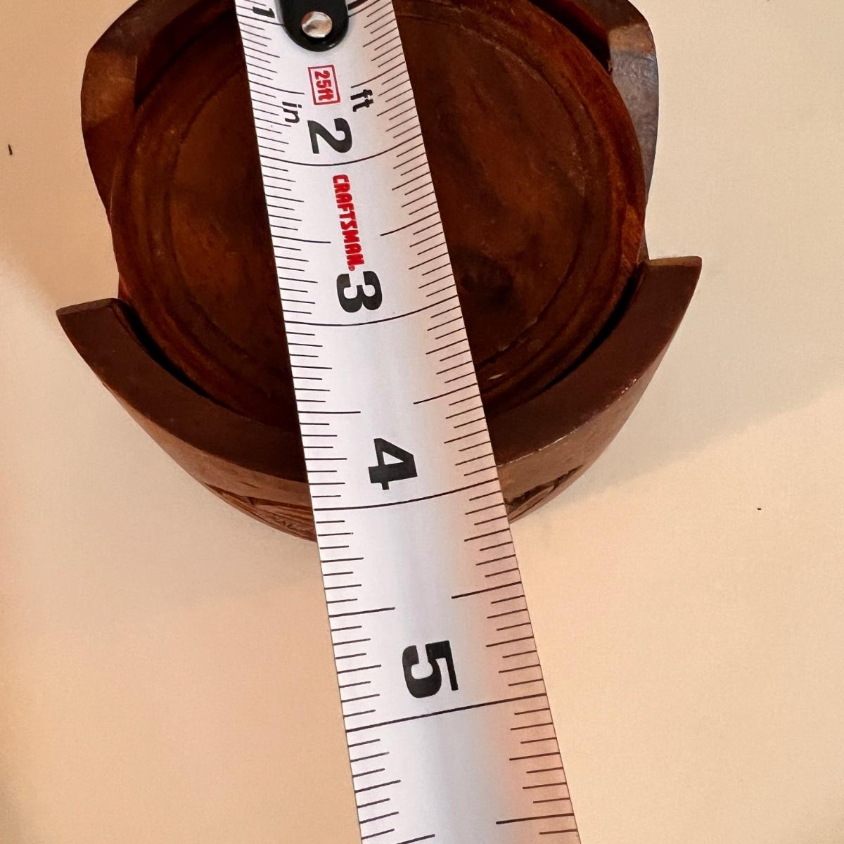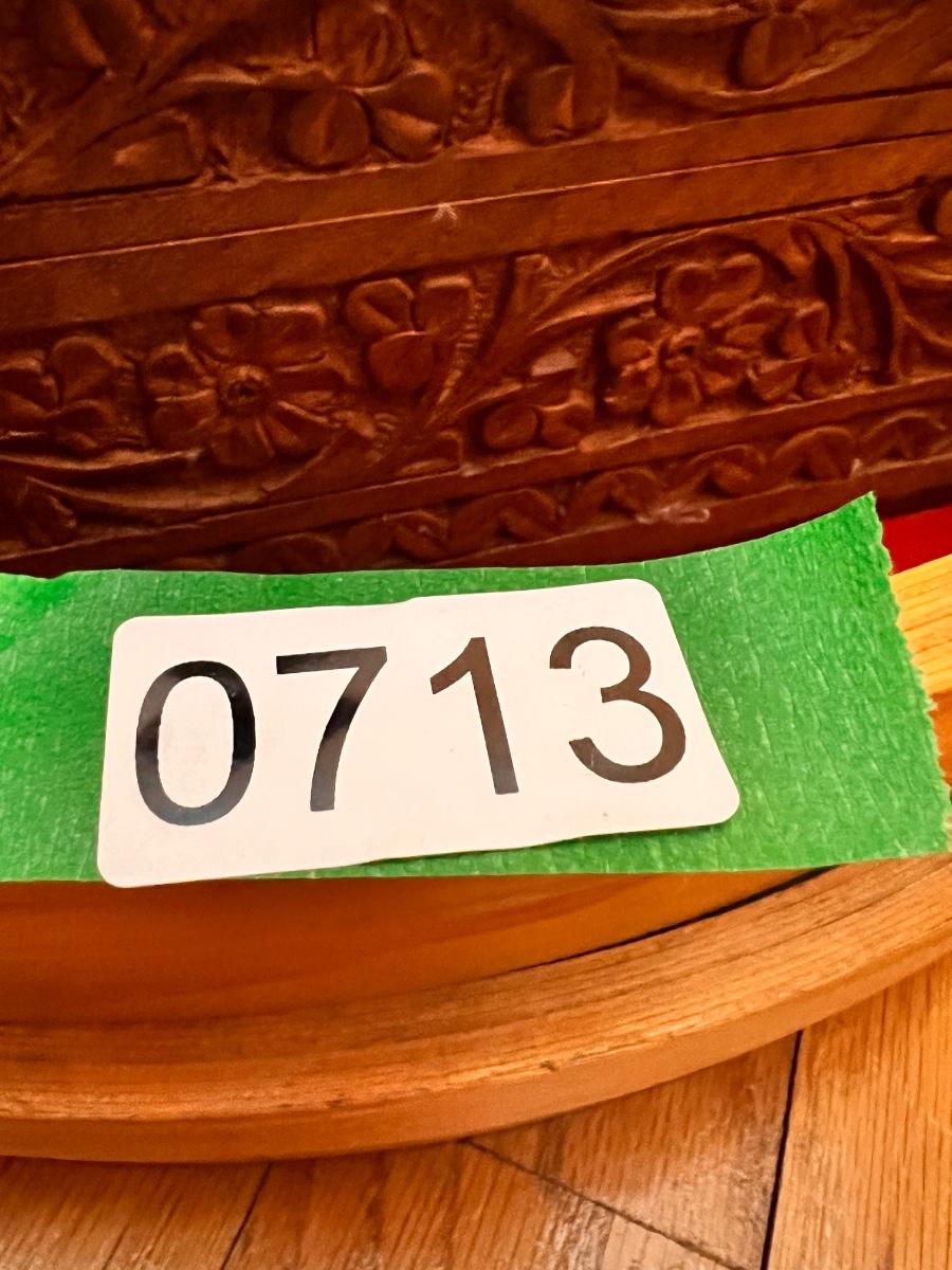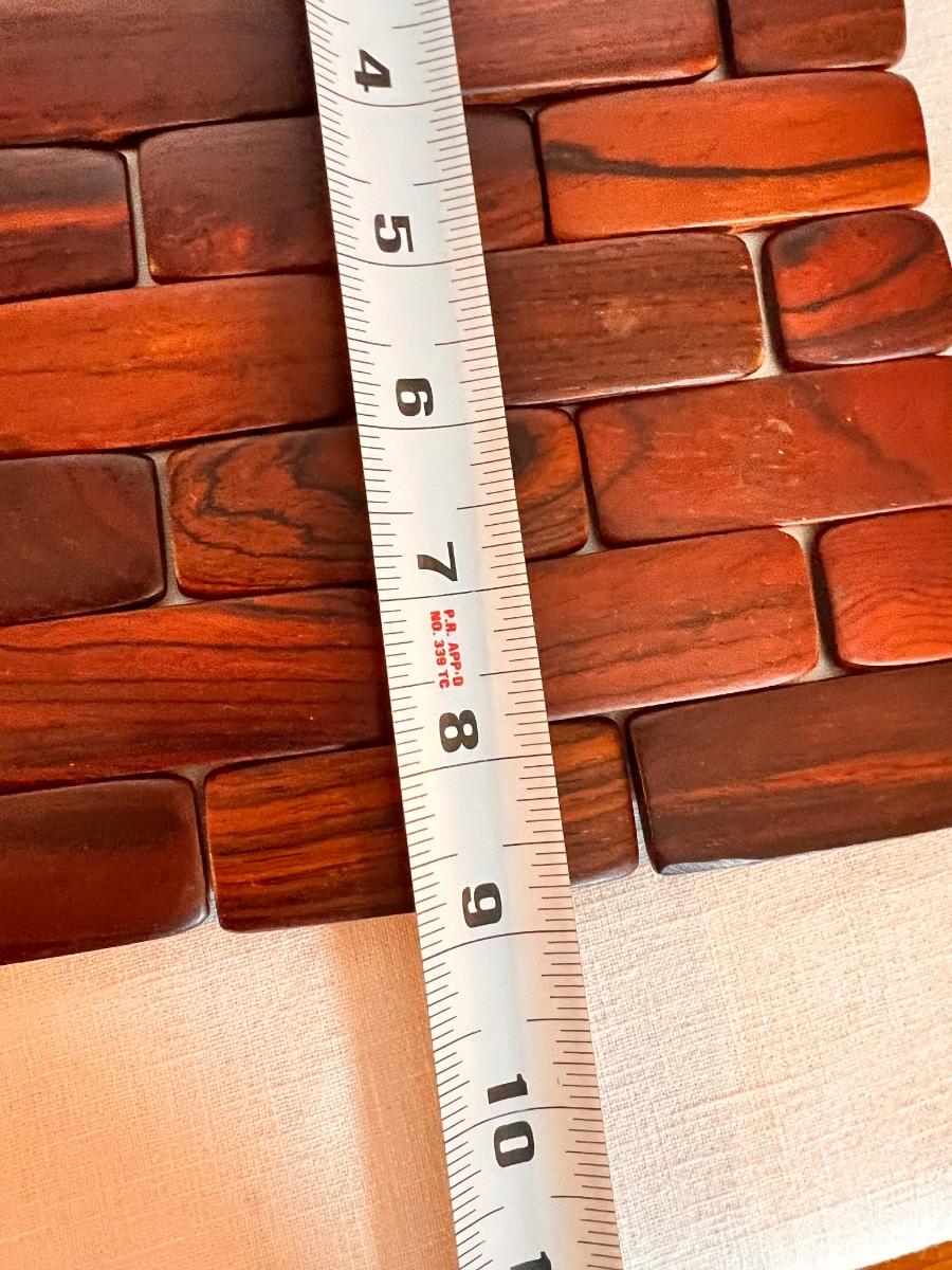 Alcraft walnut wood box, 4 MCM snack and drink trays, 2 16” wood trays, 2 carved wood boxes, 2 foldable wood mats, wooden coasters with carved holder (1 coaster has chip).