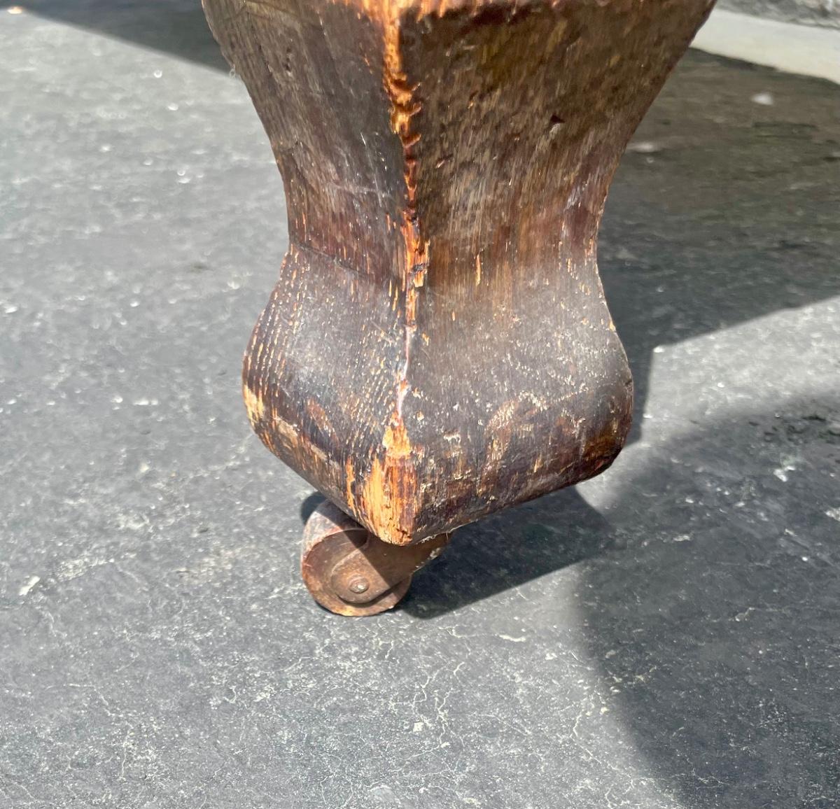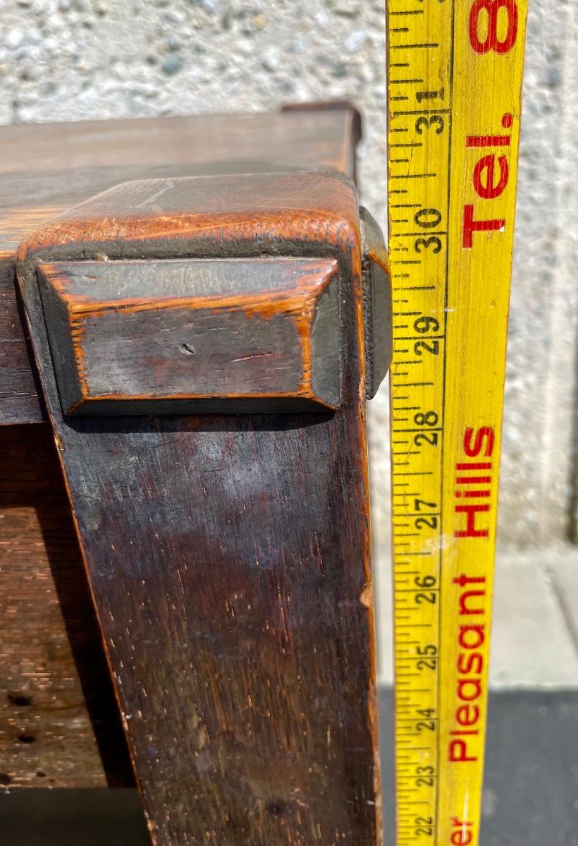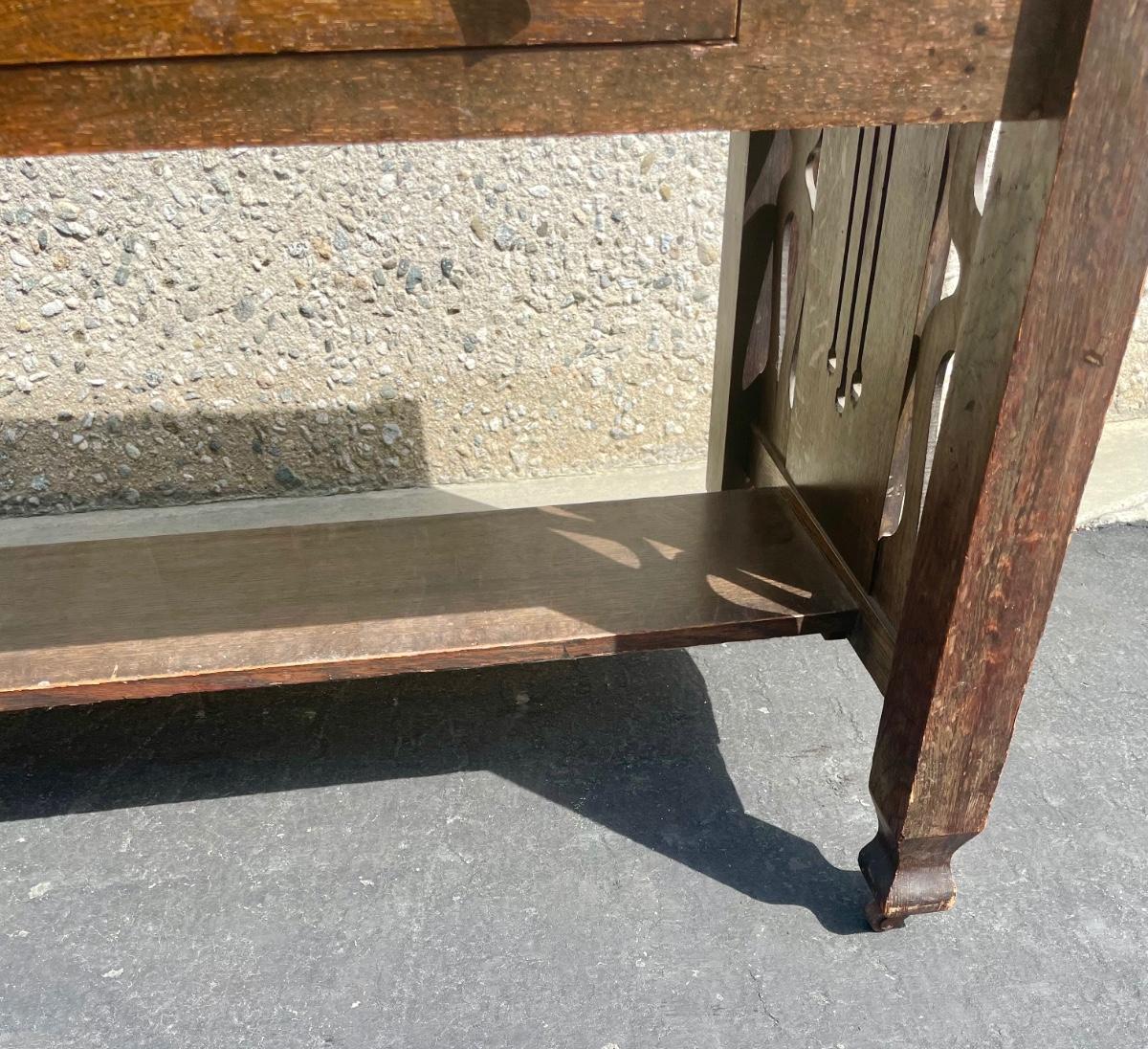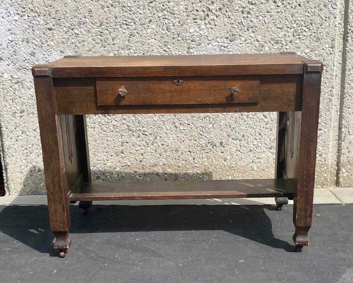 Solid, dark stained wood. Single under-top drawer. Approx. 42" long, 30" tall, and 23" deep. Finish is worn on the top, could use a refinishing. Small solid brass wheels under each leg.