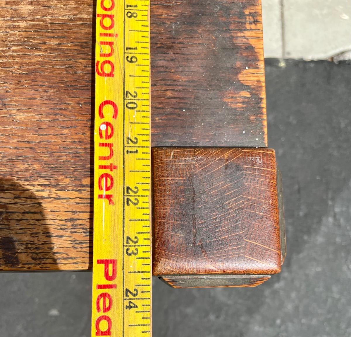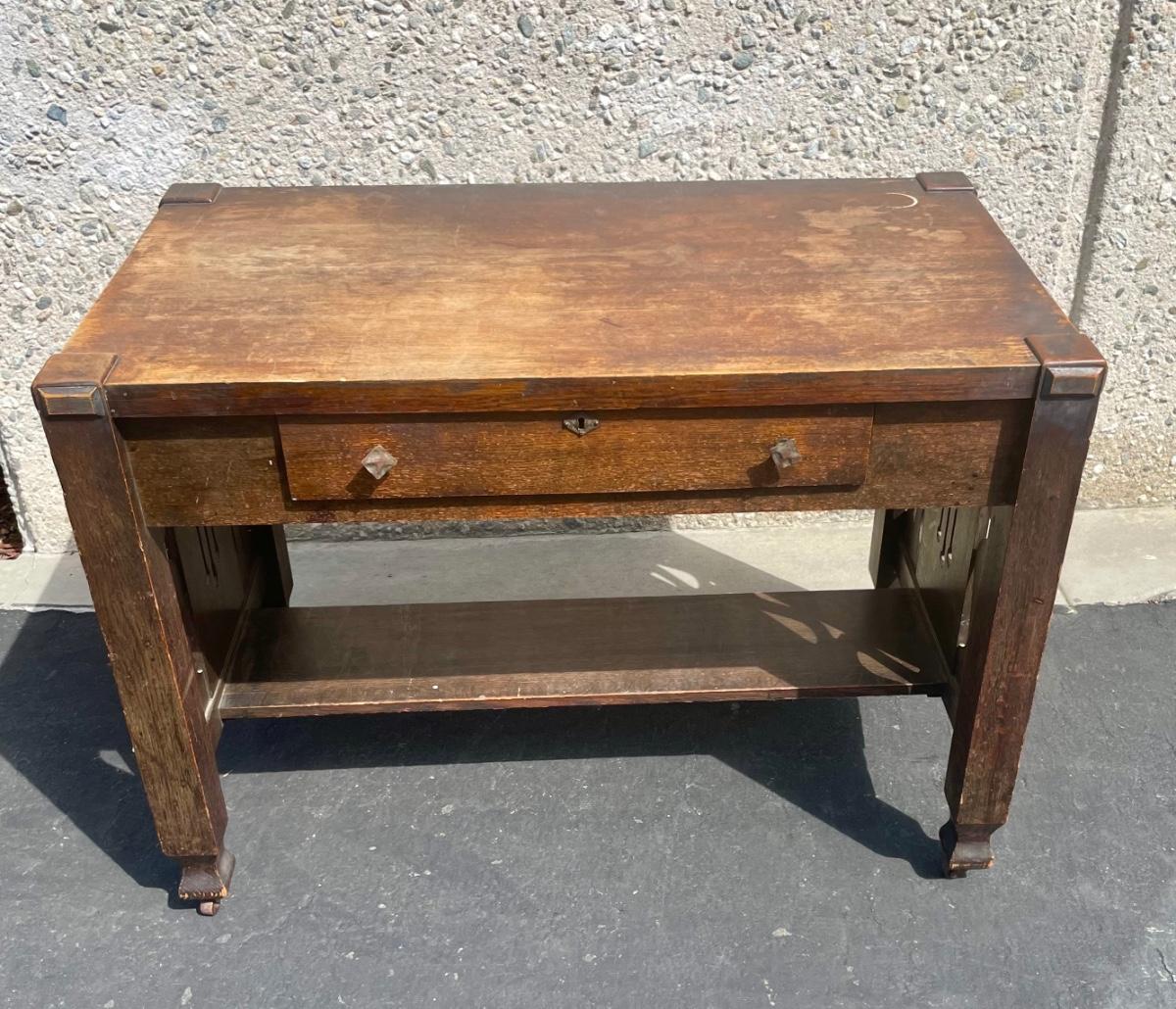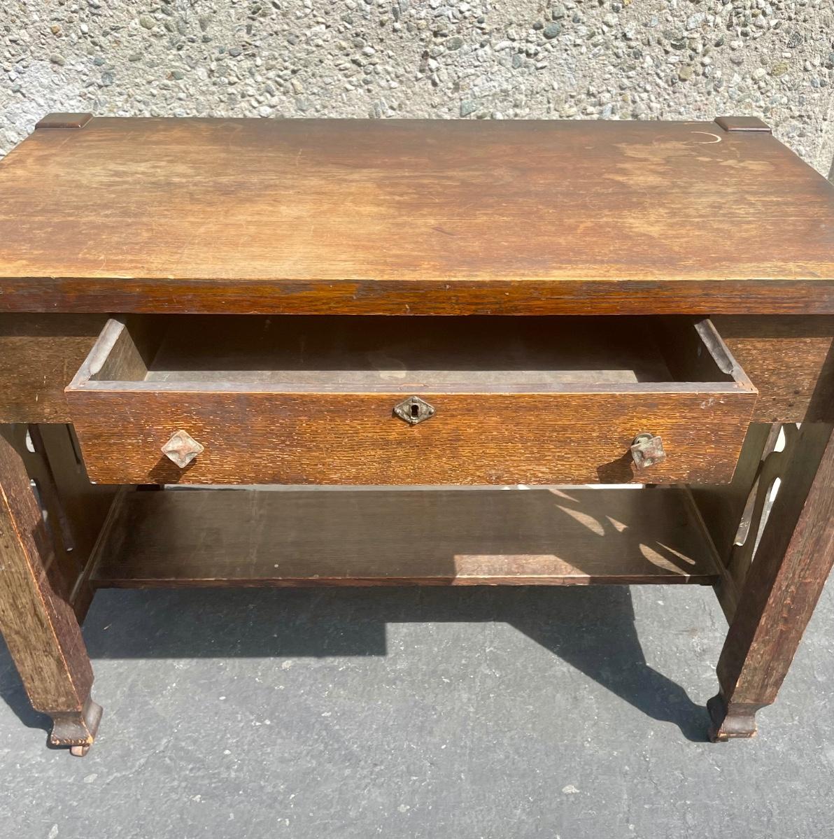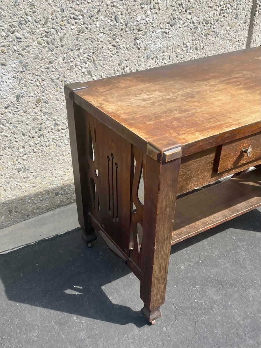 Solid, dark stained wood. Single under-top drawer. Approx. 42" long, 30" tall, and 23" deep. Finish is worn on the top, could use a refinishing. Small solid brass wheels under each leg.