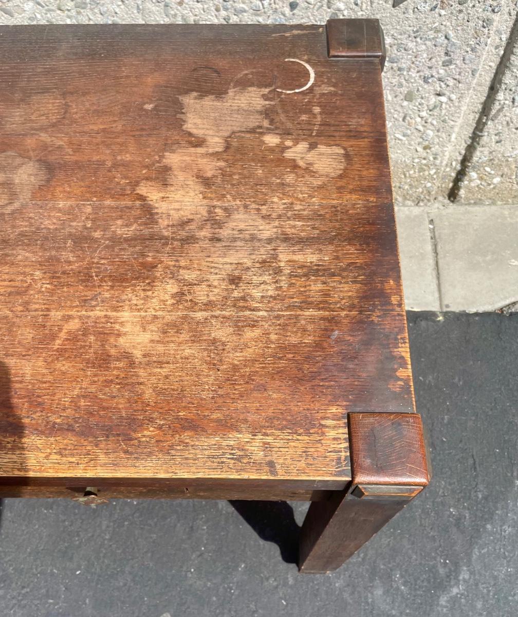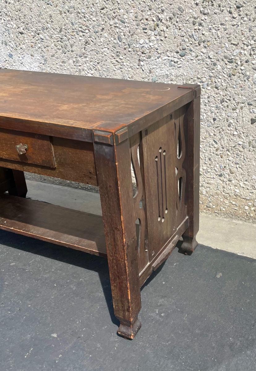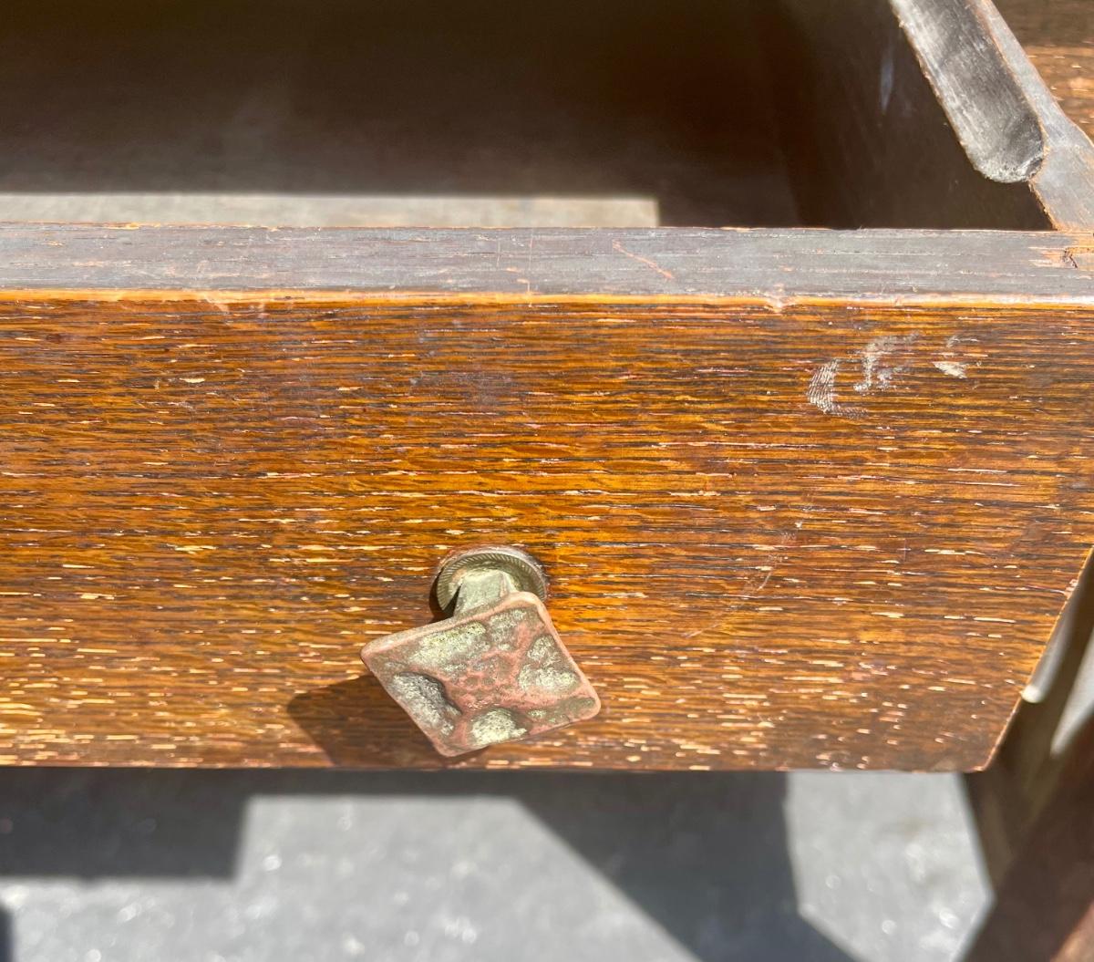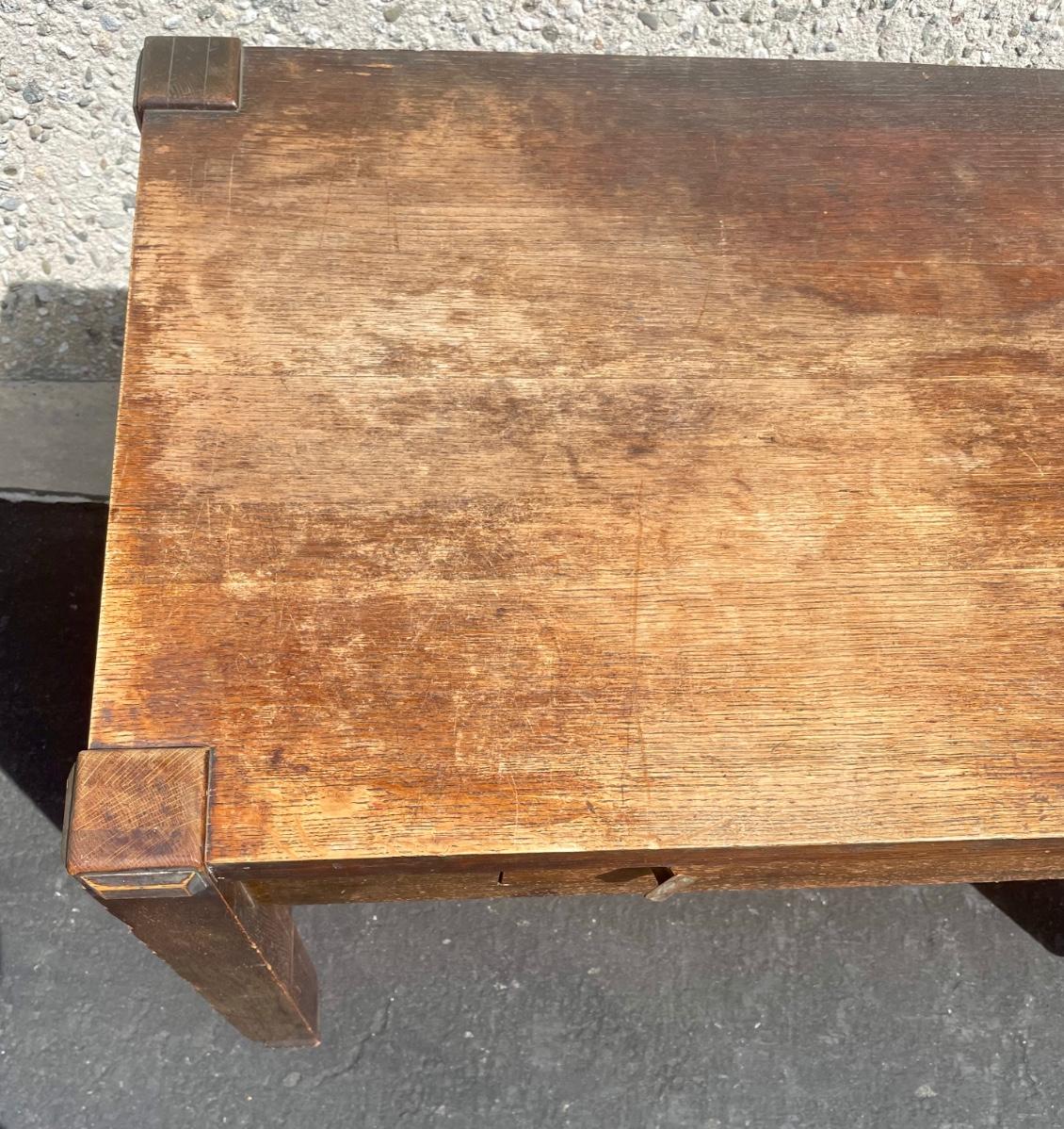 Solid, dark stained wood. Single under-top drawer. Approx. 42" long, 30" tall, and 23" deep. Finish is worn on the top, could use a refinishing. Small solid brass wheels under each leg.
