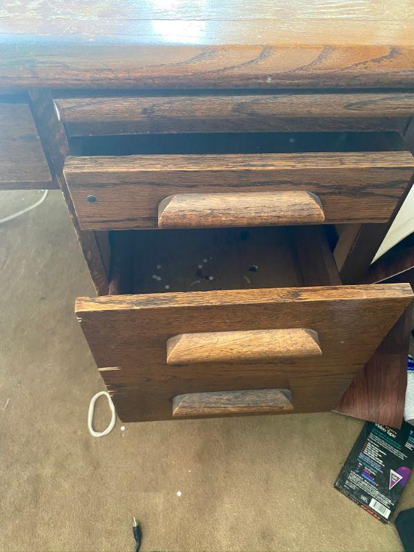 Solid wood desk. Multi drawer with pull out removable desk organizer. Has signs of use and wear. Made by Abbess Enduring Woodware. Roughly 48" W x 26" D x 30 H".