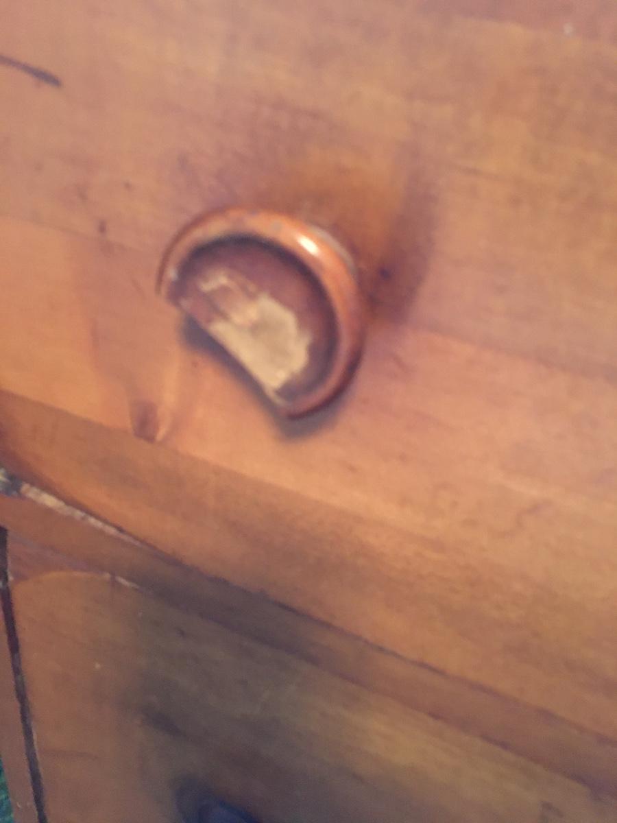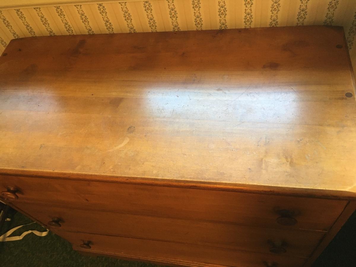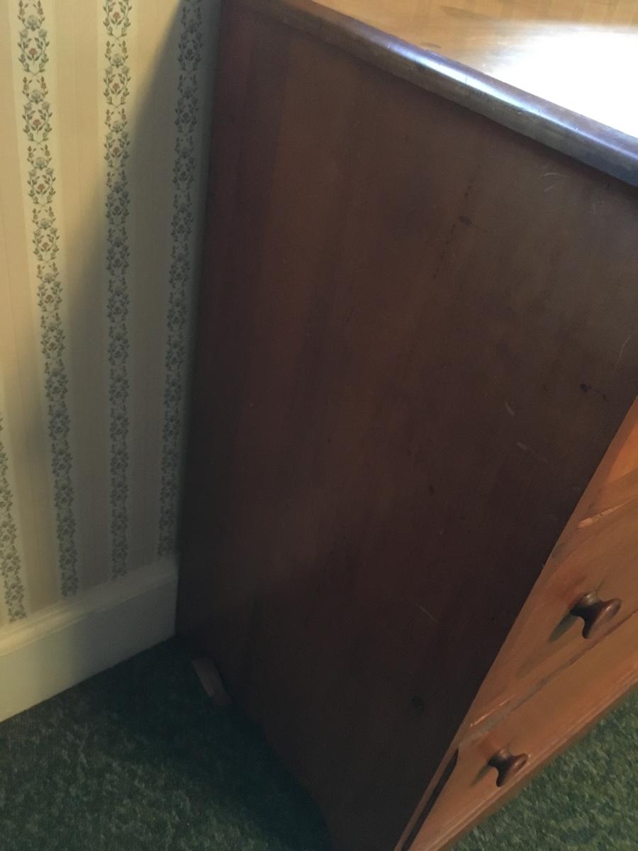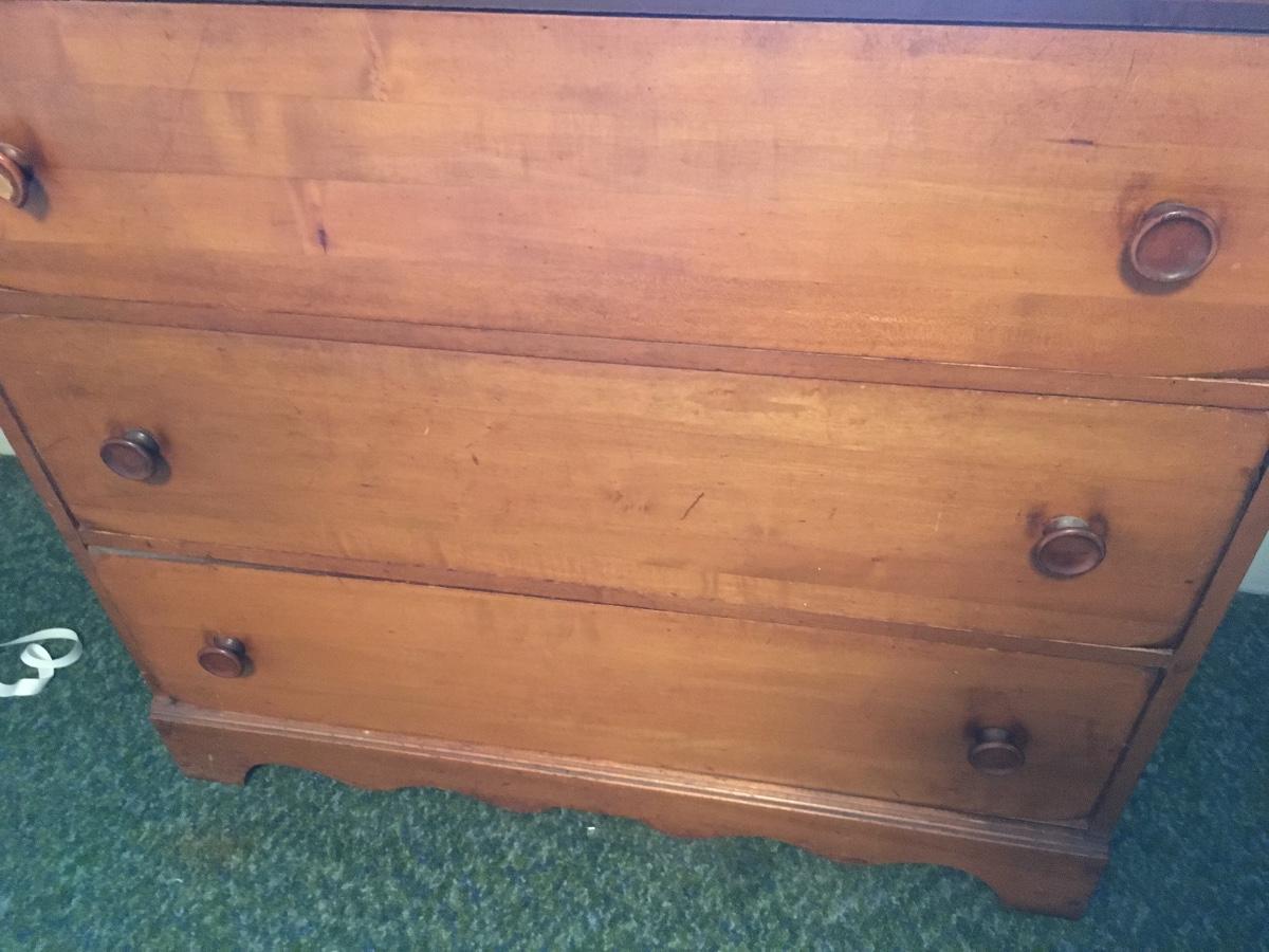 Vintage low dresser with large knobs . One is broken as shown in photograph. There is a surface wear.