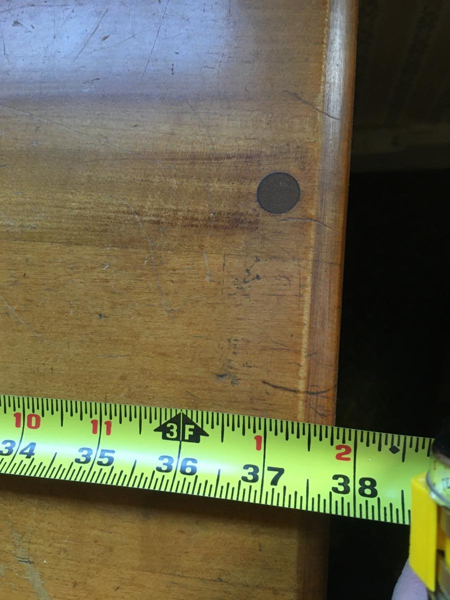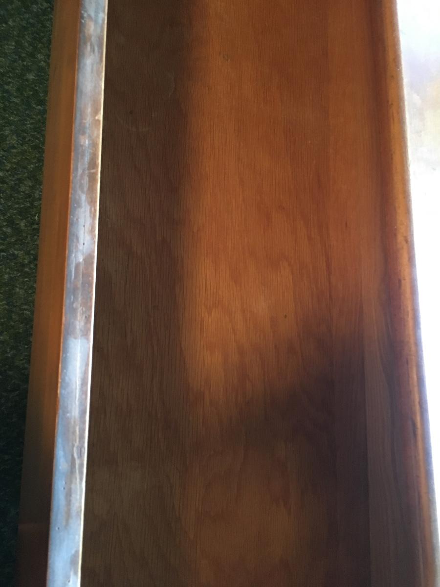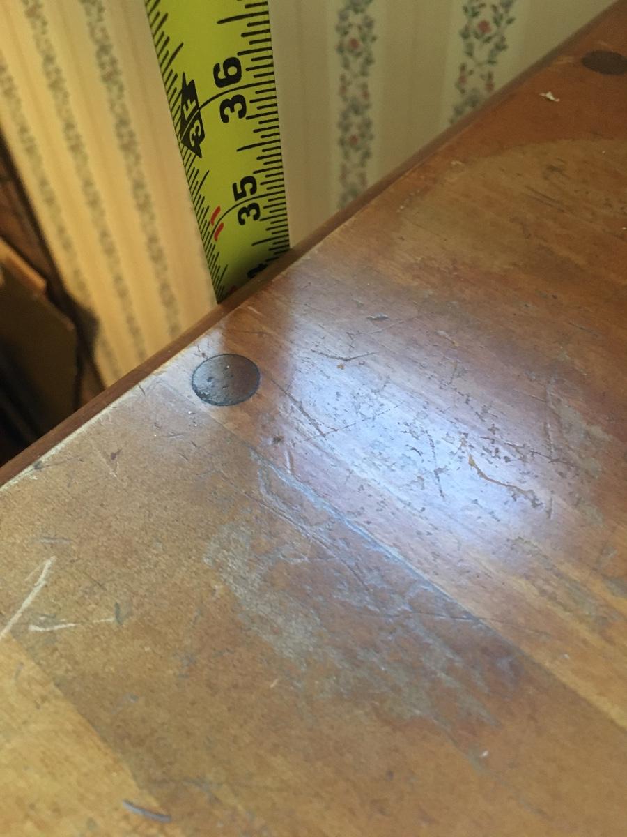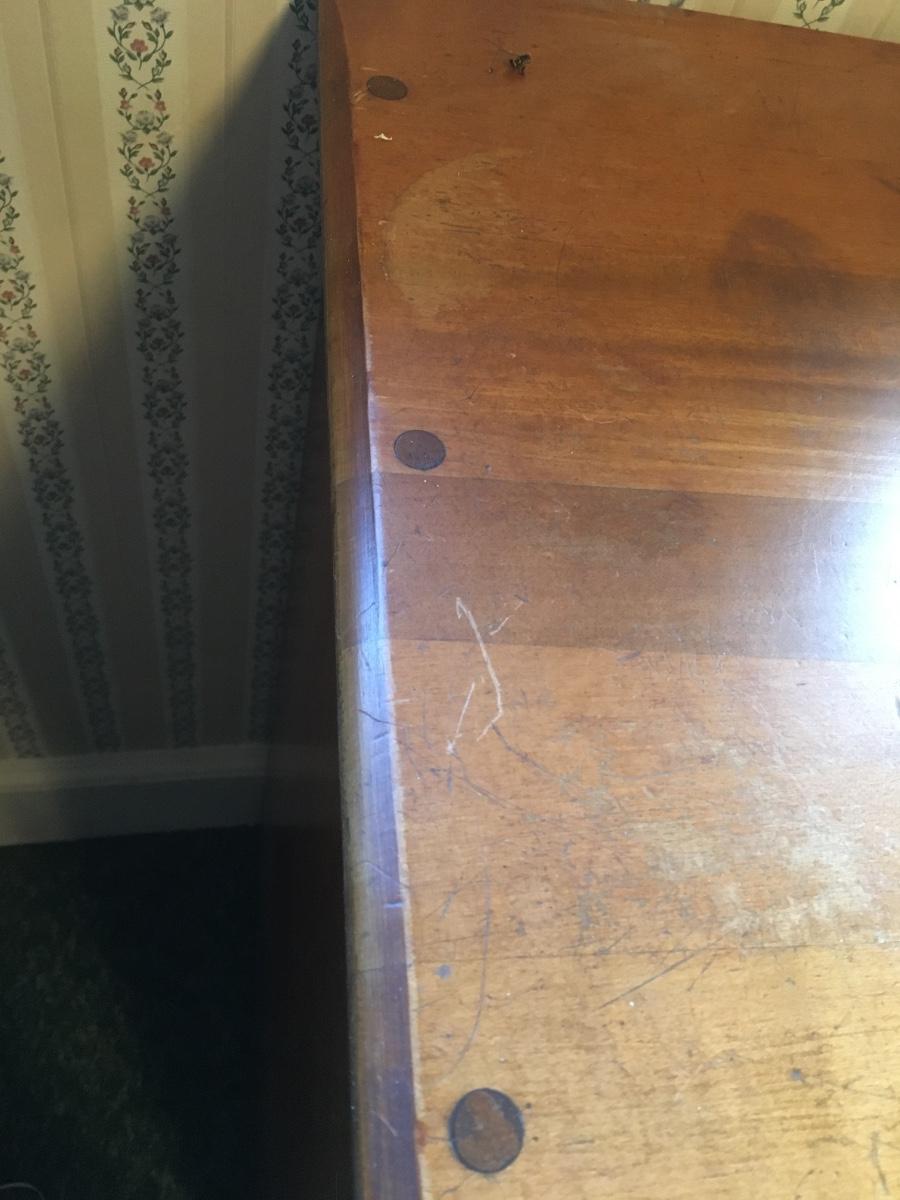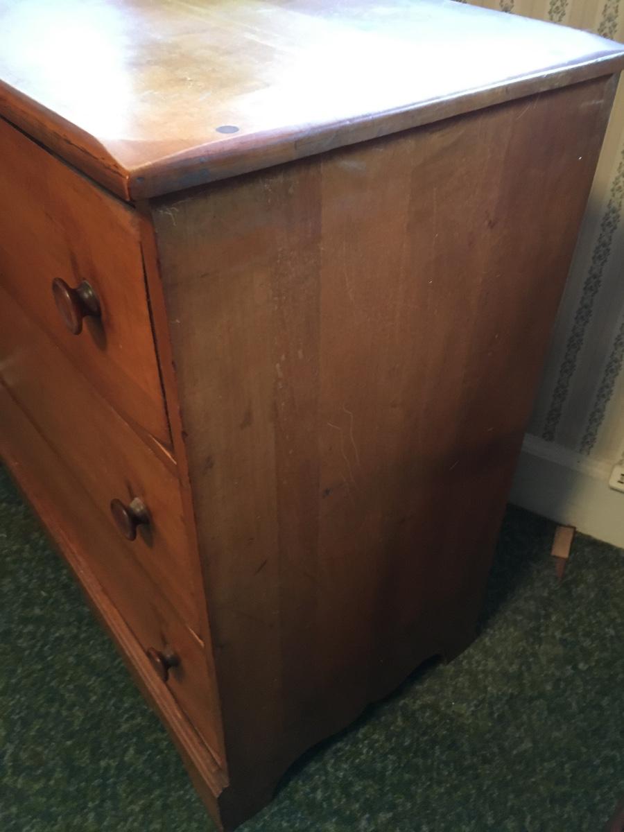 Vintage low dresser with large knobs . One is broken as shown in photograph. There is a surface wear.