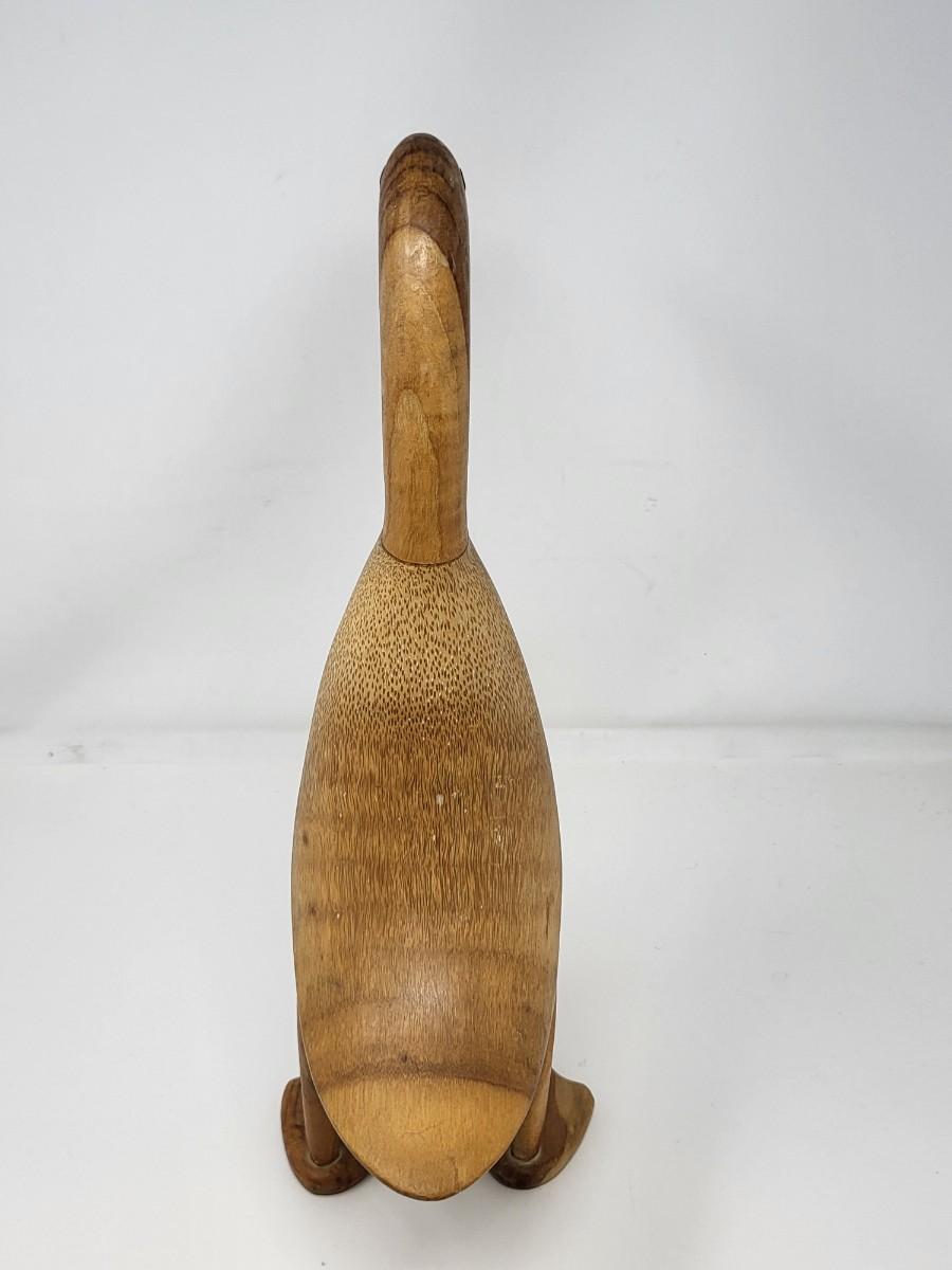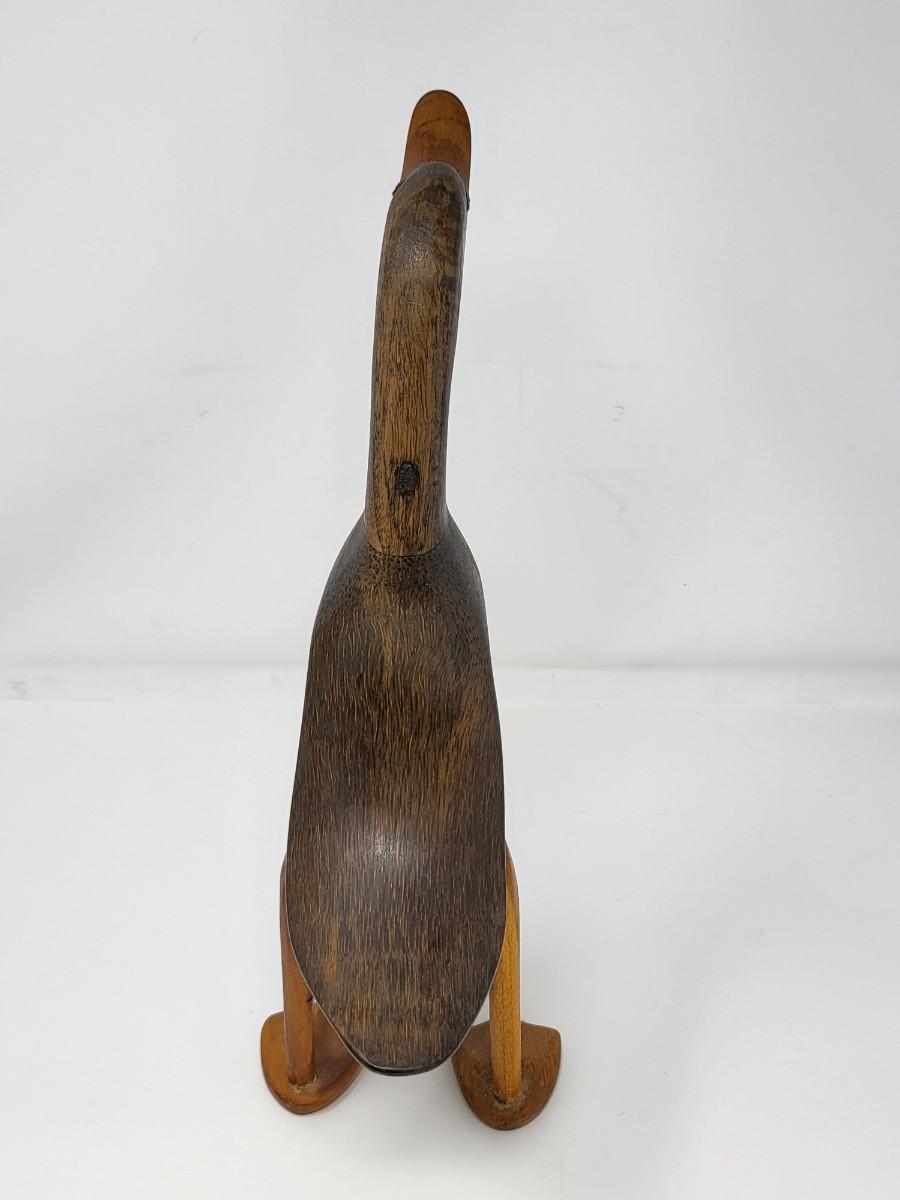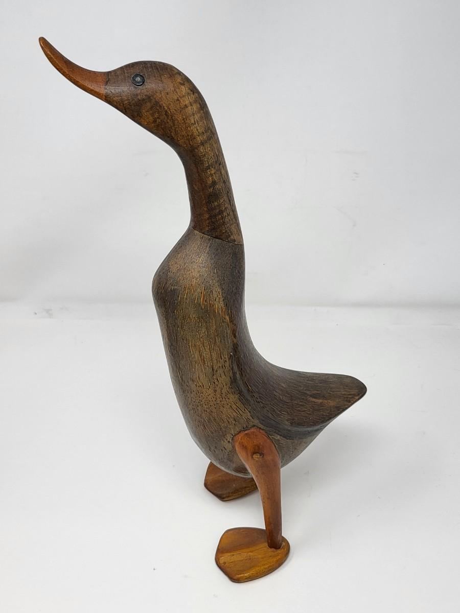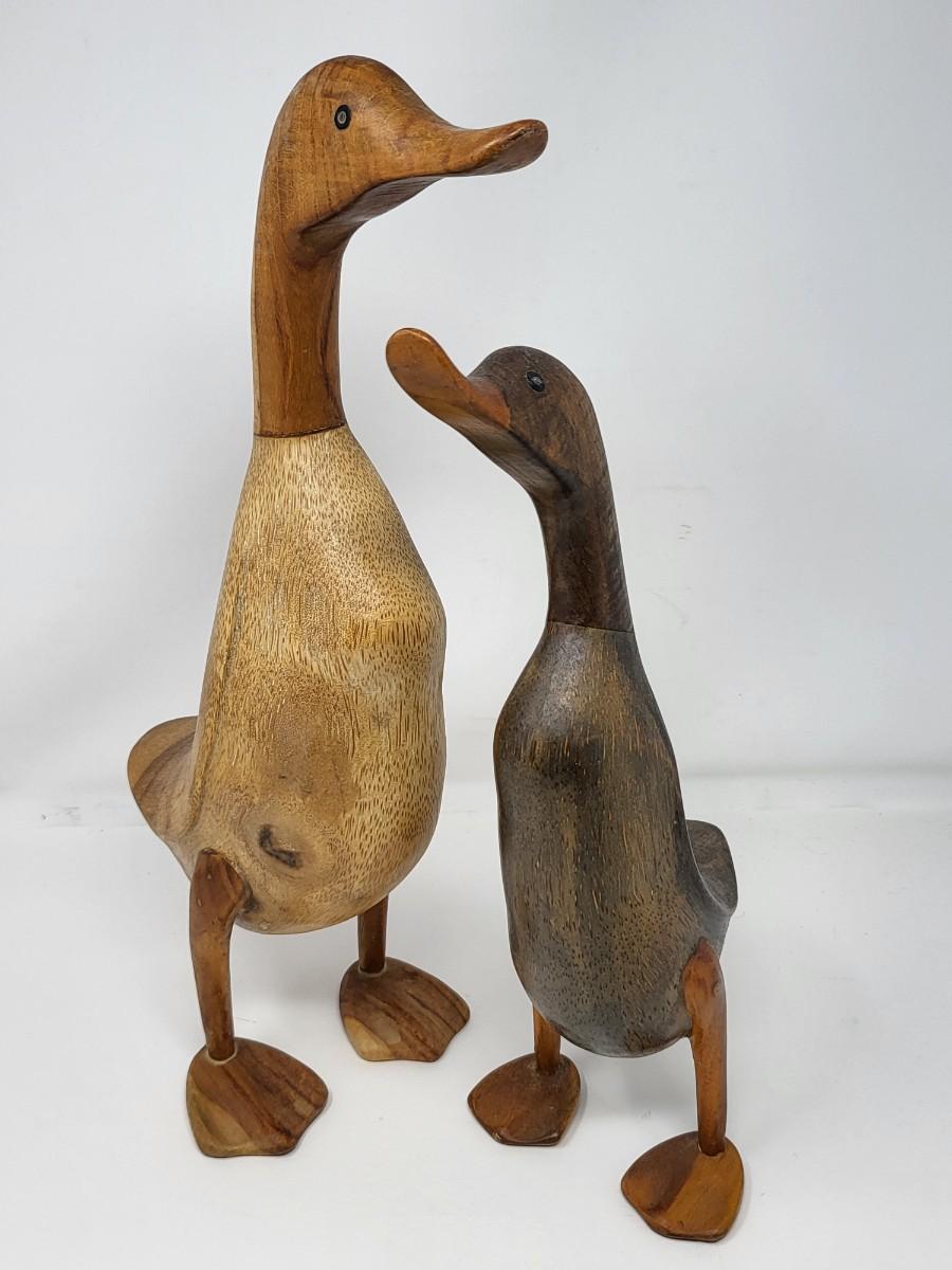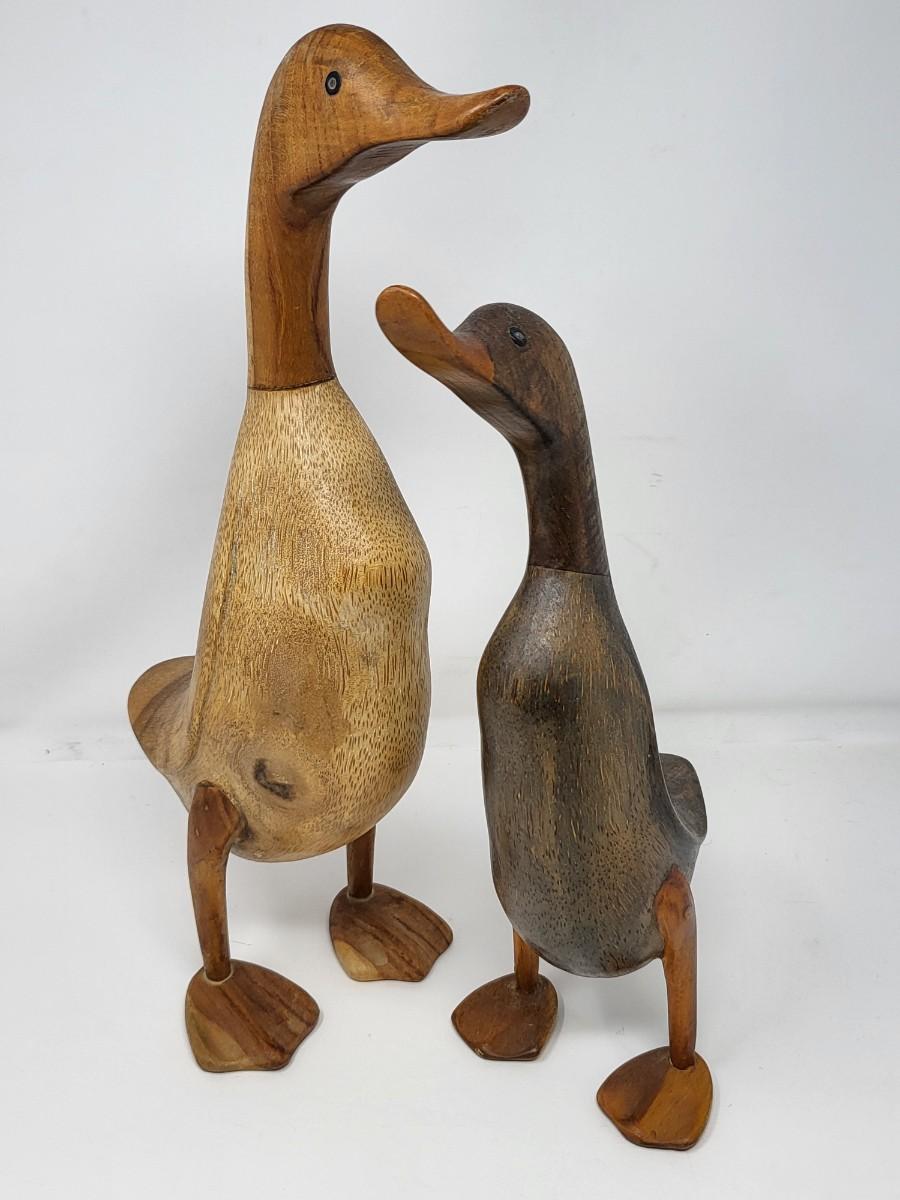 Pair of darling wood carved ducks, Indonesia. Taller, light wood one is 16" tall and shorter, dark wood one is 13.5" tall.