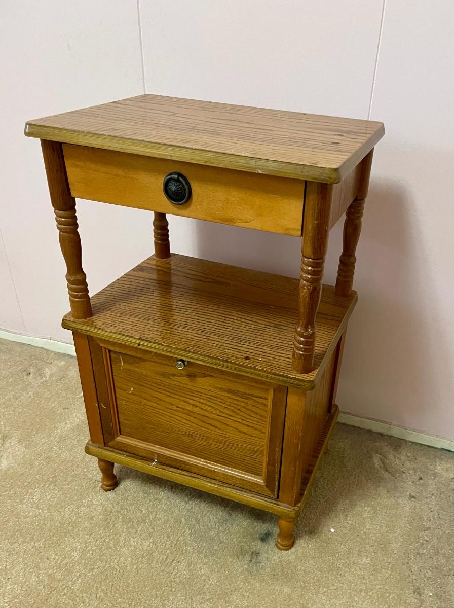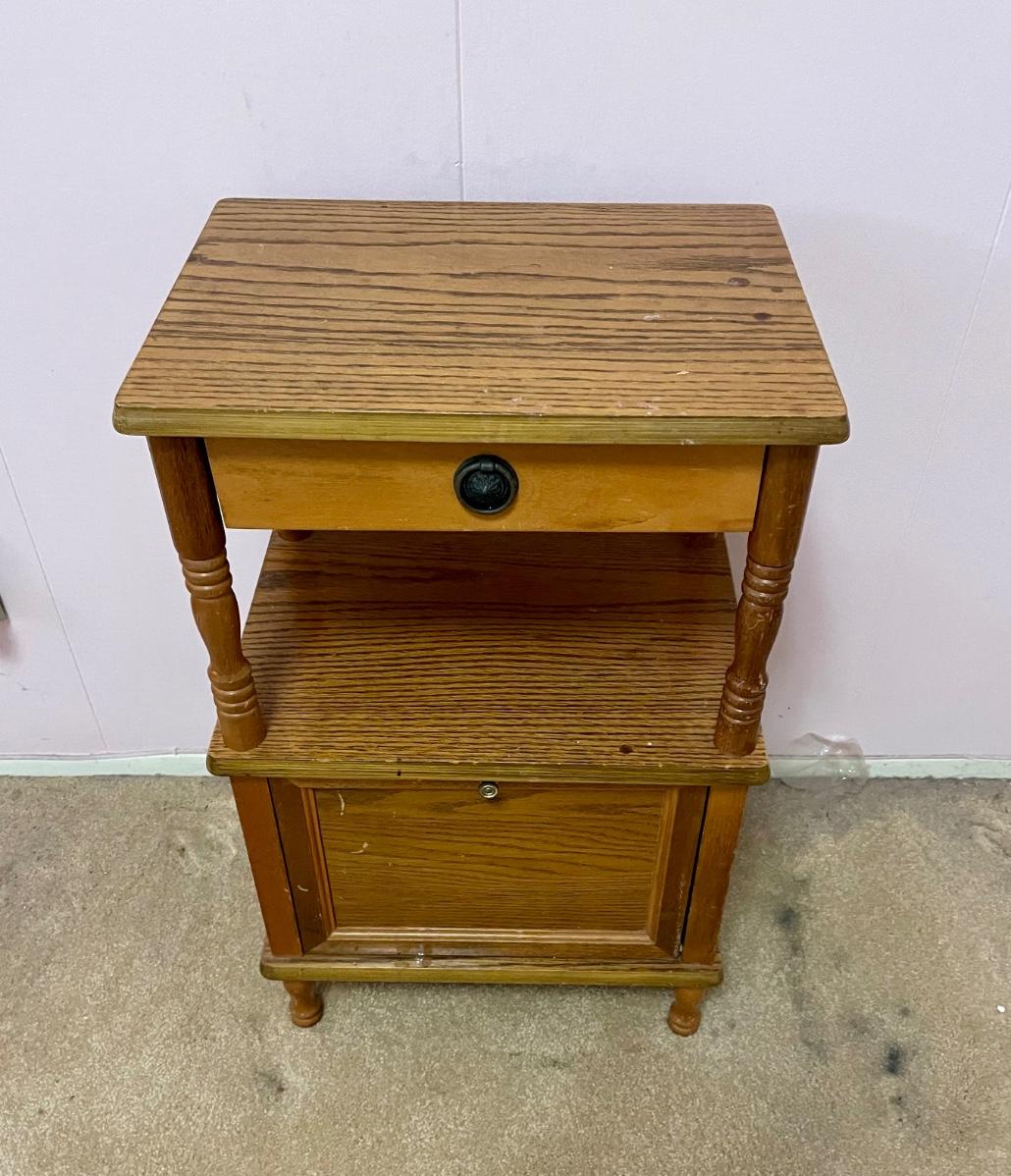 Good condition, open shelf underneath a small top drawer. Large Cabinet space below. Approx. 25” x 15” x 12”.