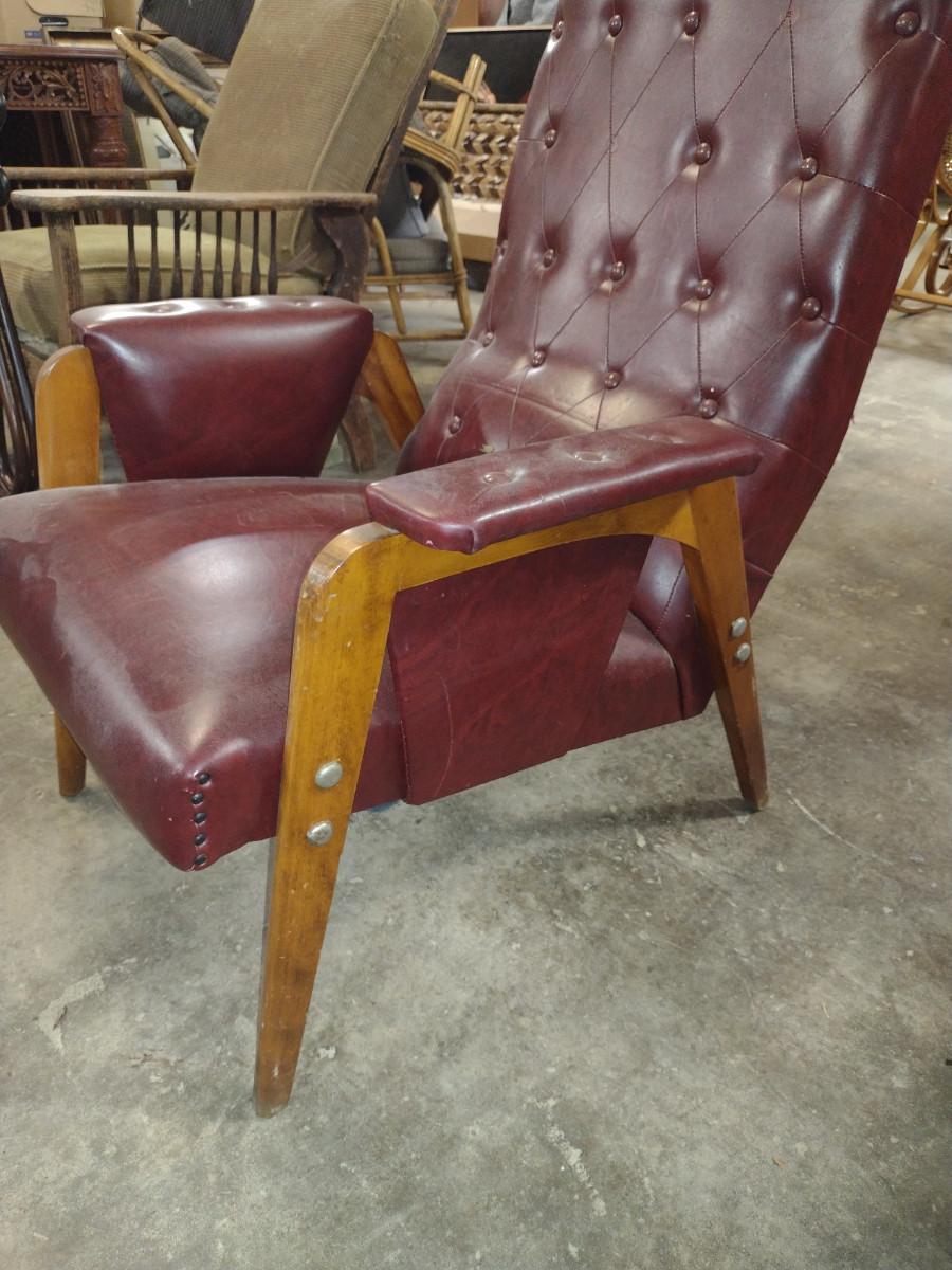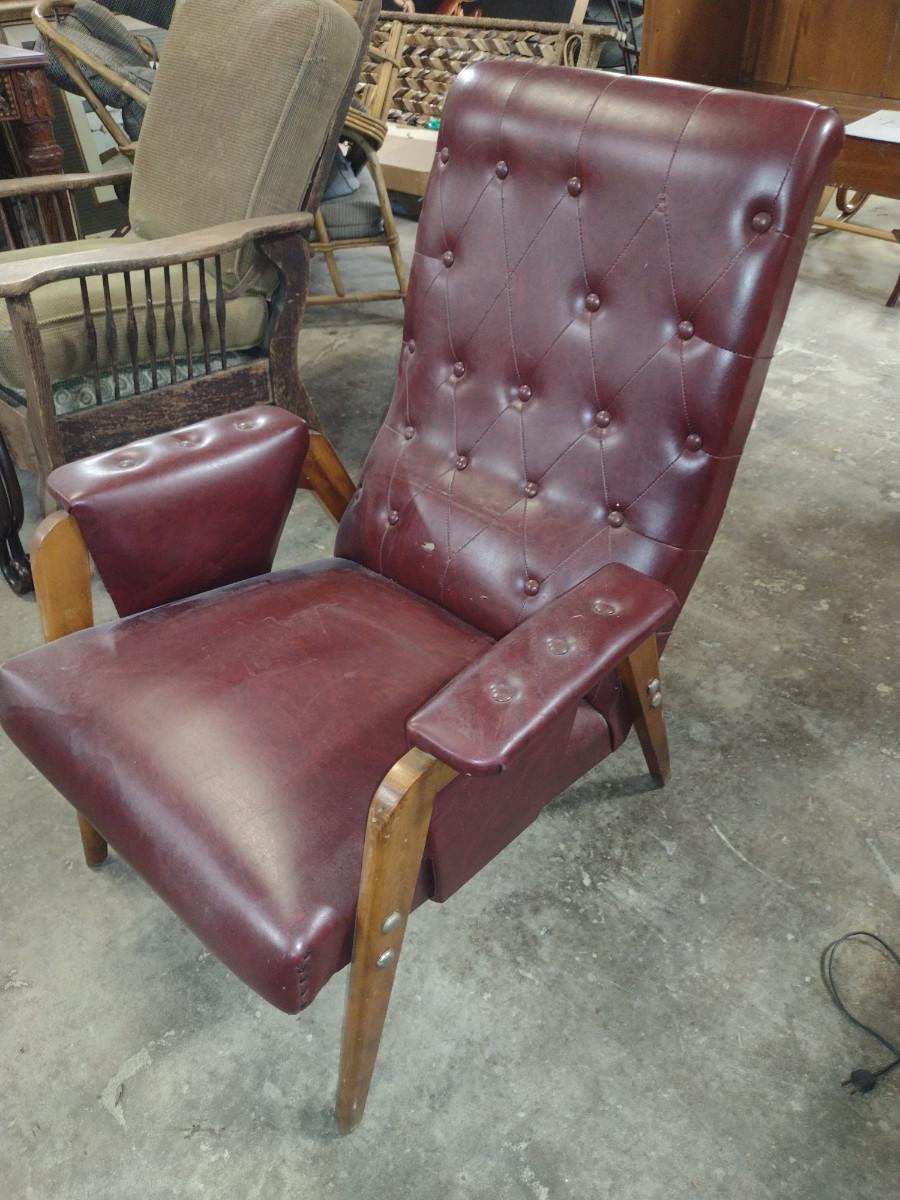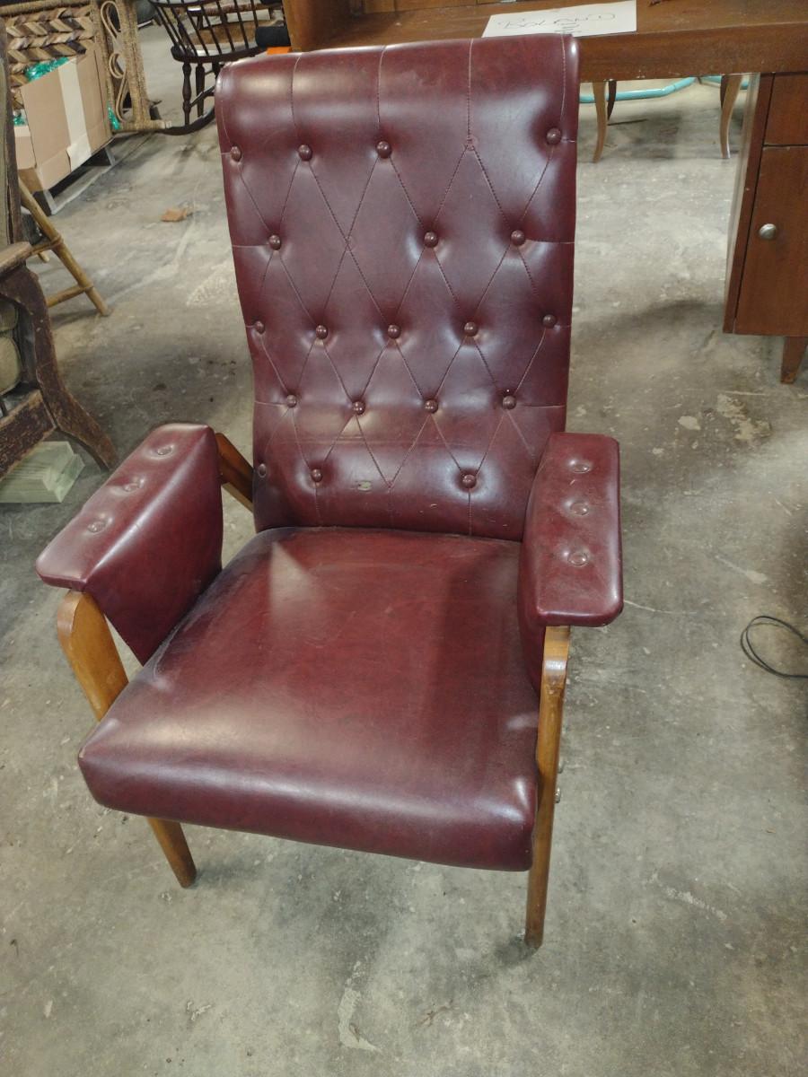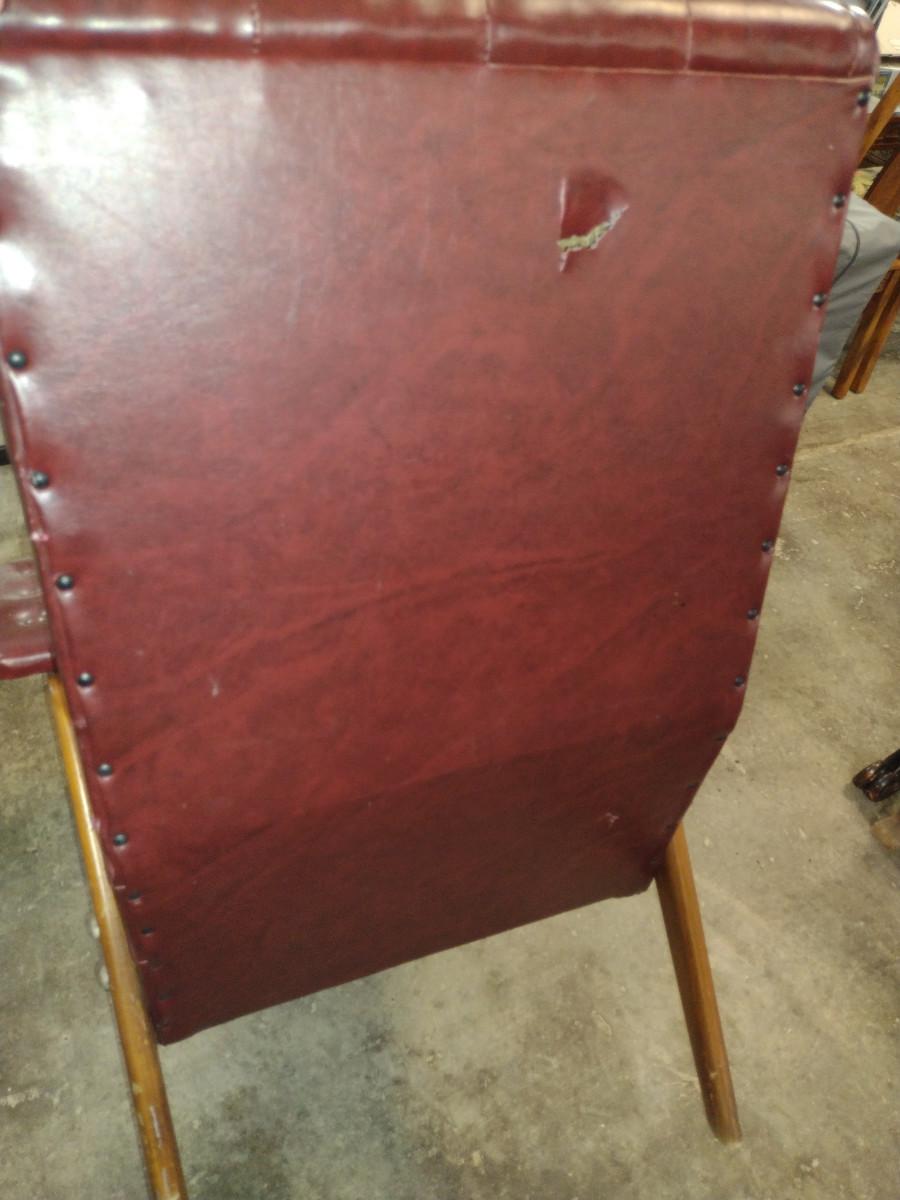 Vintage Wood Frame, Faux Leather Covered Chair. Please see all pictures for condition- upholstery is missing buttons and has some tearing.