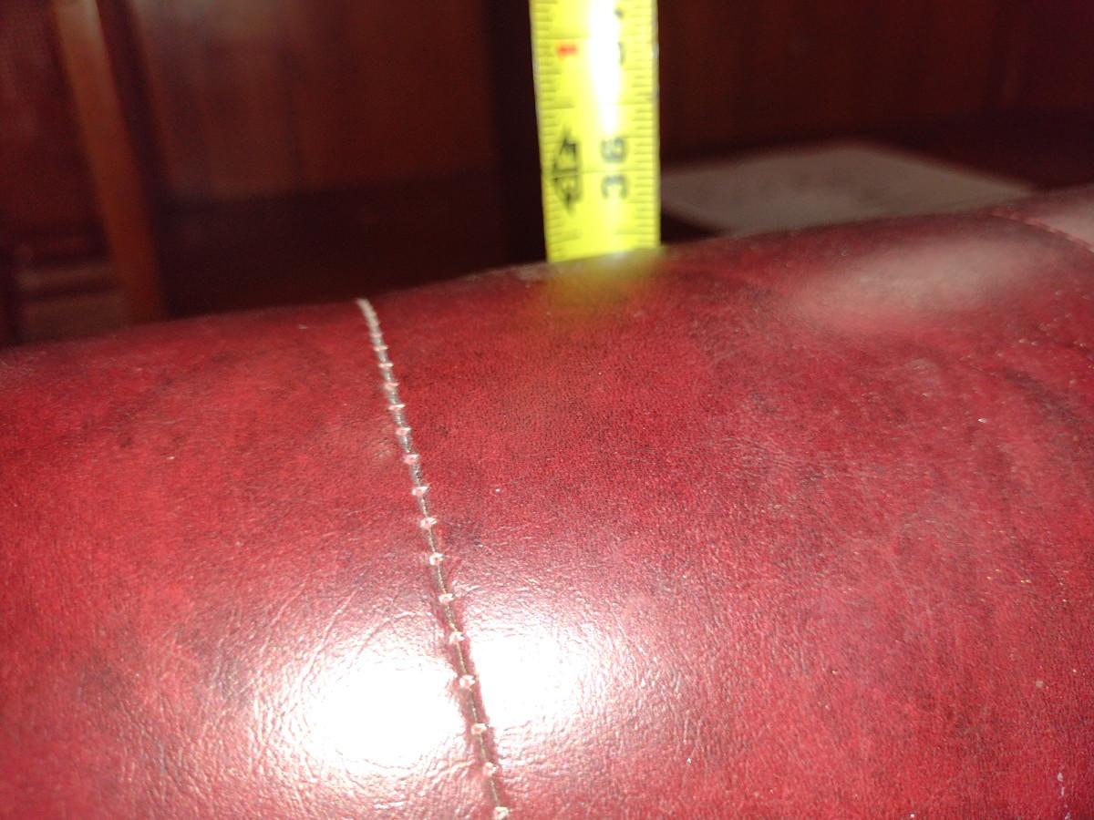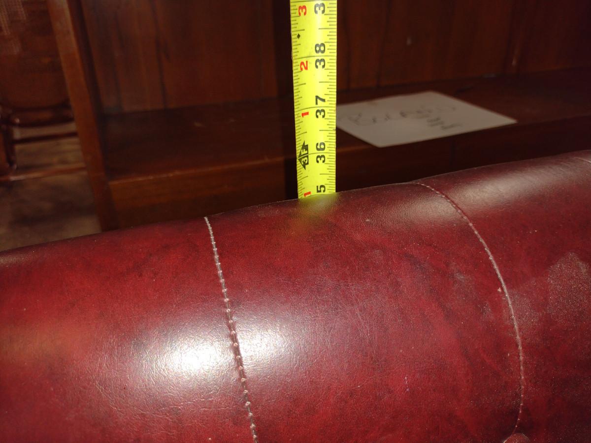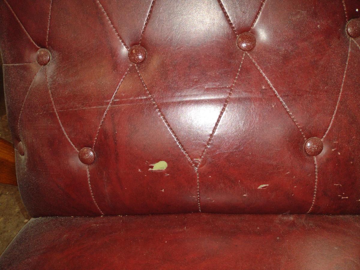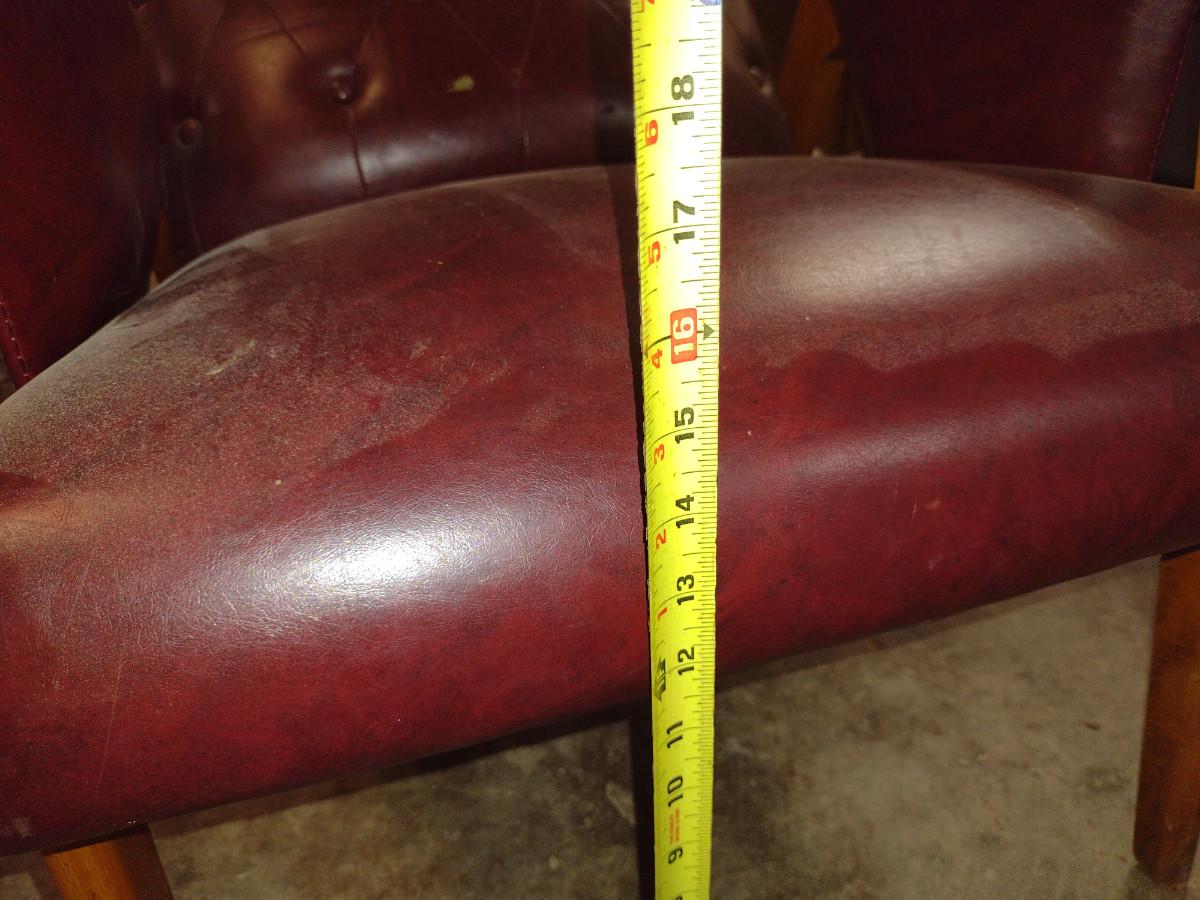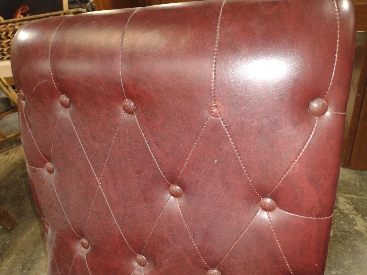 Vintage Wood Frame, Faux Leather Covered Chair. Please see all pictures for condition- upholstery is missing buttons and has some tearing.