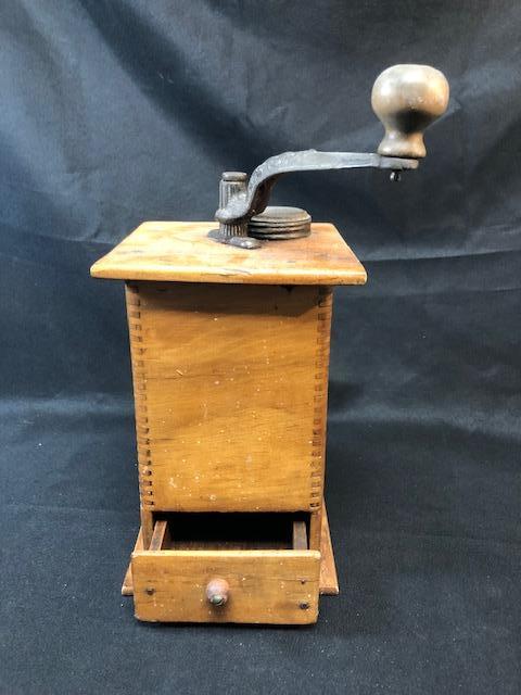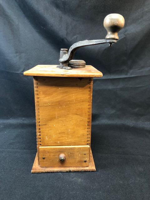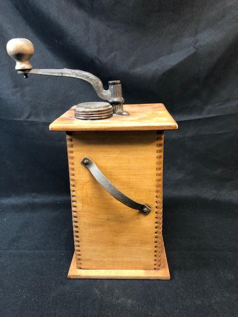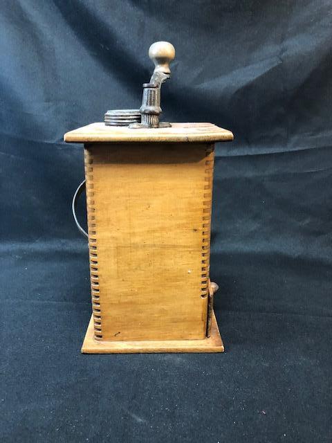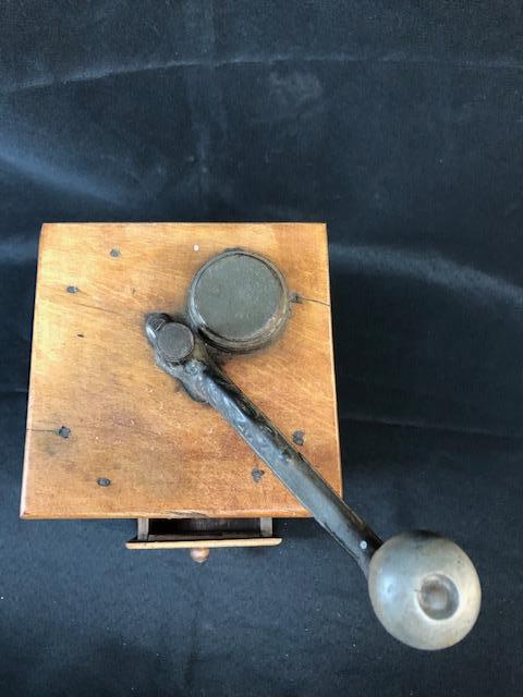 Vintage coffee bean or spice grinder. Wood with a hand crank grinder.