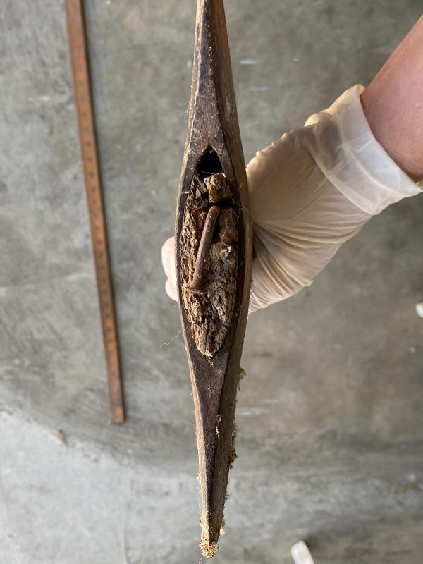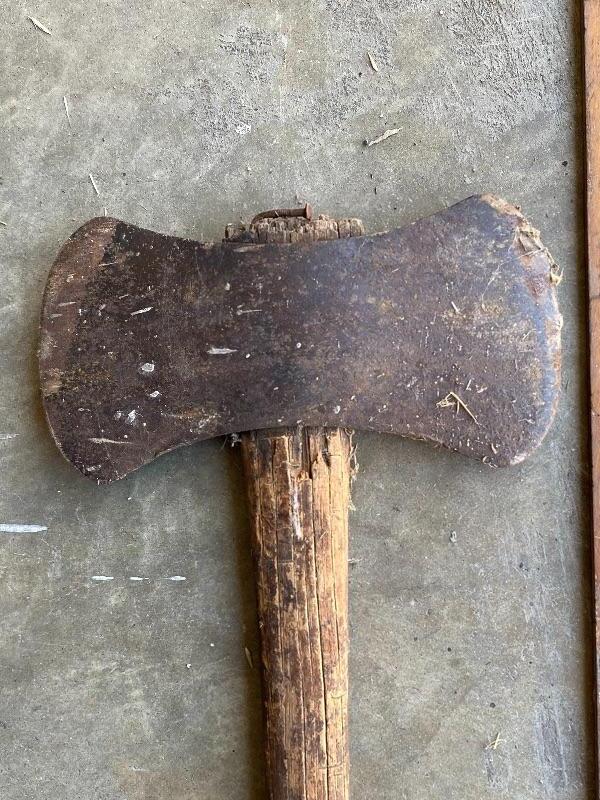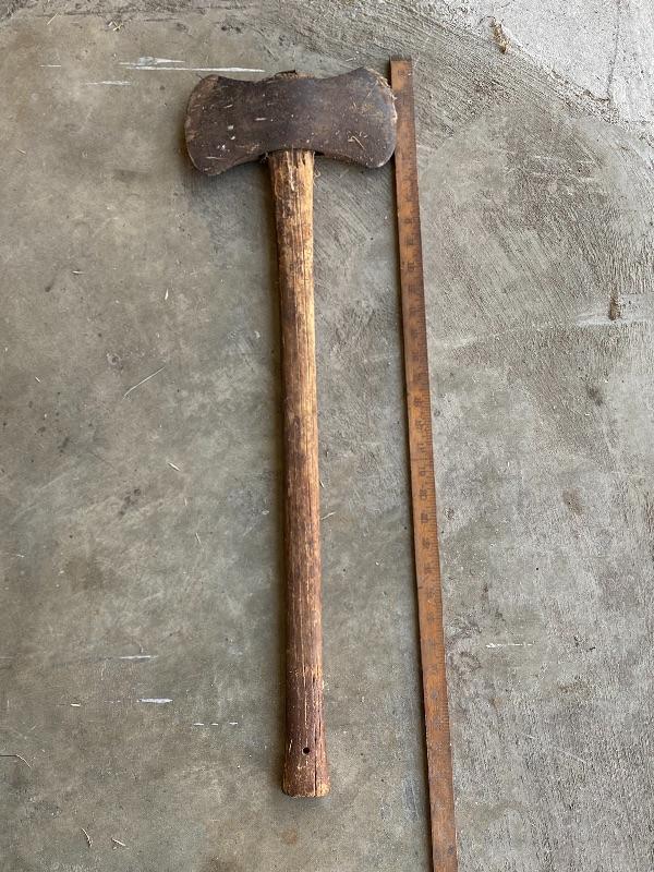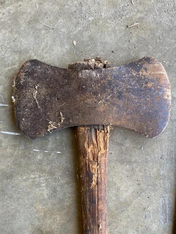 Vintage double bit axe. Wood handle, about 32" length. Handle is pretty dry, splitting. Axe head is in good condition. Did not find any maker marks.