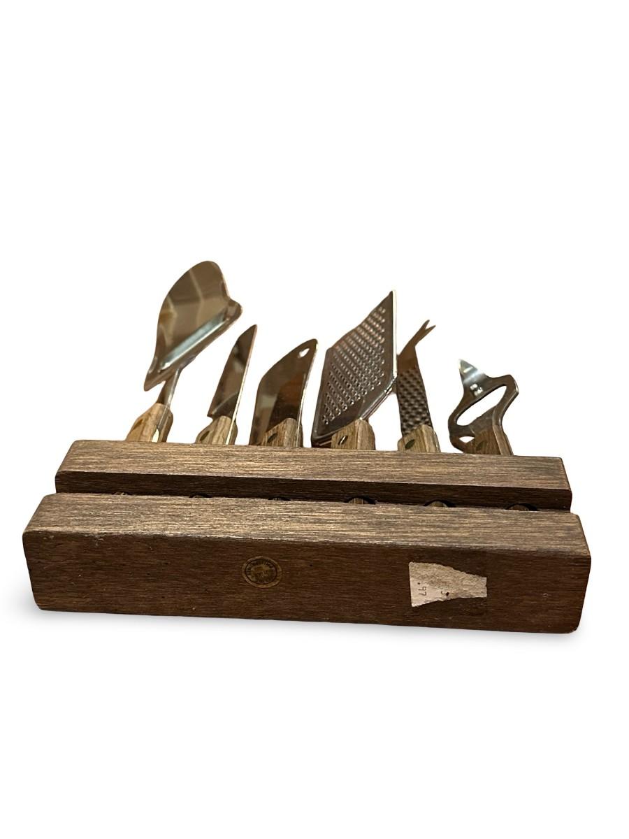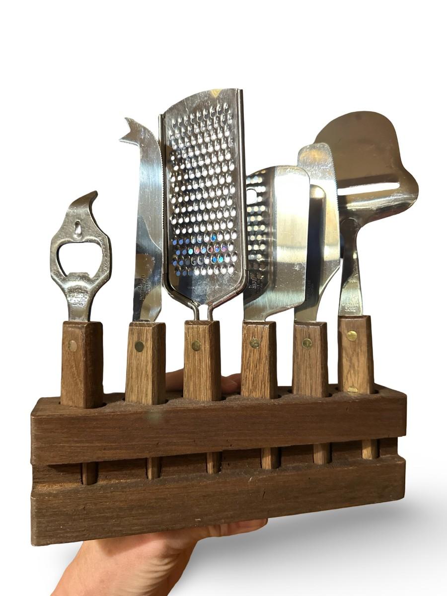 Vintage wood-handled cheese tool set with a solid wooden countertop rack, featuring assorted stainless steel cheese knives and servers (including slicer, plane, fork, and spreader).