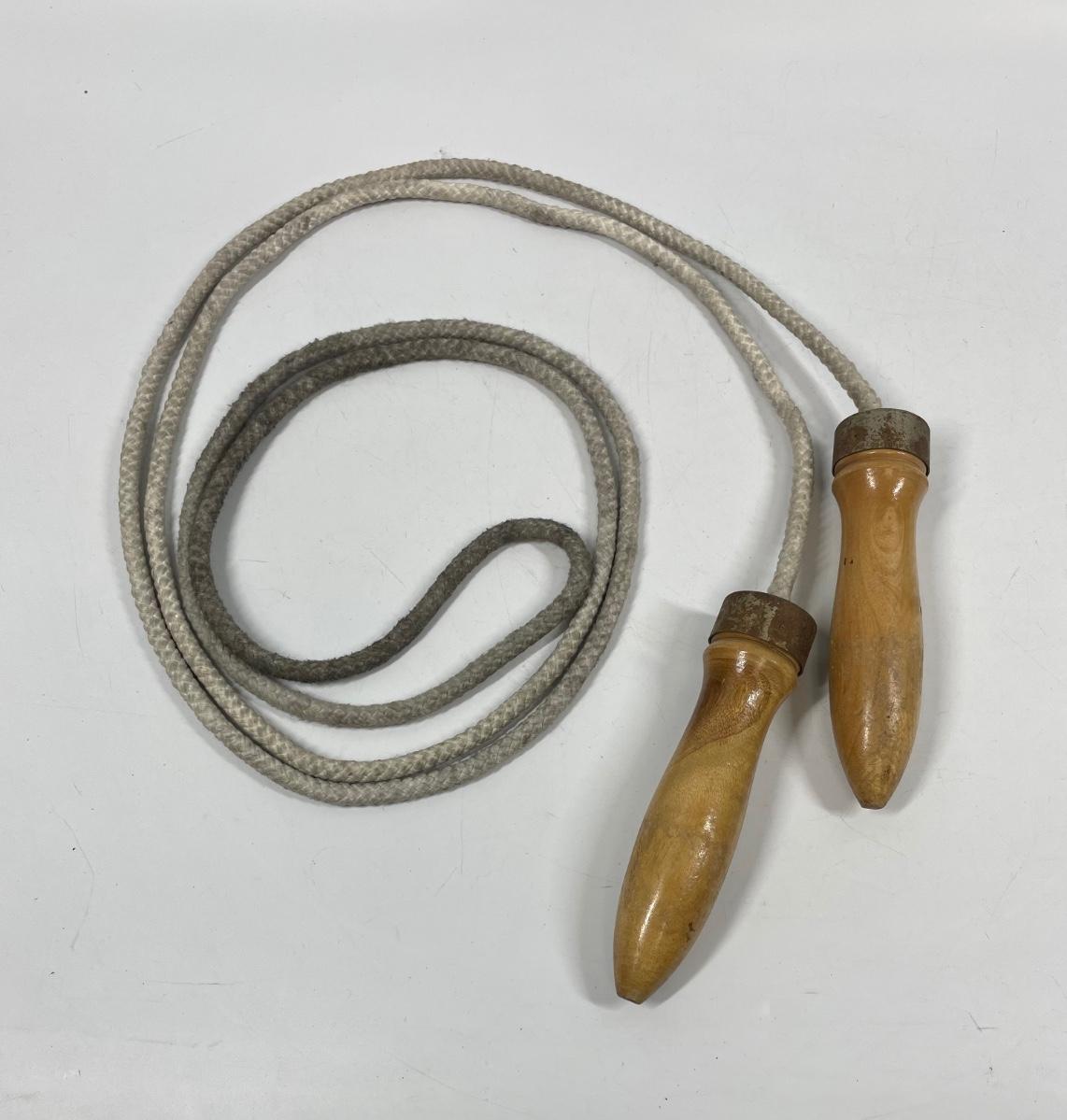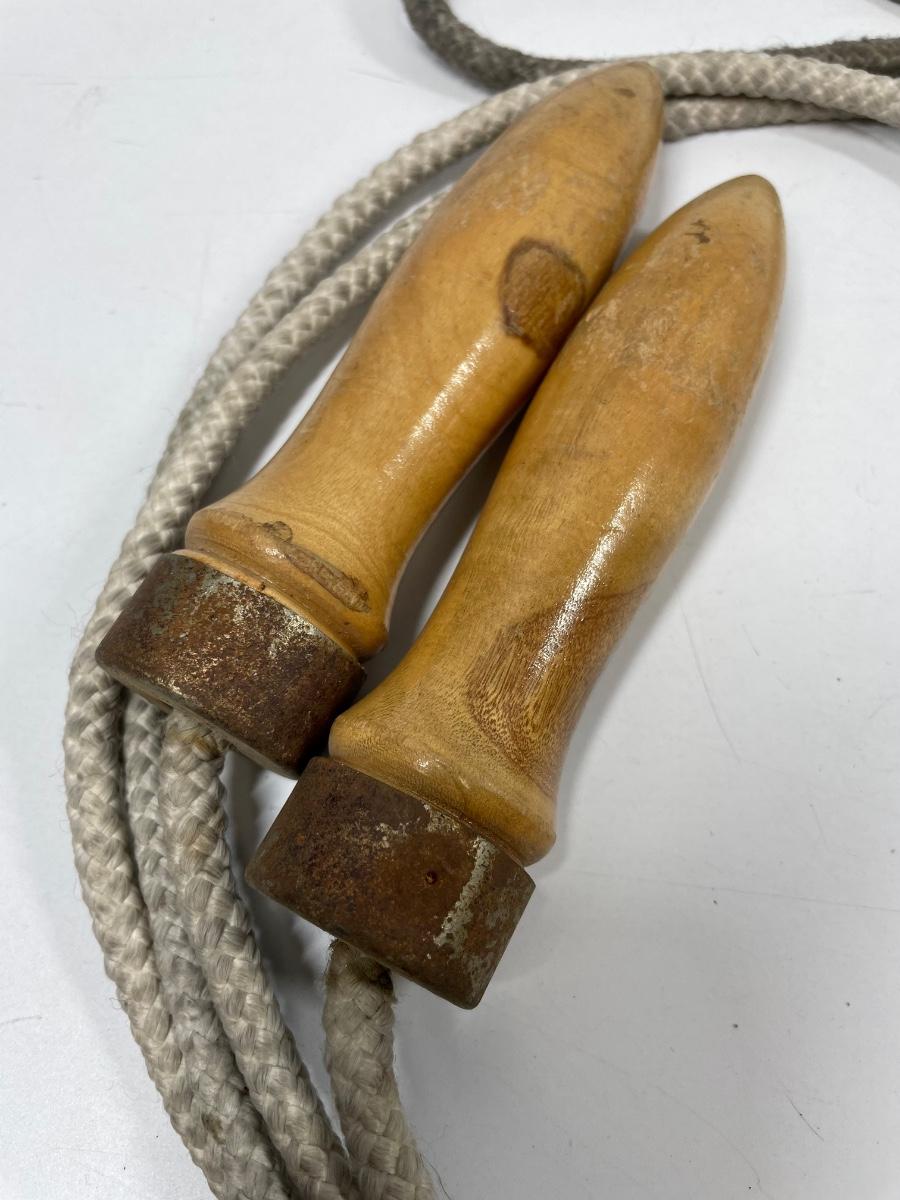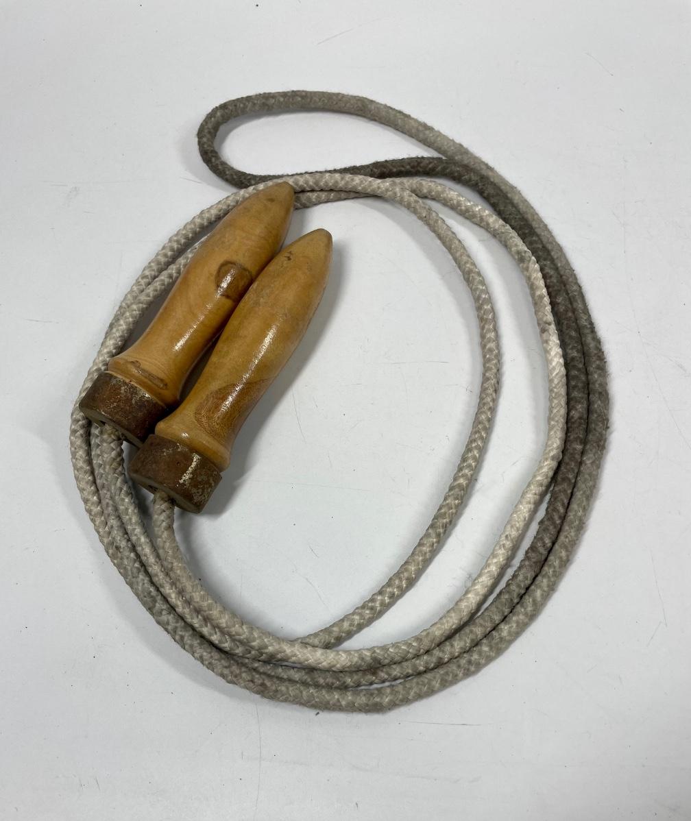 Vintage Wood Handled Jump Rope. Rope is heavy braided cotton and is a little dirty from use. Rope has good weight and make for an easy-to-use and control jump rope.