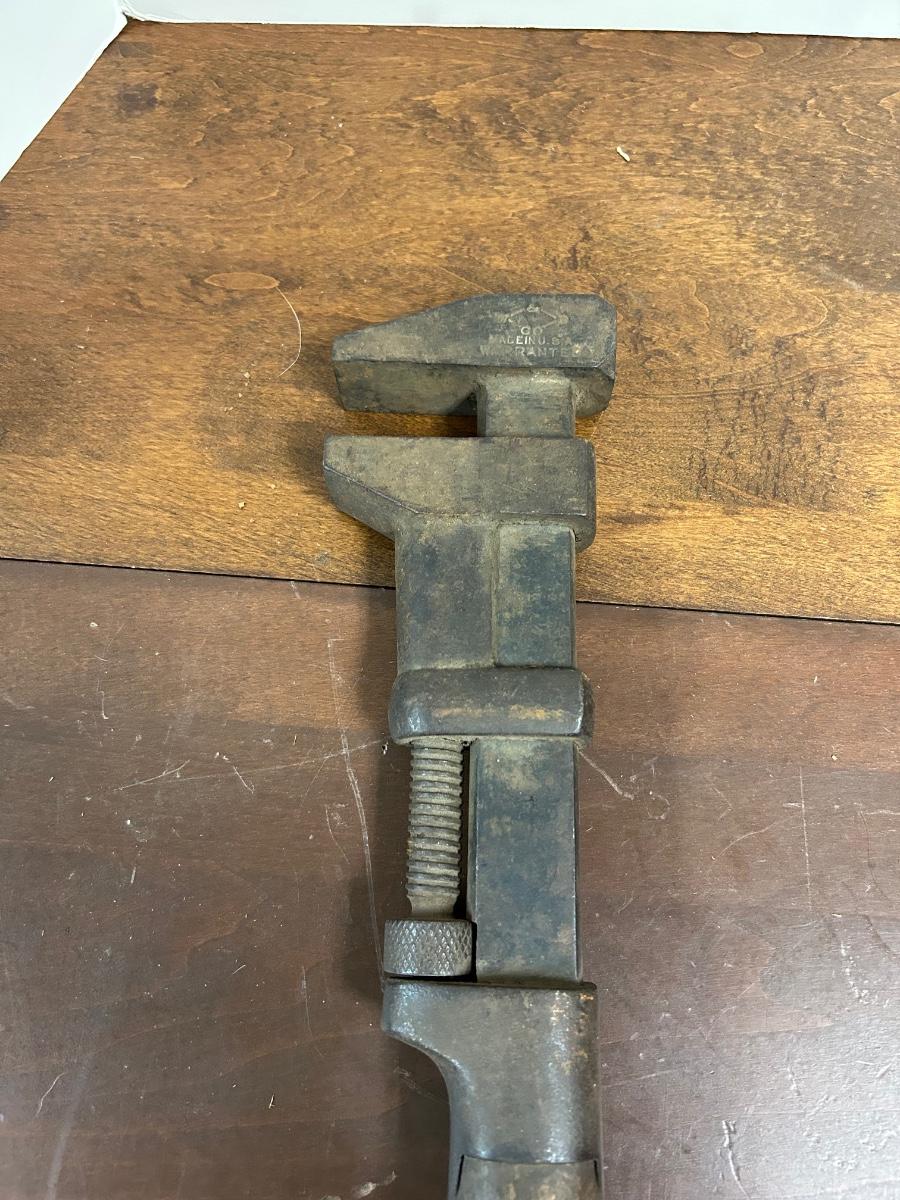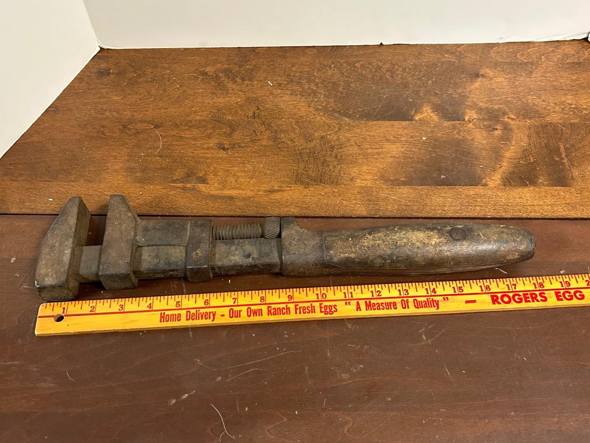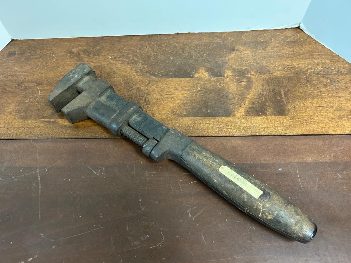 Vintage Wood Handled Large Adjustable Wrench. In good condition. Can’t get it to adjust but isn’t frozen., may need a little WD40.