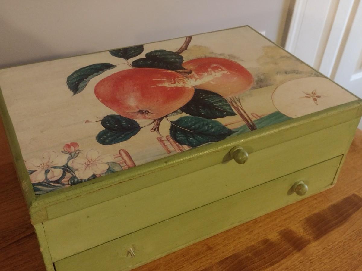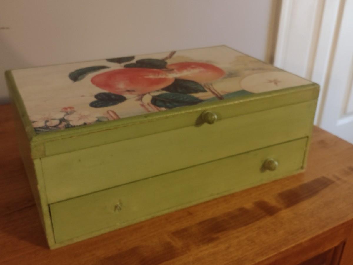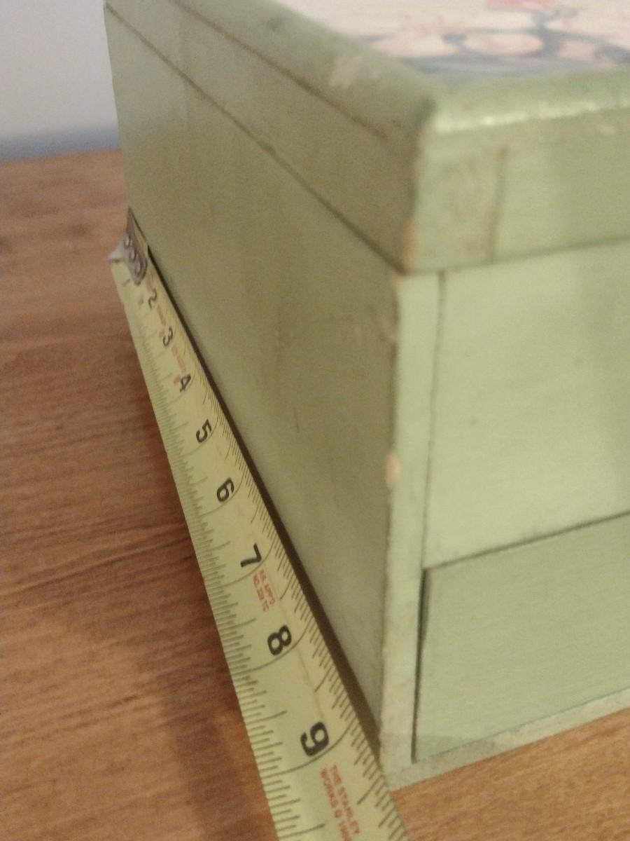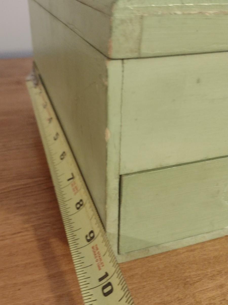 Vintage Wood Jewelry Trinket Box with Painted Lid. A pull is missing as shown.
