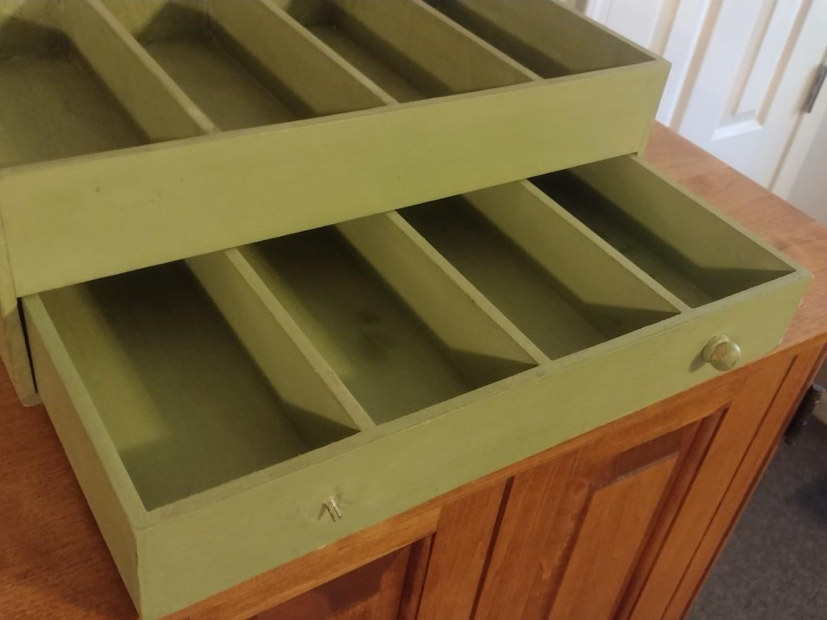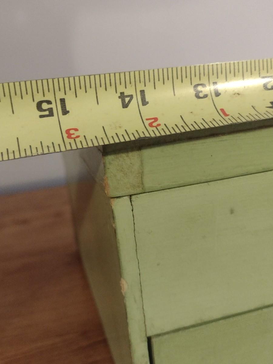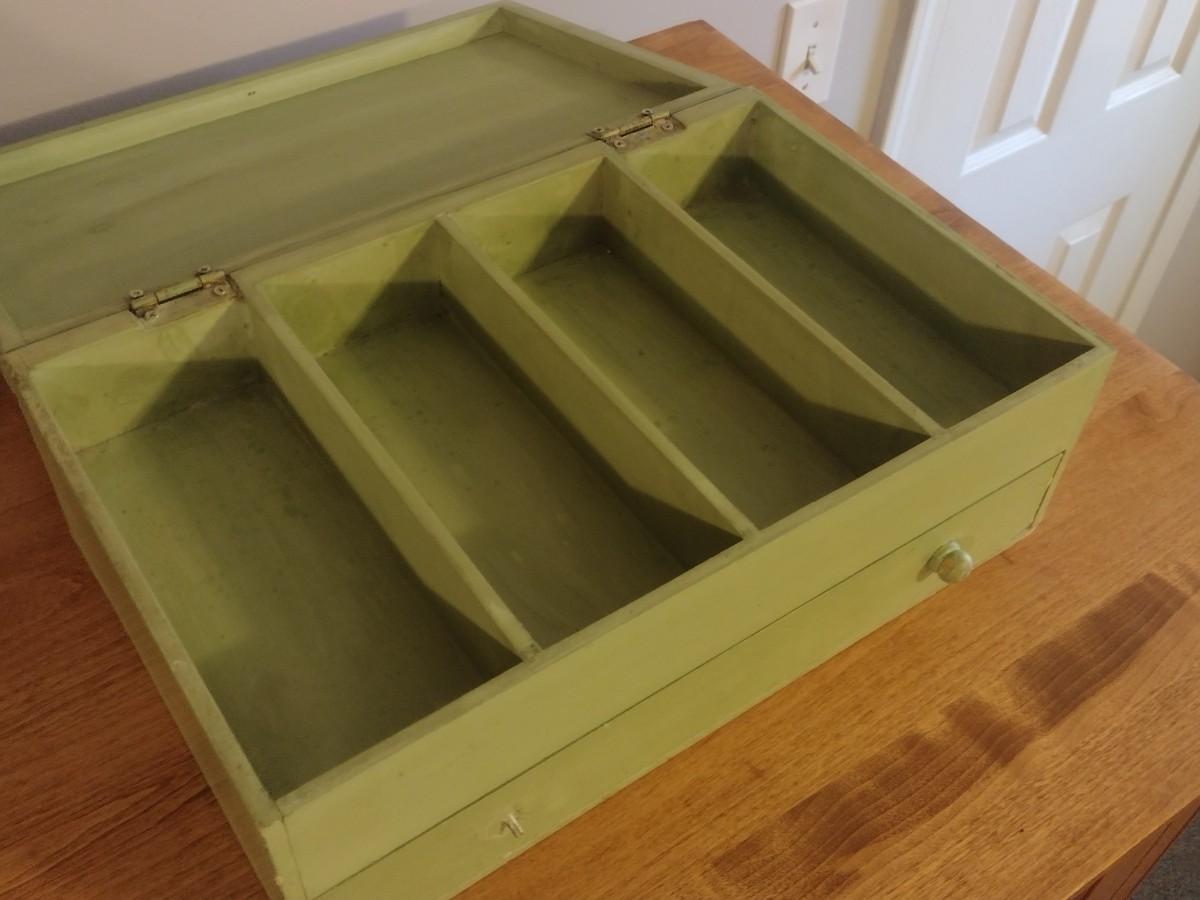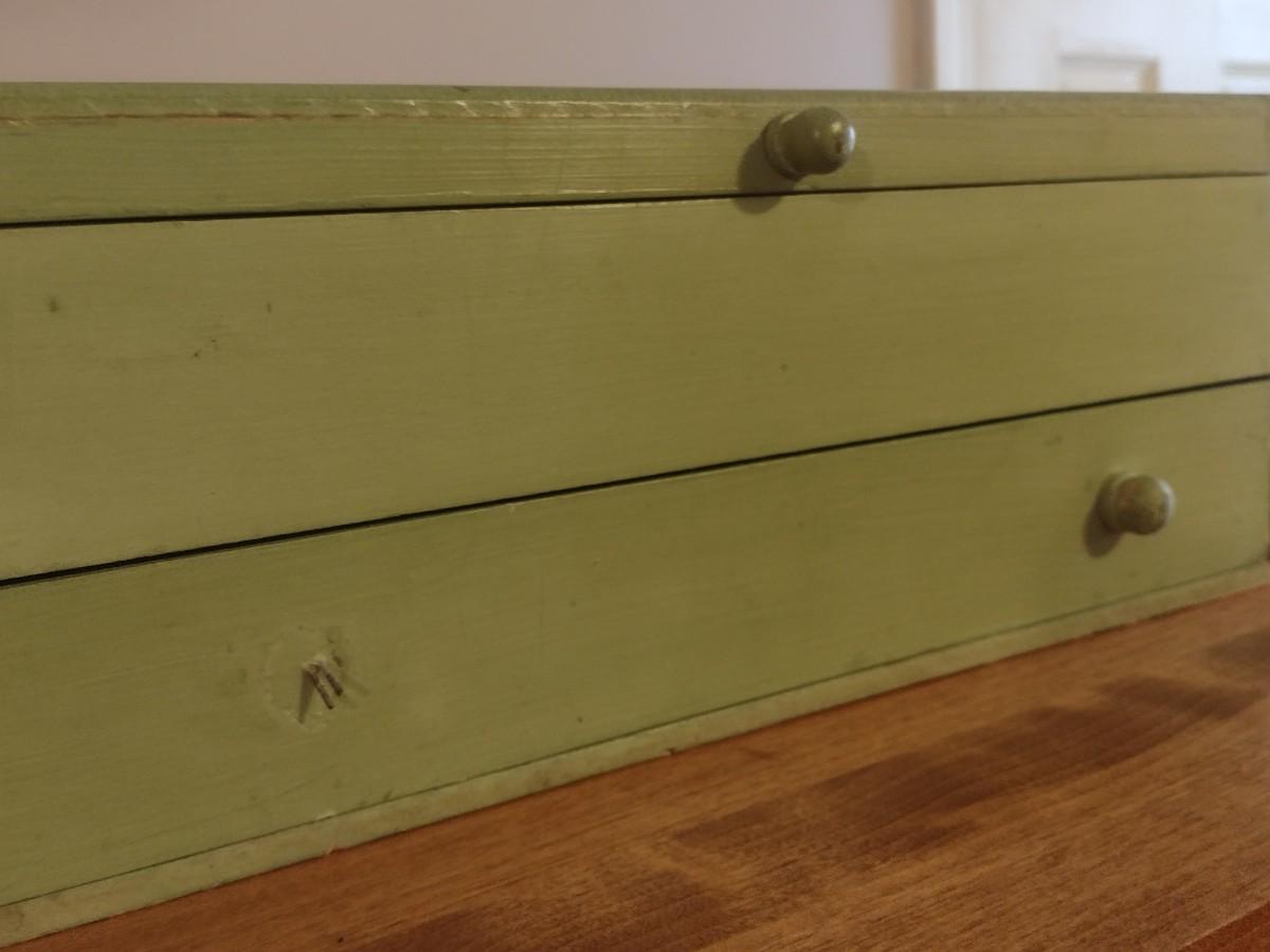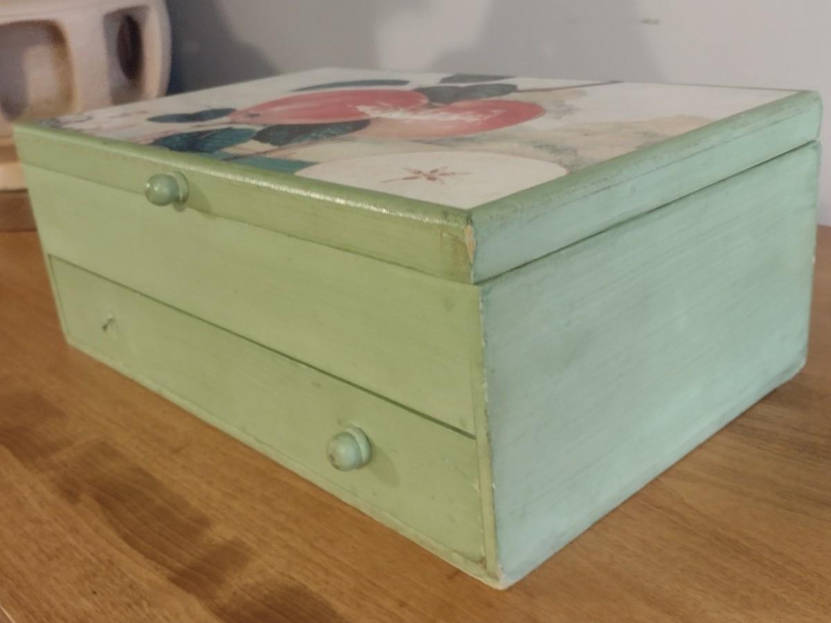 Vintage Wood Jewelry Trinket Box with Painted Lid. A pull is missing as shown.