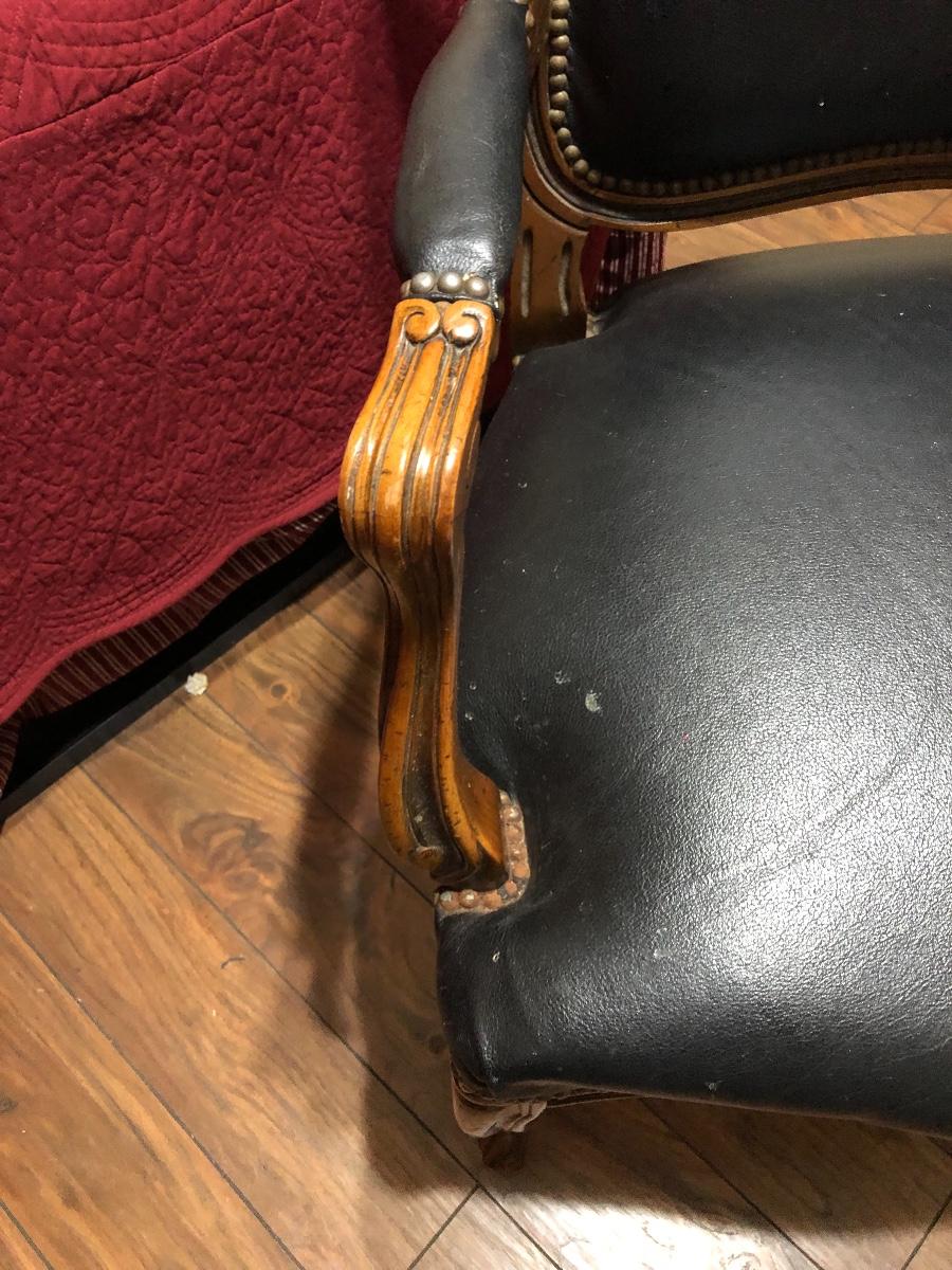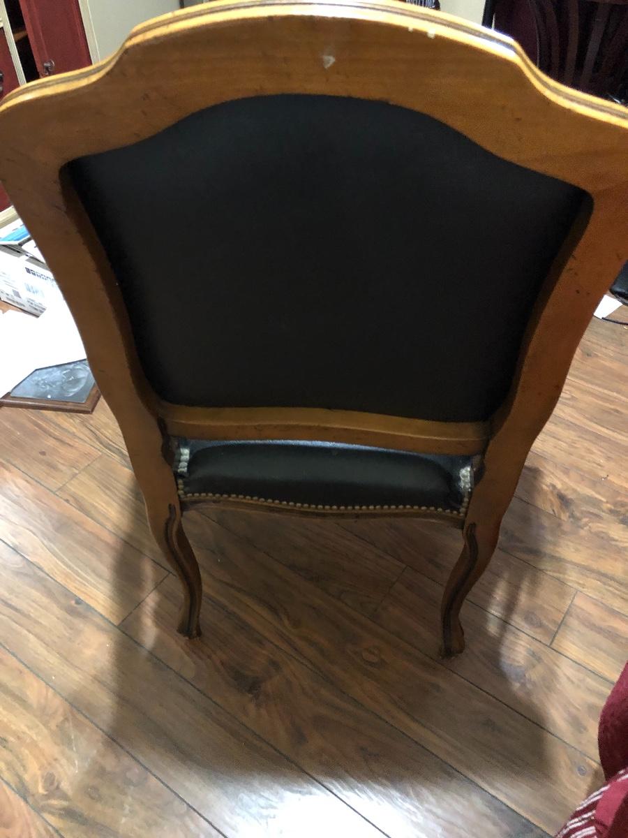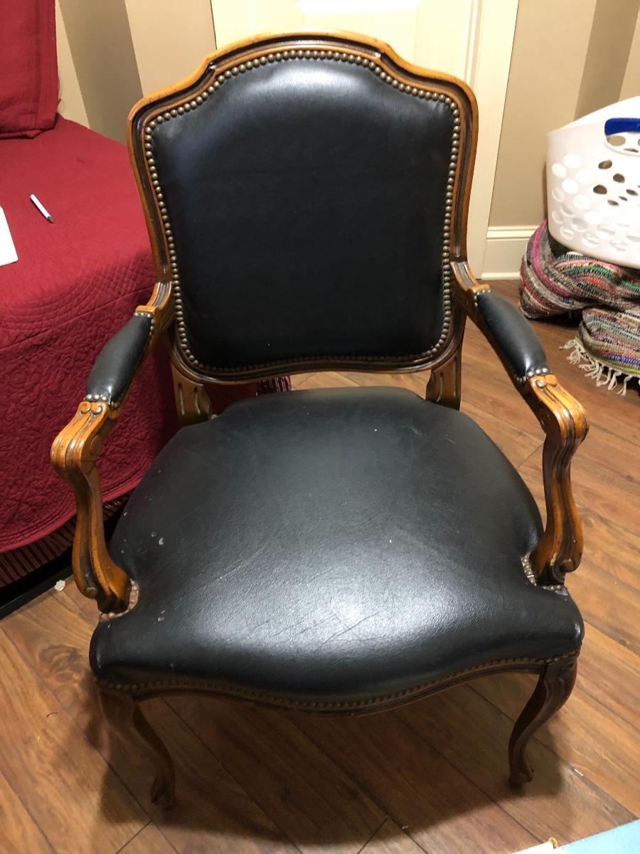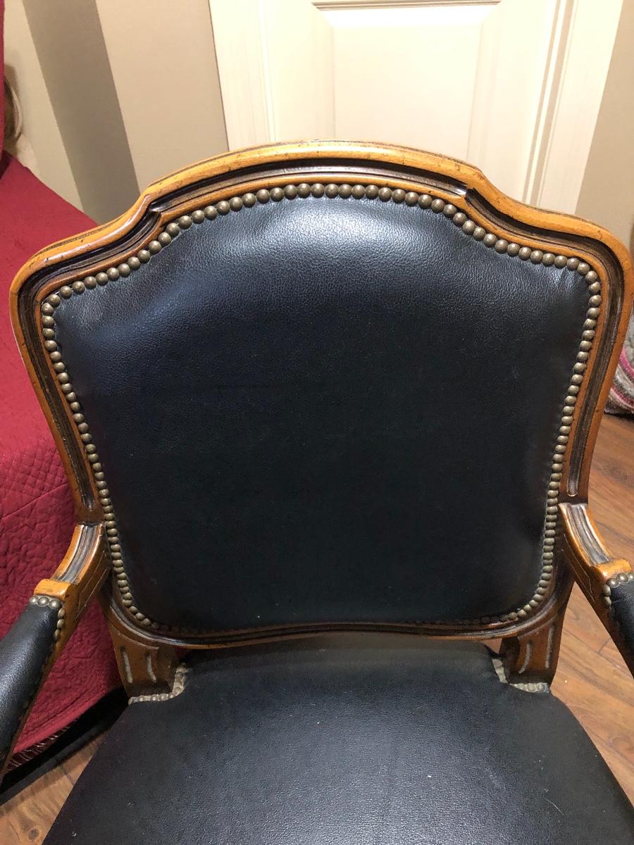 This is a stunning vintage leather chair with wood trim and nail head accents. Perfect condition. Seat is 25” wide and seat cushion sits 13” off ground.