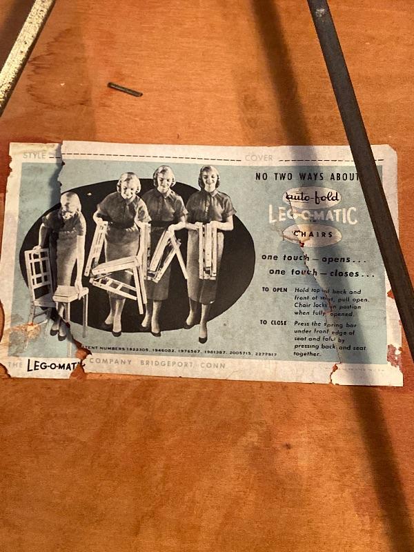 Vintage Leg-o-Magic Folding Chair. Light finish wood with green vinyl seat. Has original tag underneath. Still folds.
