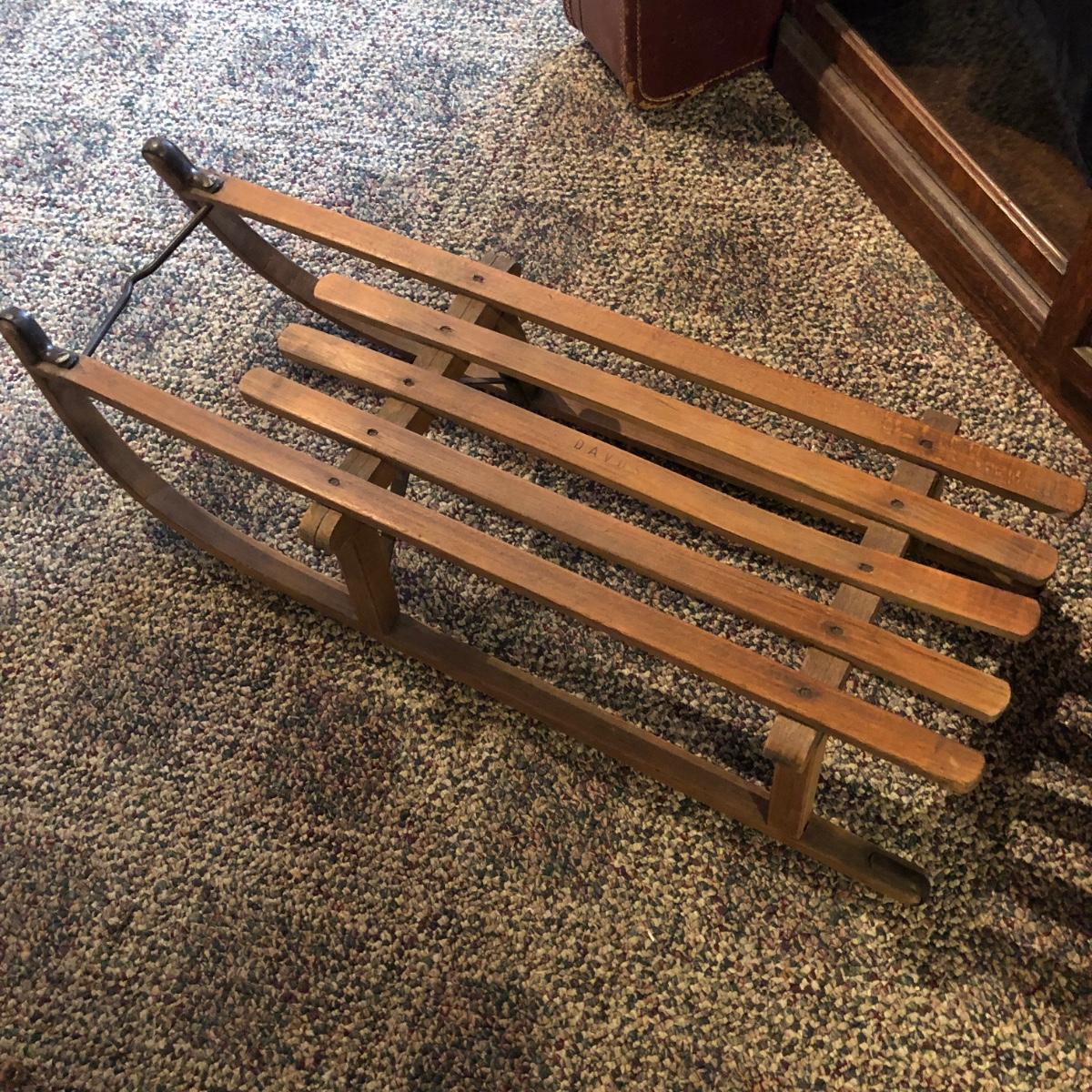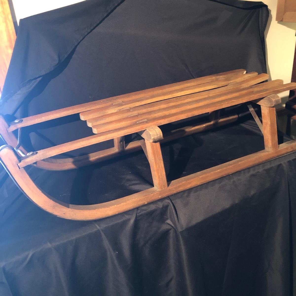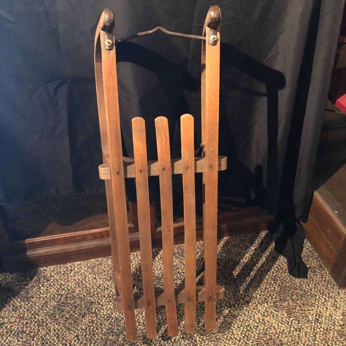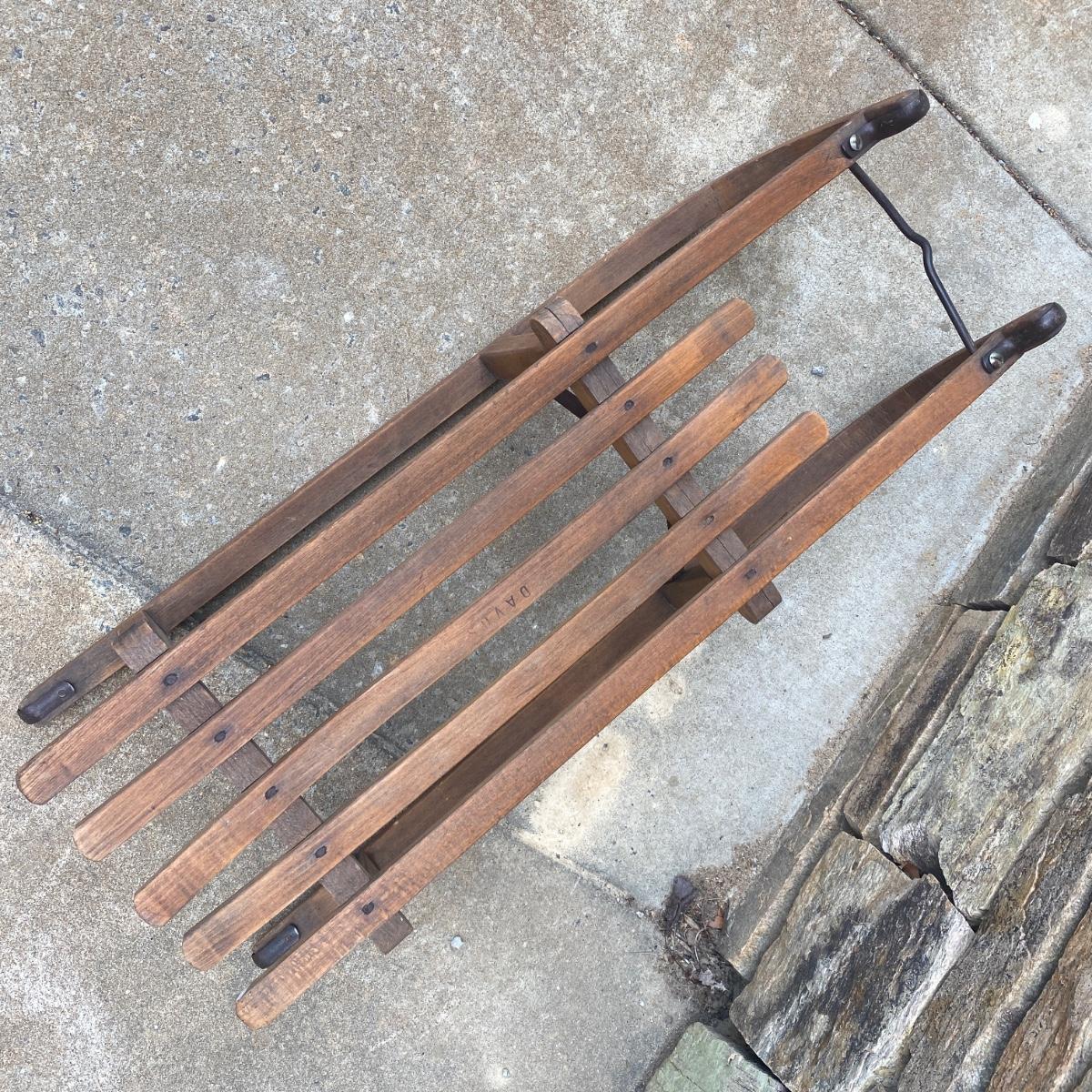 This sled is all wood with metal on the runners and metal braces underneath. In great condition. It is stamped Davos on the wood. It measures 35.5” x 11” x 9.5”. Local pick up only.