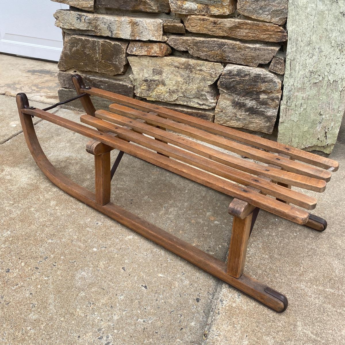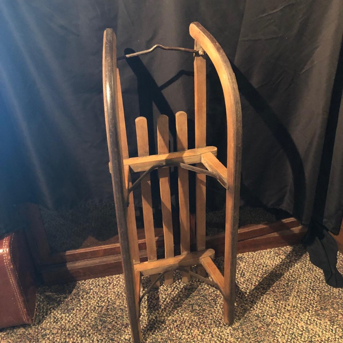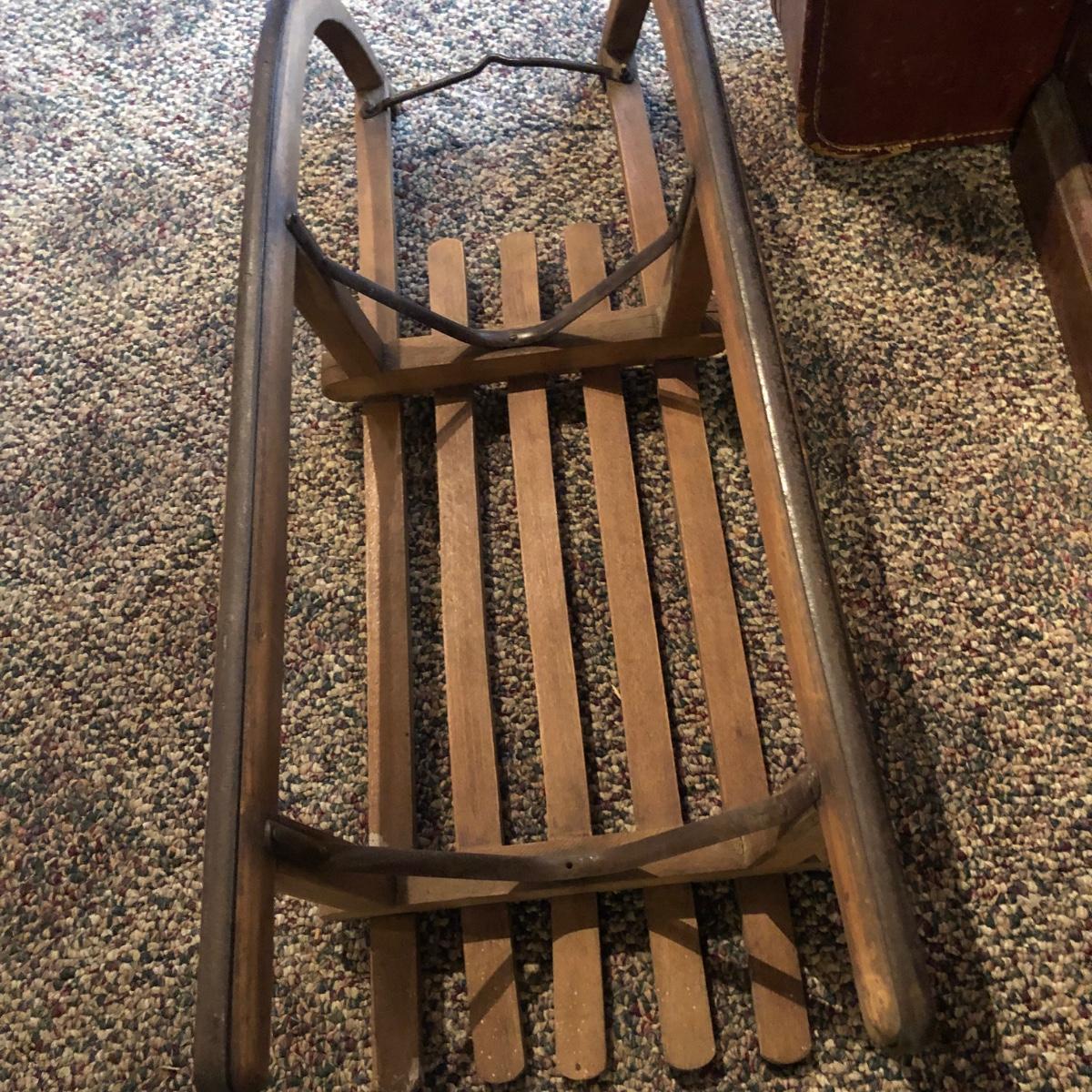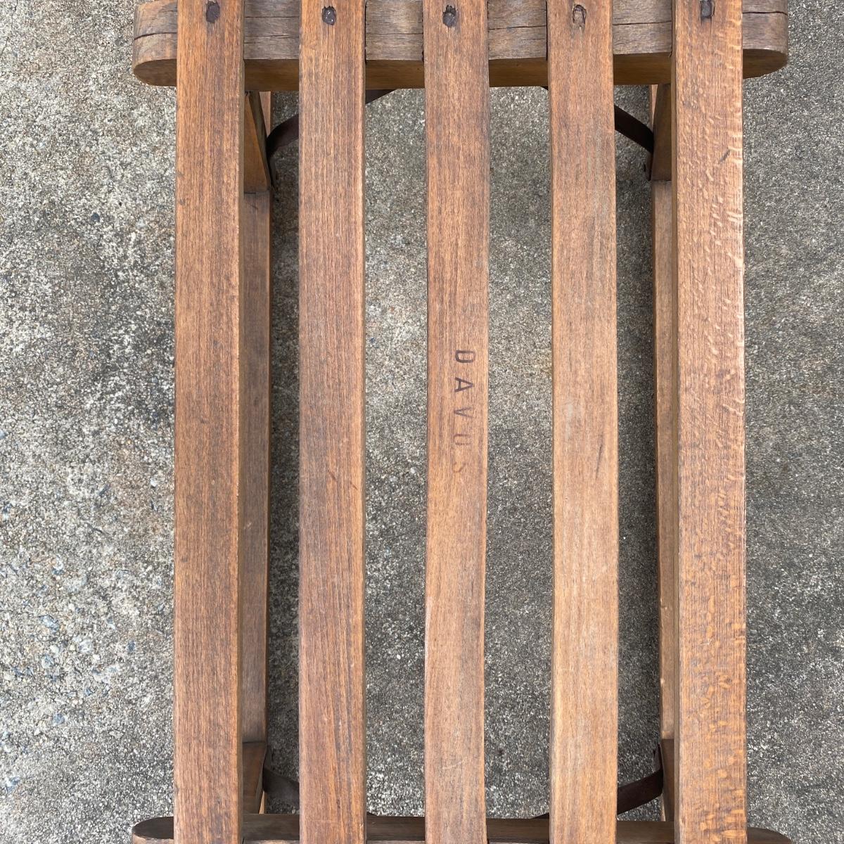 This sled is all wood with metal on the runners and metal braces underneath. In great condition. It is stamped Davos on the wood. It measures 35.5” x 11” x 9.5”. Local pick up only.