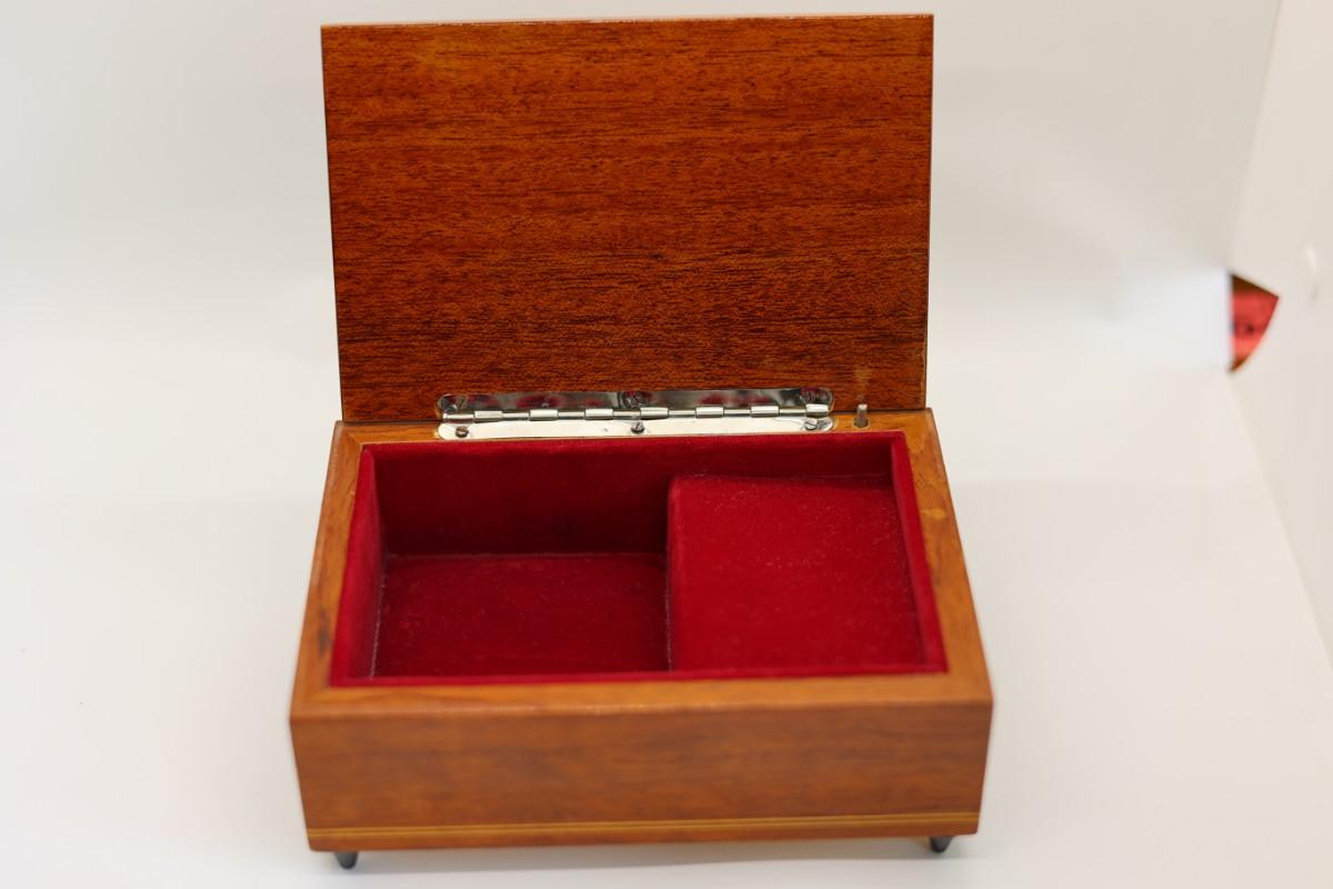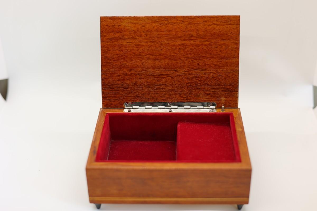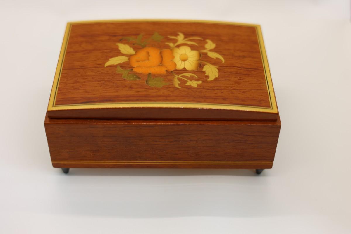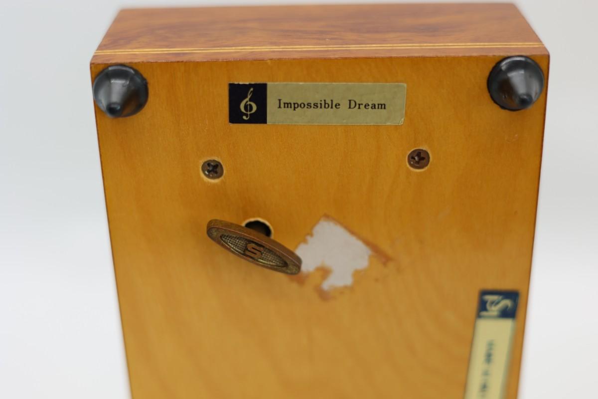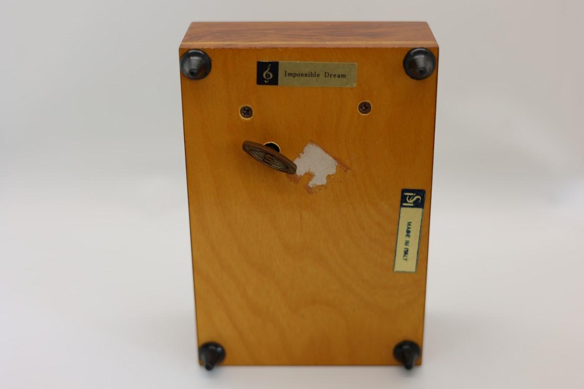 Wooden wind-up music box. Song that plays is Impossible Dream.