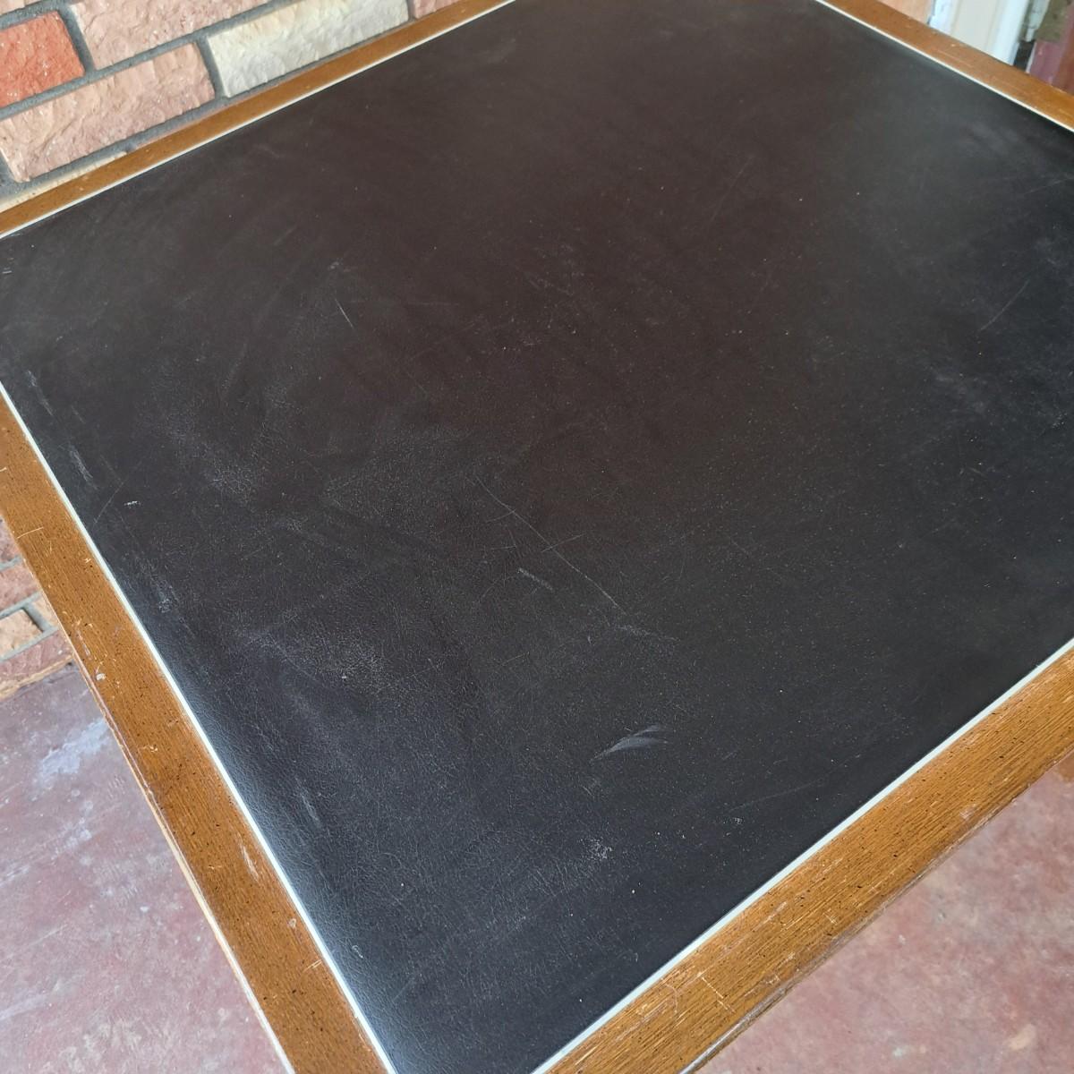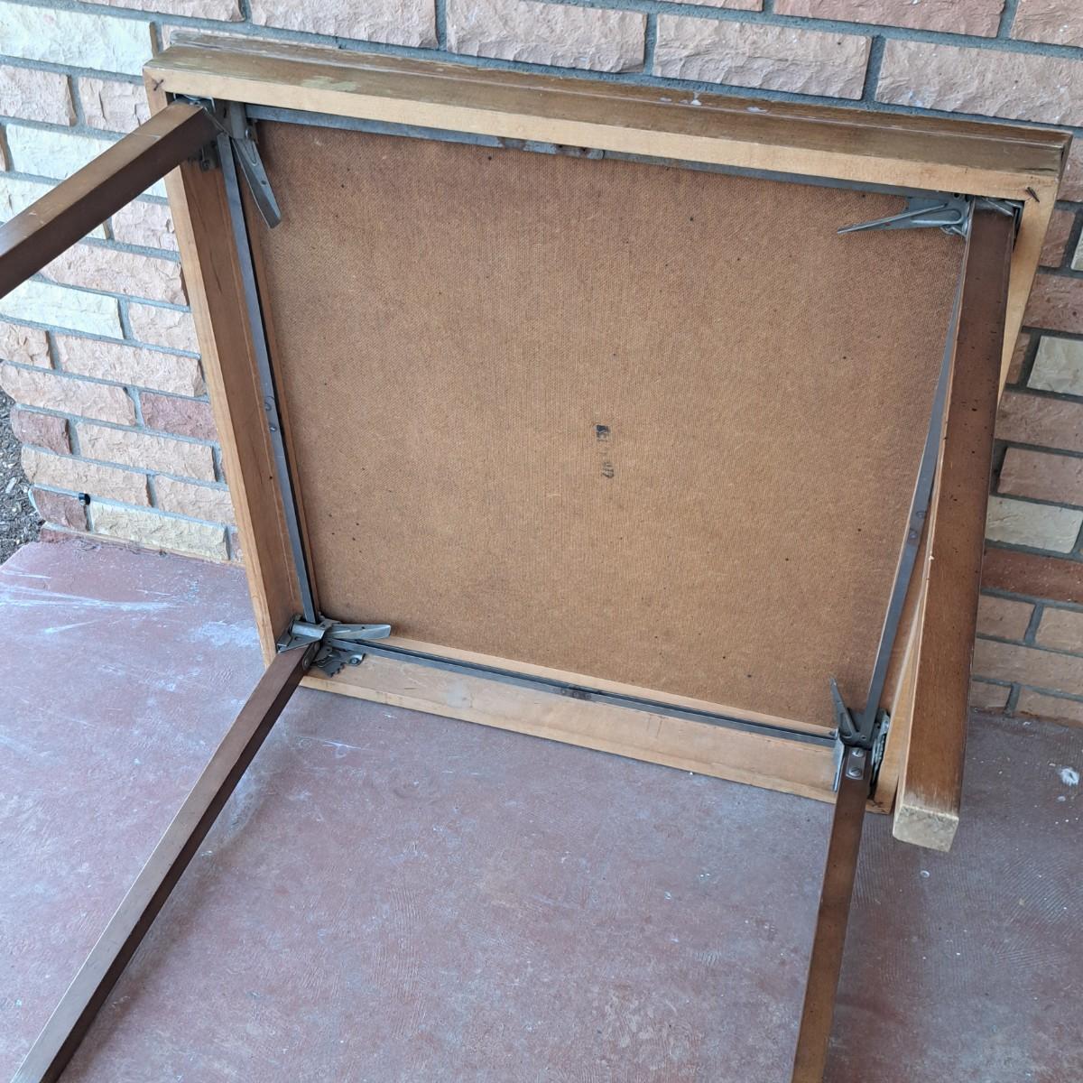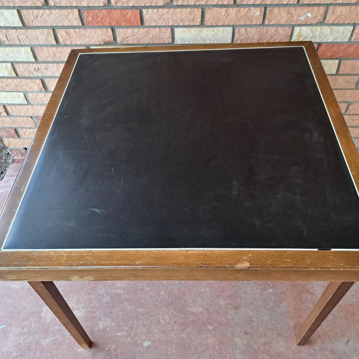 Very nice, substantial vintage card table, 32" x 32" x 27"H. Wooden frame and collapsible legs with metal toggles. It has a black naugahyde (vinyl) top. Edges of table and leg bottoms have some scuffs due to age. Easy fold up/out with a pull on one of the four metal toggles in each corner! Please see photos for details. Local pickup only.
