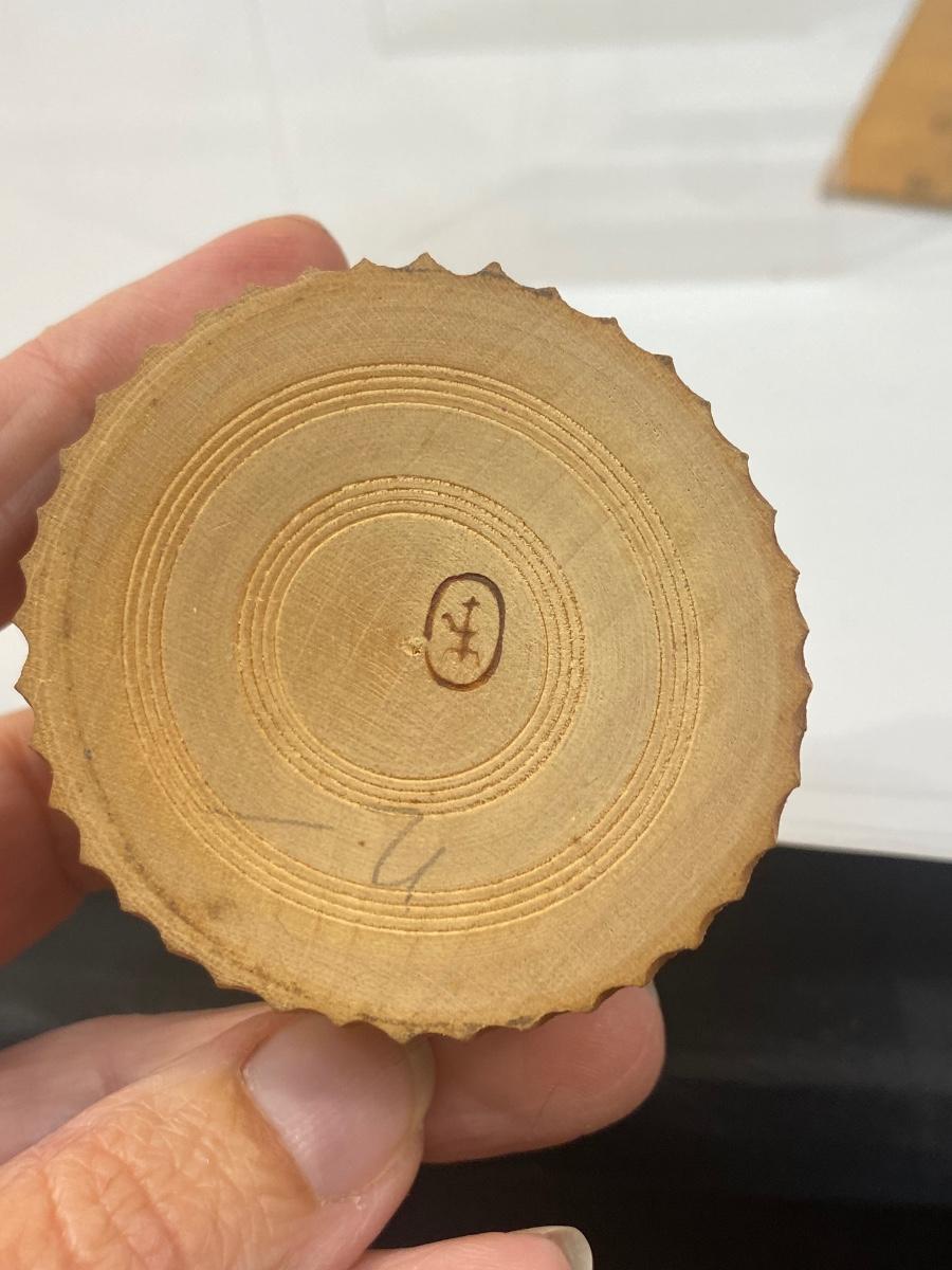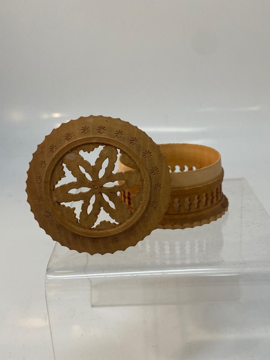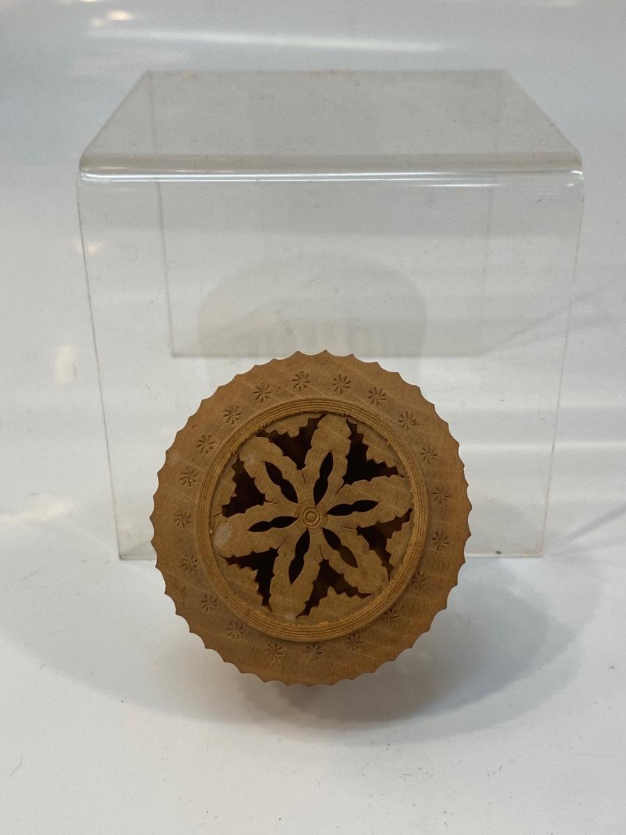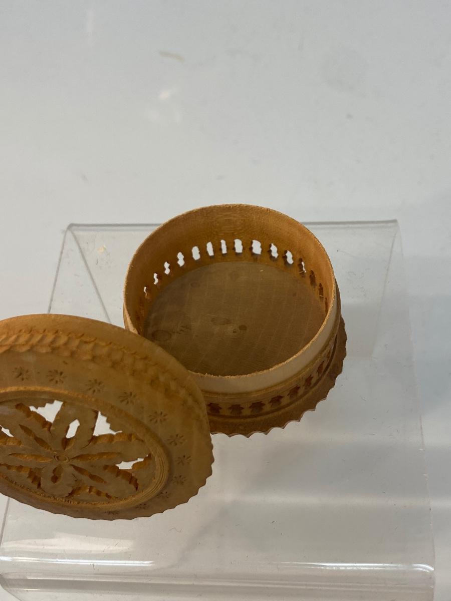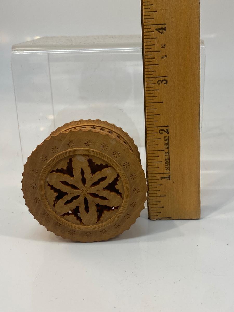 Vintage Wood Ornately Carved Round Trinket Keepsake Box. Nicely carved. Light weight wood. About 2" size. There is a maker stamp on the bottom.