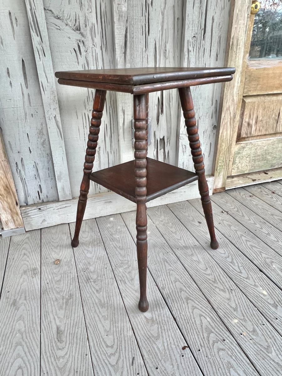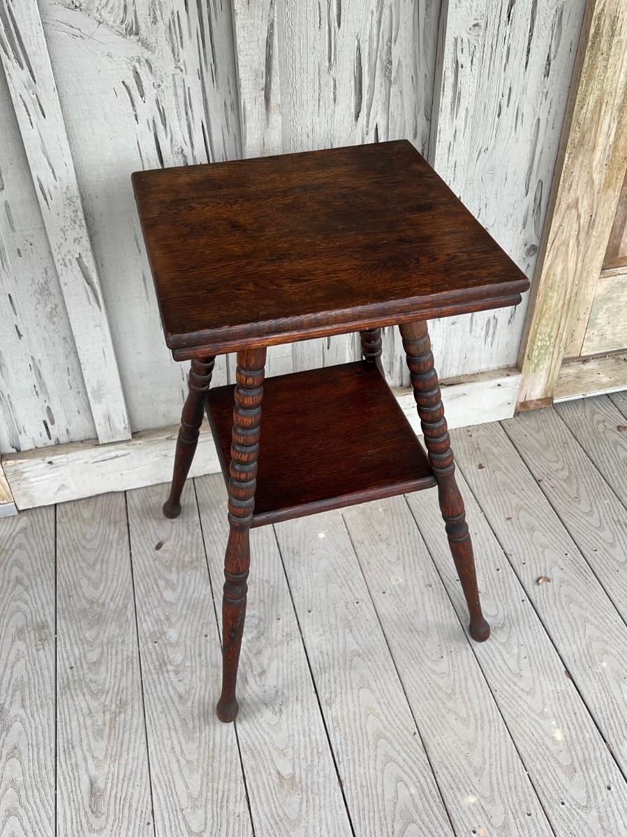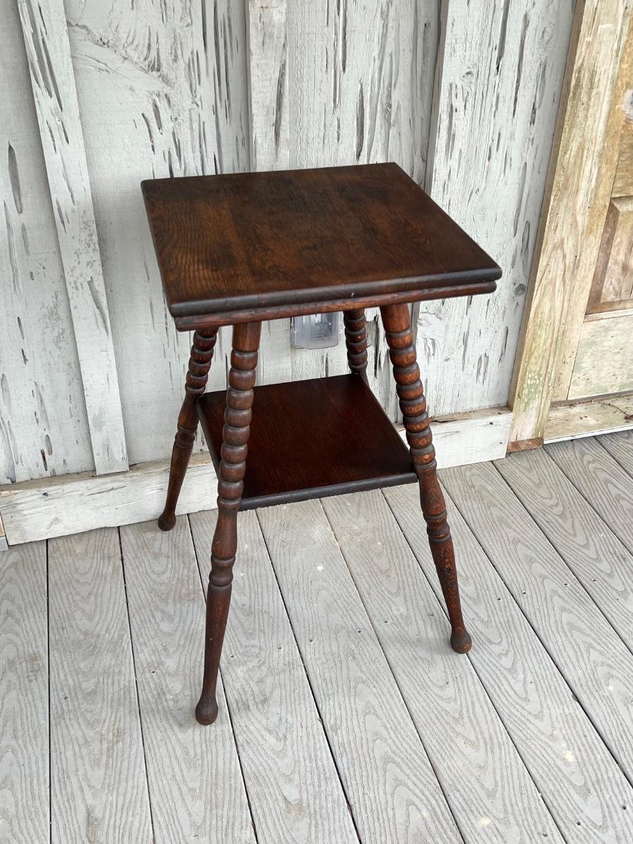 Table needs some TLC. No name brand found. There are some spots on the leg that does need some repair. See pictures. 28” H x 16” Square. 14” H to second shelf & 12” Square.